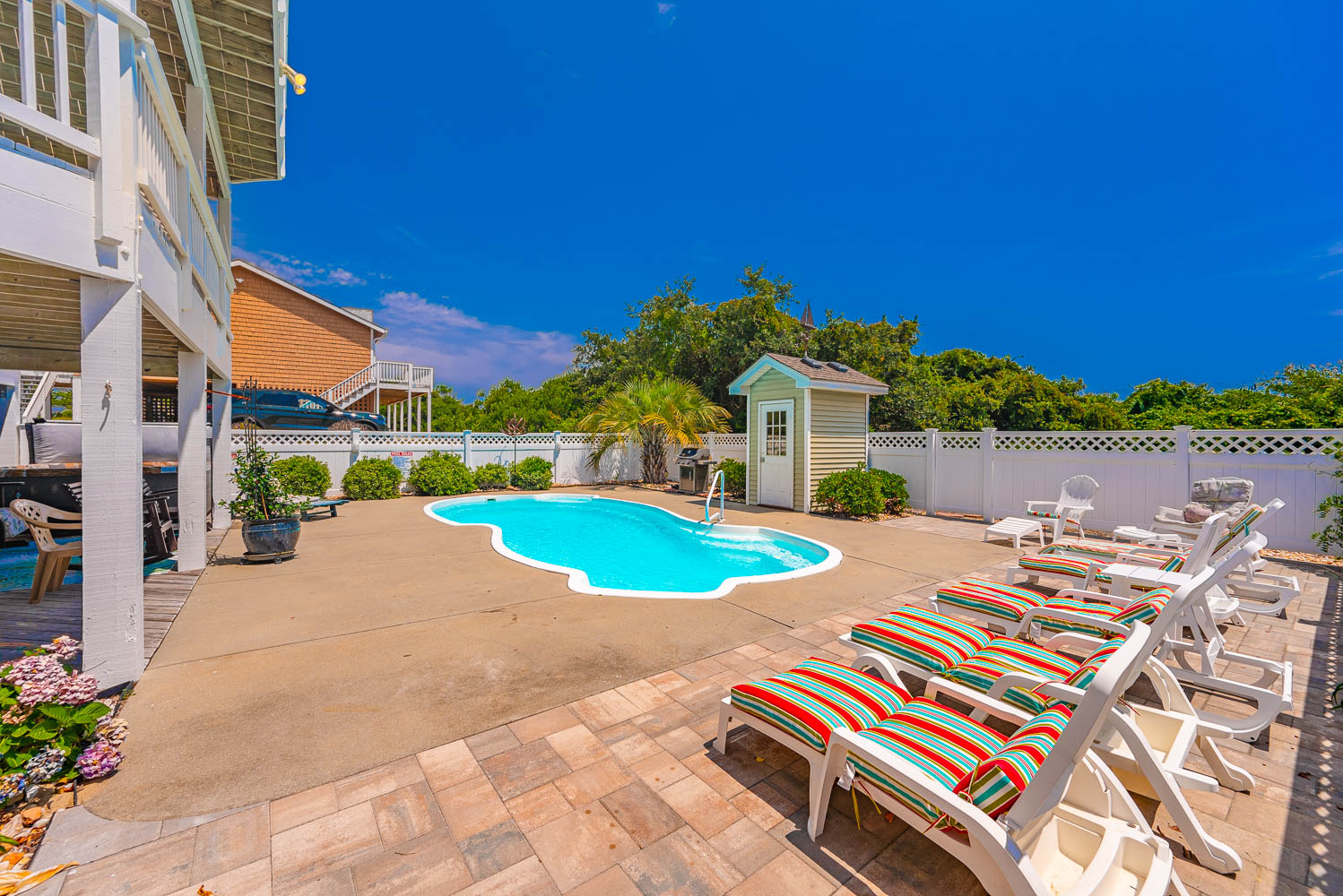 Ground Level: Parking for 5 Cars, Covered Entry, Bedroom w/Duo Bunk, Game Room/Den, Pool Table, Wet Bar, Full Size Refrigerator, Wine Cooler, TV, Full Bath, Access to Patio Area w/Hot Tub, Private 14x30 Swimming Pool - Open Seasonally , and Enclosed Outside Shower.