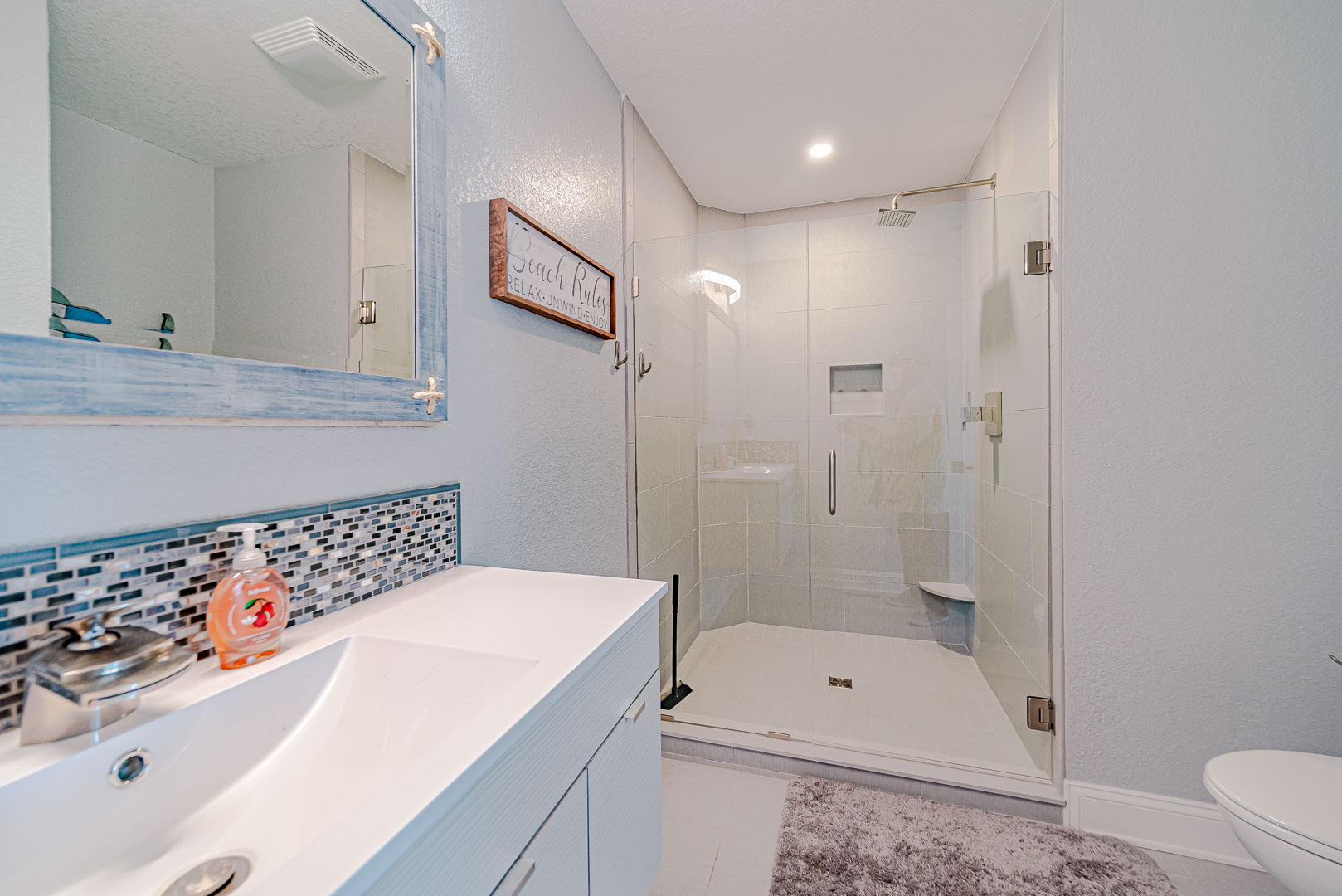 Mid Level: 4 Bedrooms (Private Ocean Facing Suite w/Queen, TV, Full Bath w/Tiled Shower, Covered Deck, Ocean Views; Private Suite w/King, TV, Full Bath w/Tiled Shower; 1 w/King, TV; 1 w/Queen, Covered Deck); Shared Full Bath w/Tub/Shower), Laundry Area; Covered Porch, and Ocean Views.