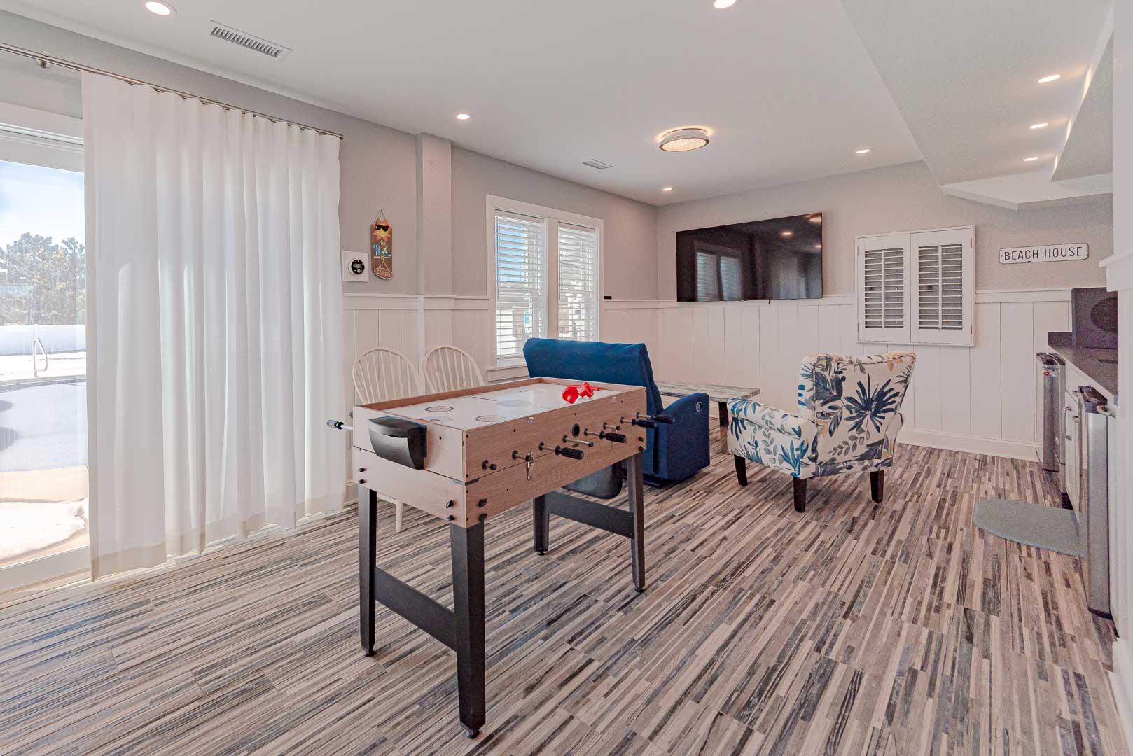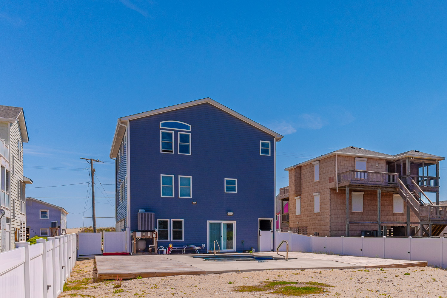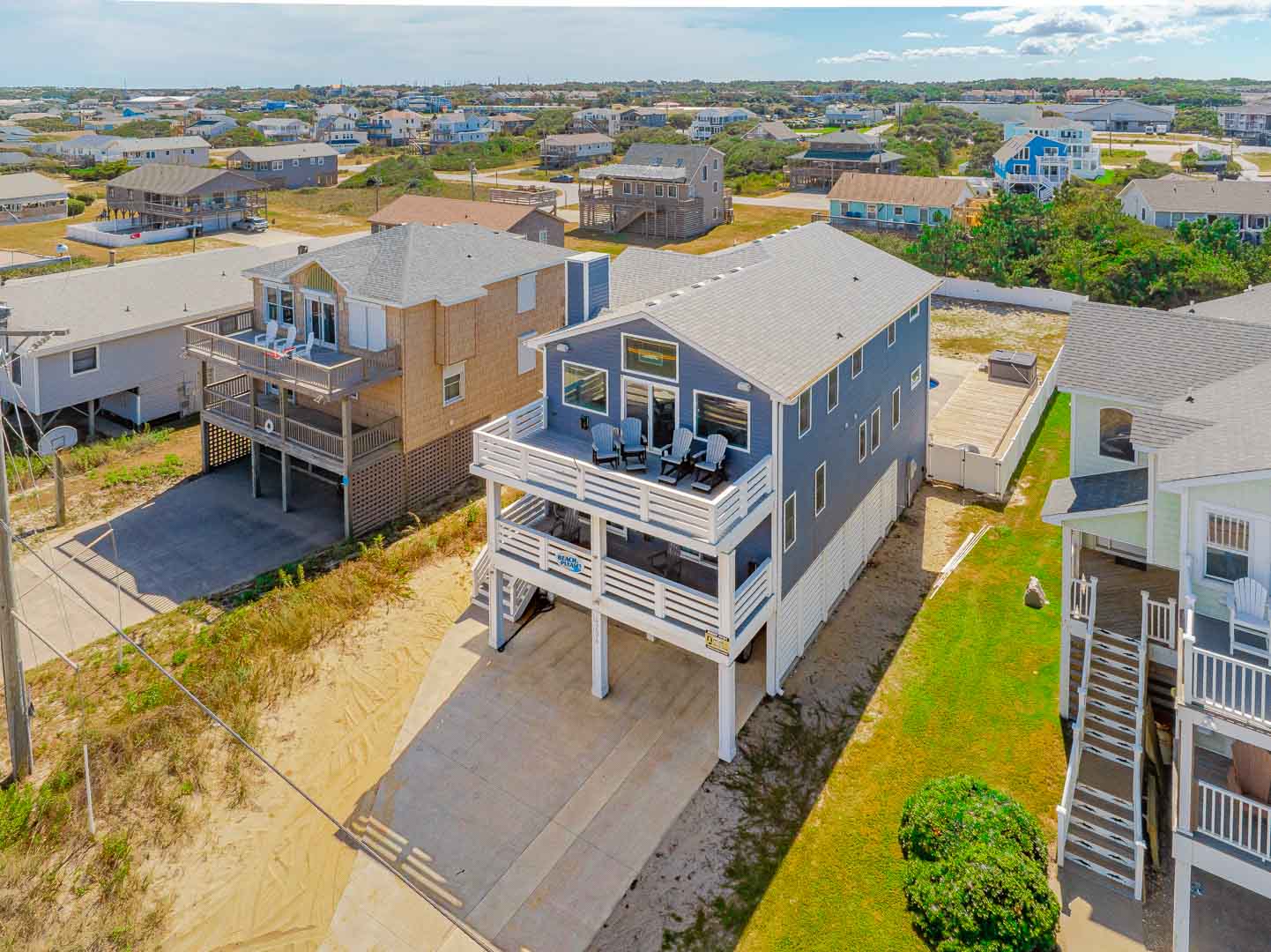 Ground Level: Parking for 5 Vehicles, 220 amp Power for EV Charging (Charger Not Provided), Carport, Elevator, Den w/TV, Wet Bar, Ice Maker, Two Mini-Refrigerators, Full Enclosed Outside Bath w/Shower, Outside Shower, Private Swimming Pool - (Open Seasonally, Can Be Heated for $300 Plus Tax, Per Week), and Direct Access Private Oceanfront Dune Deck and Steps to Beach.