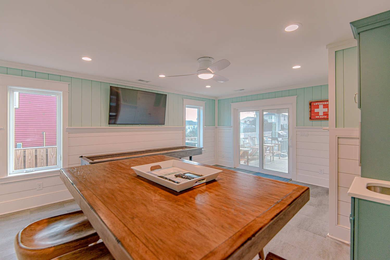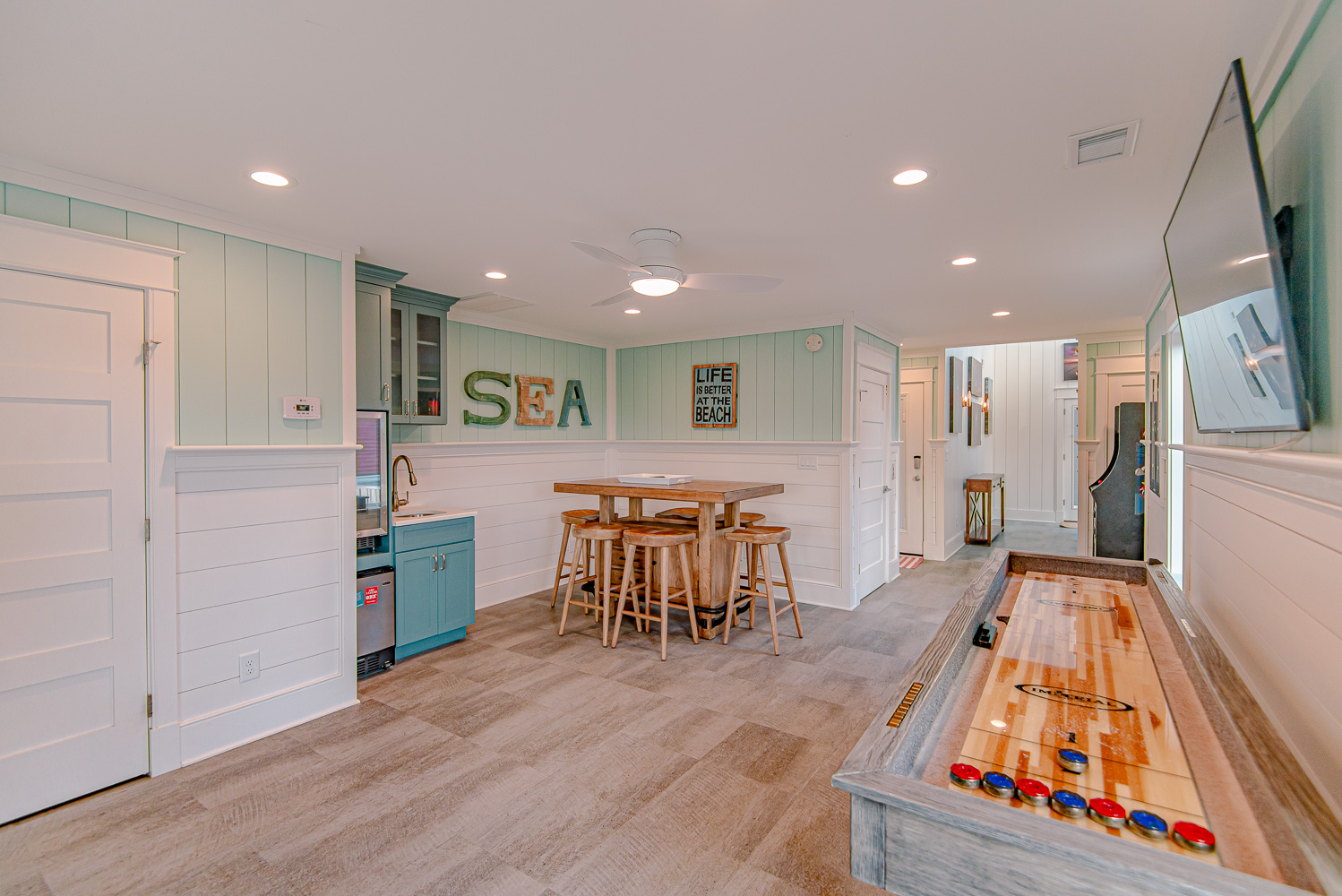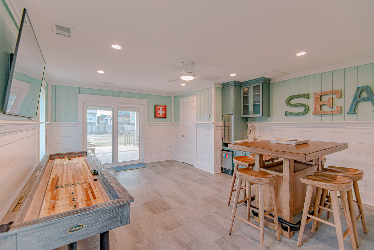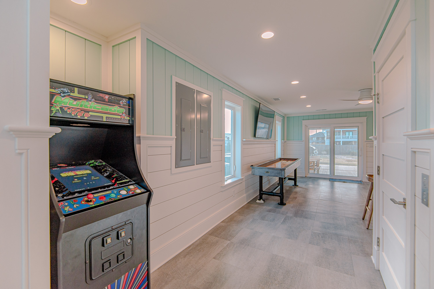 Level One: Rec. Room w/60-Game Arcade Machine, Shuffleboard Table, Ice Maker & Beverage Refrigerator, TV, Elevator, Half Bath, Access to Patio Area w/TV, Table & Chairs, Overlooking Private Swimming Pool.