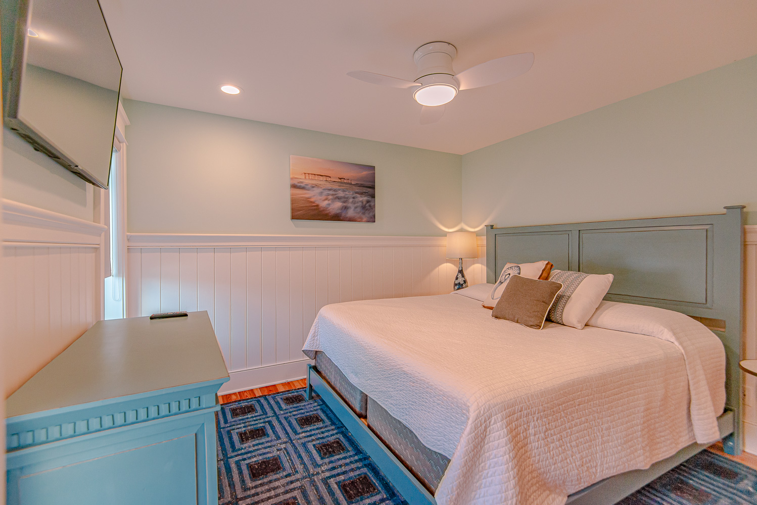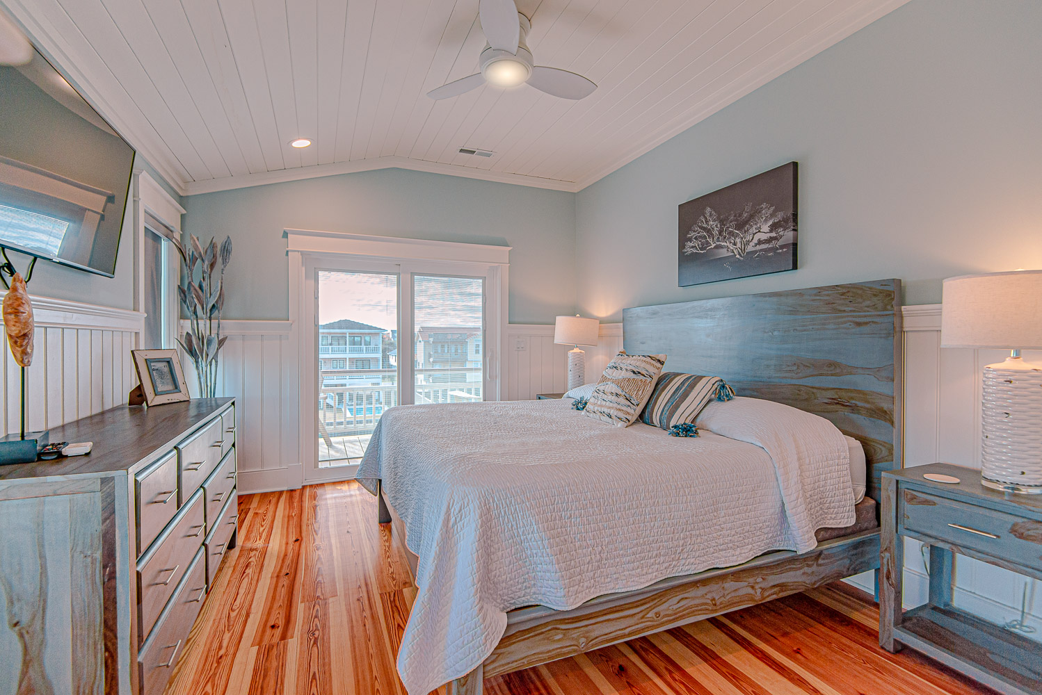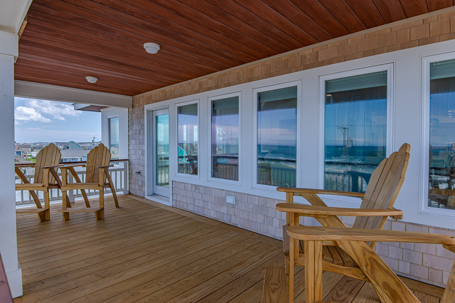 Mid Level: 5 Bedrooms (1 Private Suite w/King, TV, & Full Bath, 1 w/King & TV, Shared Full Hall Bath, 1 w/King & TV, 1 w/Queen, Shared Full Bath, 1 w/Bunk Set & TV), Ocean Views, Laundry Area, Front Covered Deck, & Back Covered Deck Overlooking Pool Area.