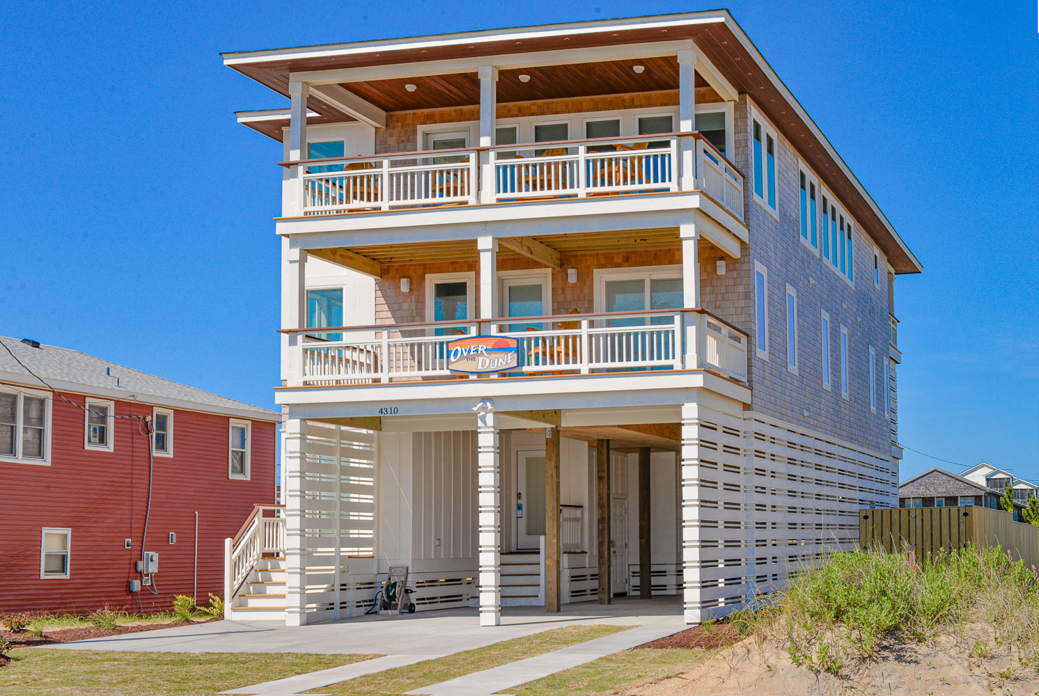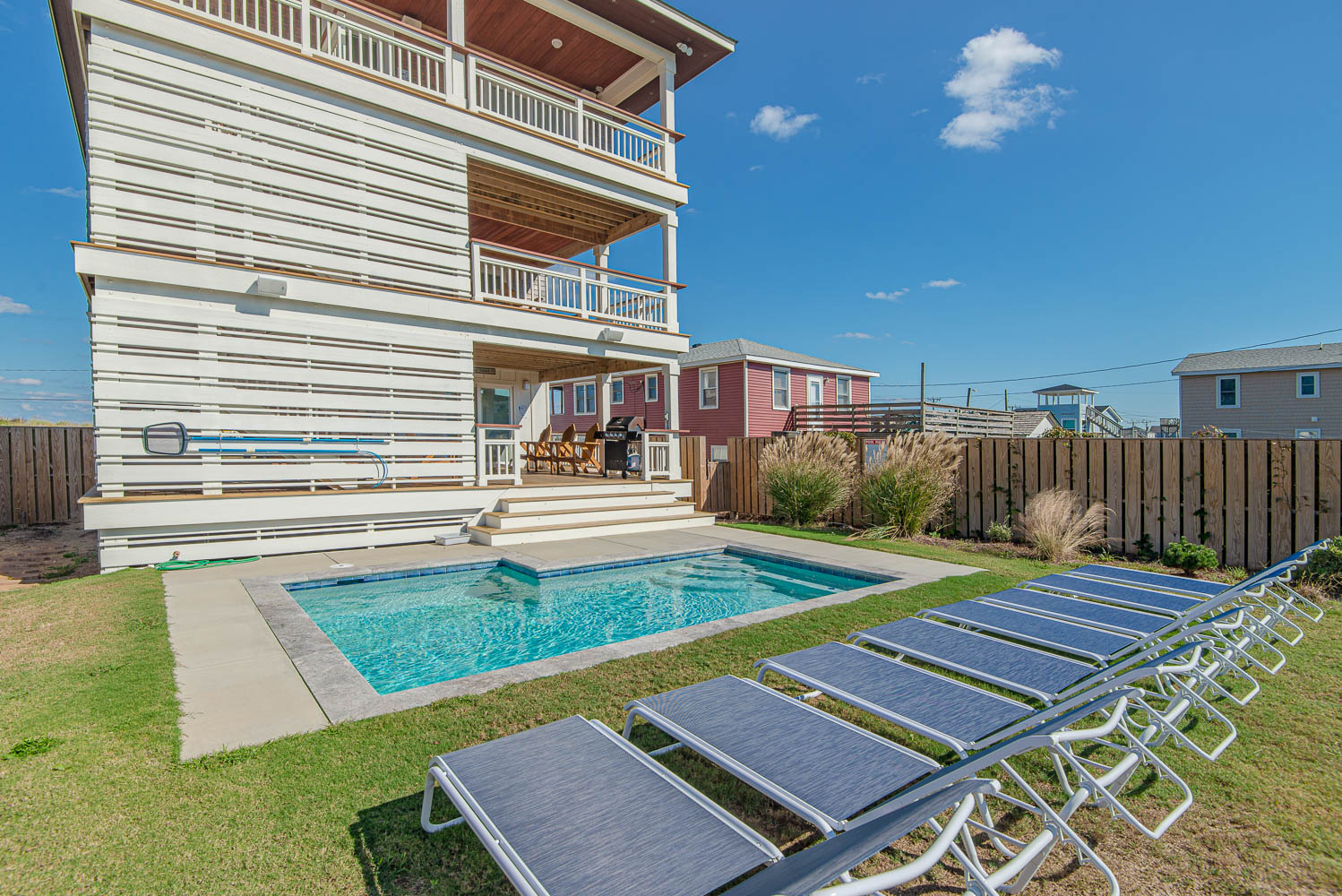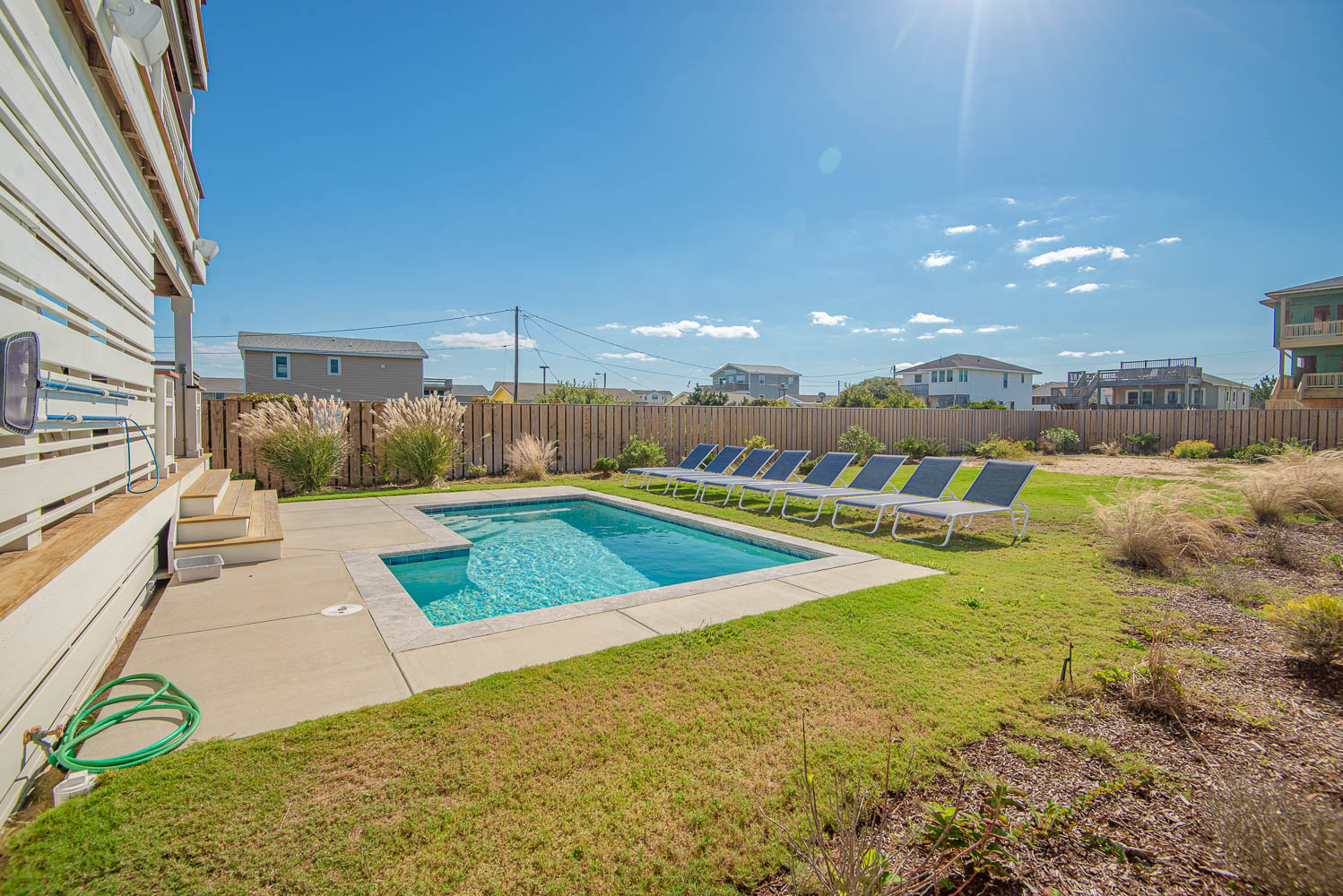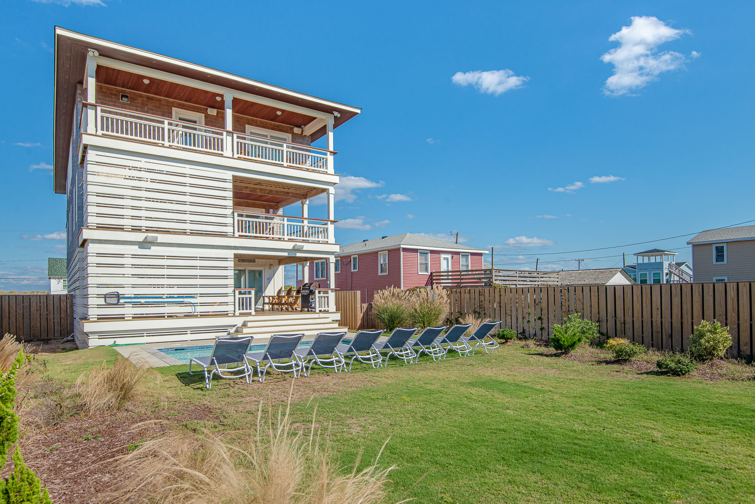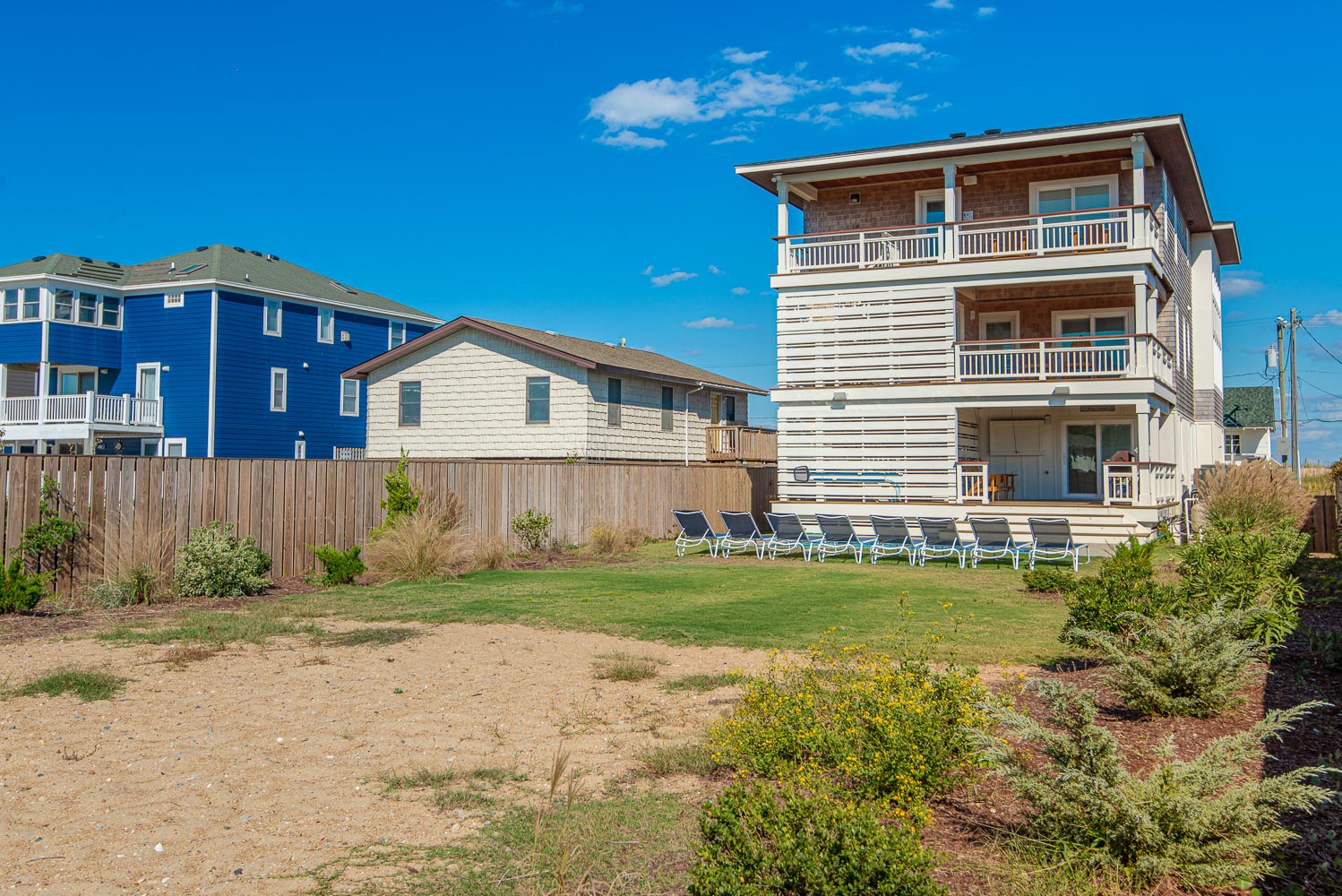 Ground Level: Parking for 5 Cars, Steps to Covered Entry, Enclosed Outside Shower w/Dressing Area, Fenced-In Back Yard w/Private Heated Swimming Pool - (Open Seasonally - Can Be Heated for $400.00 Per Week, Plus Tax - Please Bear in Mind That Pool Temperature is Subject to Outside Temperatures & Conditions), Outdoor Bluetooth Speakers, Corn Hole Boards, Horse Shoe Area, & Beach Access Across Beach Road.