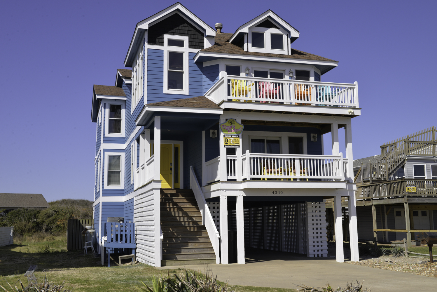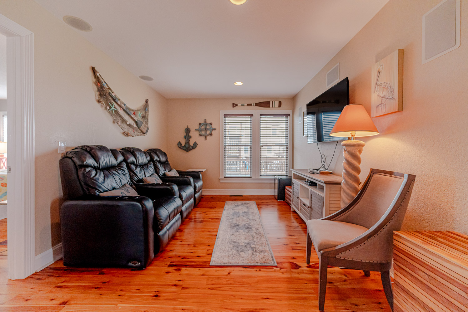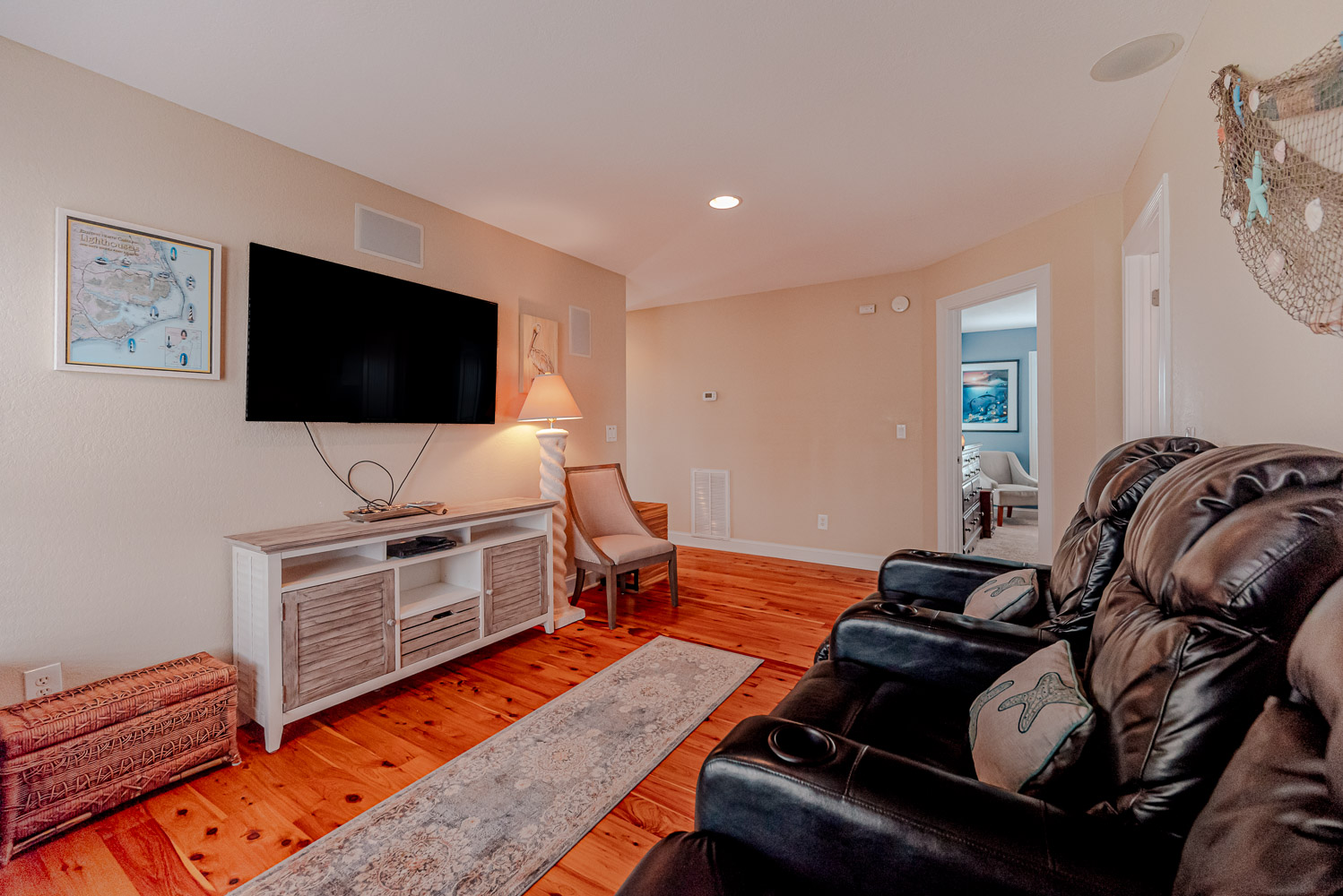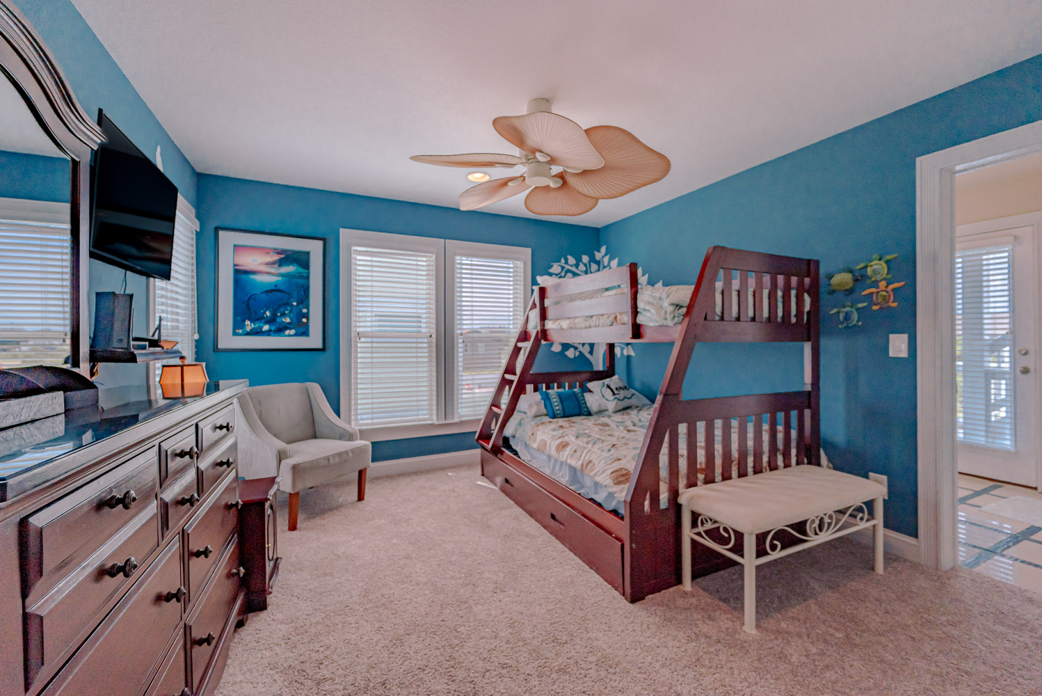 Mid Level: 3 Bedrooms (Private Suite w/King, TV, Full Bath w/Walk-In Shower, Access to Covered Deck w/Ocean Views and Deck Furniture; 1 w/Queen, TV; 1 w/Duo Bunk w/Trundle, TV), Full Hall Bath w/Tub/Shower, Den w/Theater Seating, Large Flat Panel TV, Back Covered Deck w/Hot Tub Overlooking Pool Area, and Ocean Facing Covered Deck w/Ocean Views and Deck Furniture.