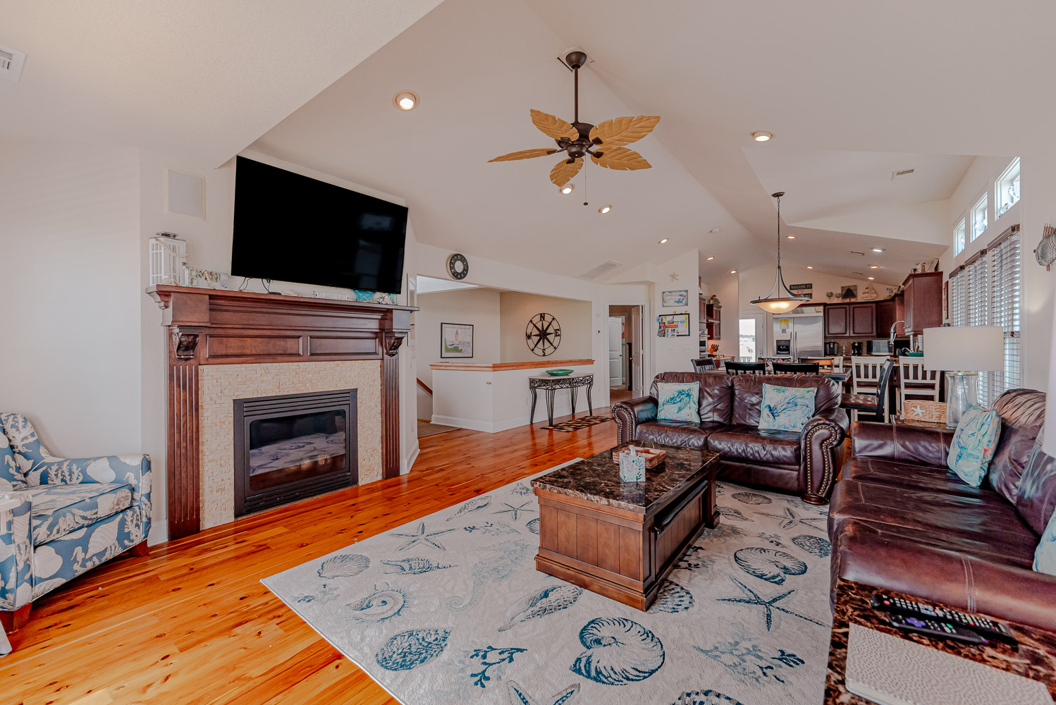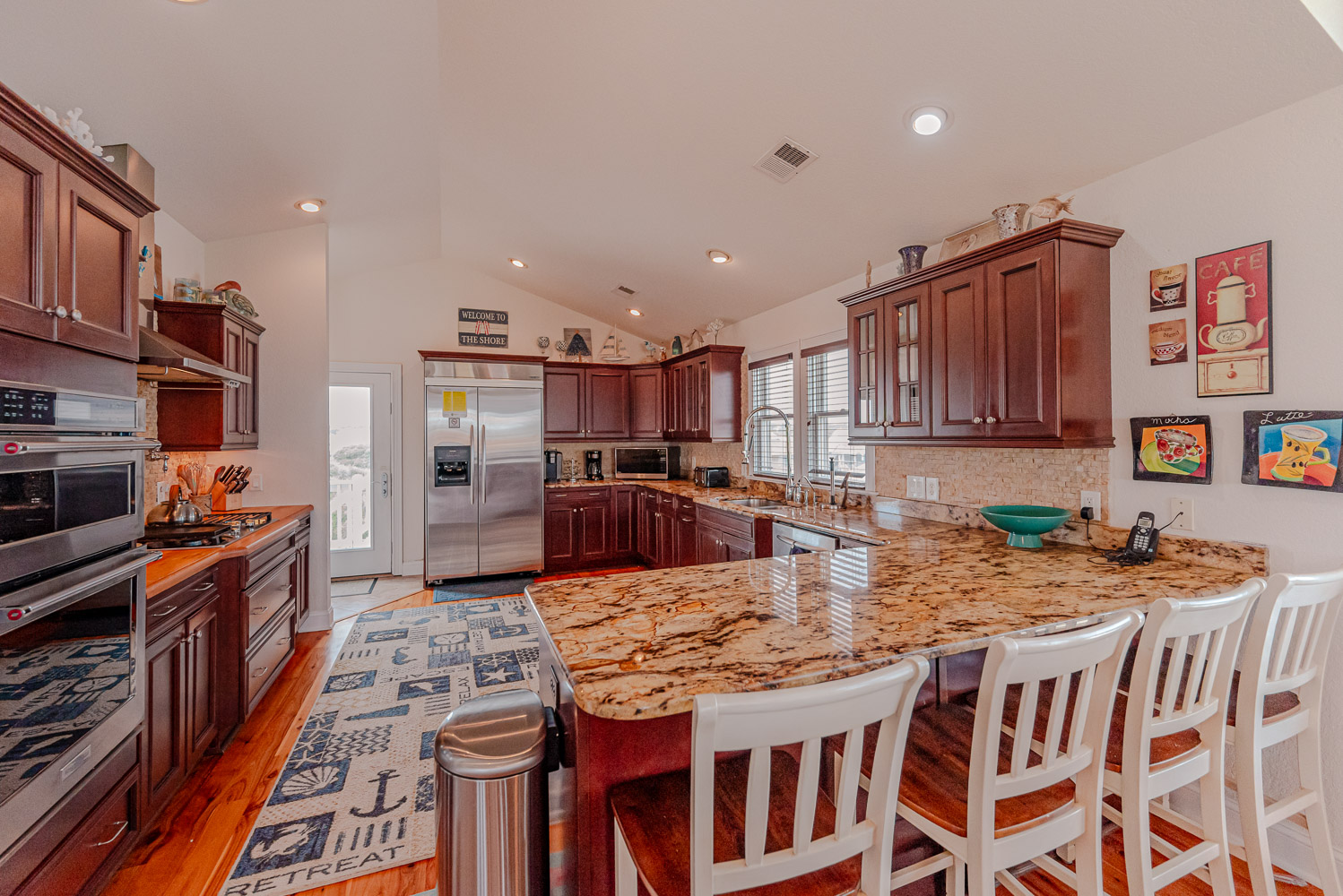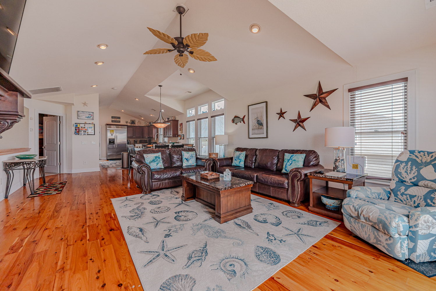 Top Level: Lovely Living Area, Large Flat Panel TV, Gas Fireplace, Beautiful Flooring Throughout, Fantastic Ocean Views, Well Stocked Kitchen is a Gourmets Dream w/Granite Counters, Stainless Steel Appliances, Gas Range, Double Wall Oven, Breakfast Bar Seating for Four (4), Dining Area w/Seating for Ten (10), Half Bath, Private Suite w/King, TV, and Full Bath w/Dual Vanity and Tiled Walk-In Shower, Steps to Ship's Watch w/Futon, Access to Ocean Facing Sun Deck w/Deck Furniture Beautiful Ocean View, Back Sun Deck Overlooking Pool Area w/Deck Furniture,.