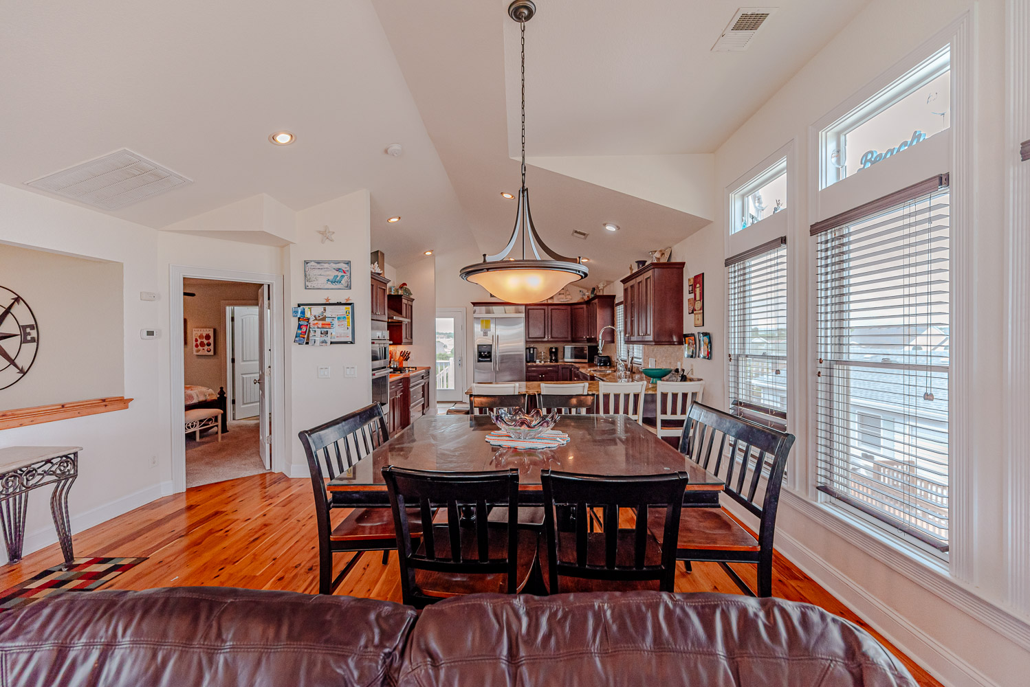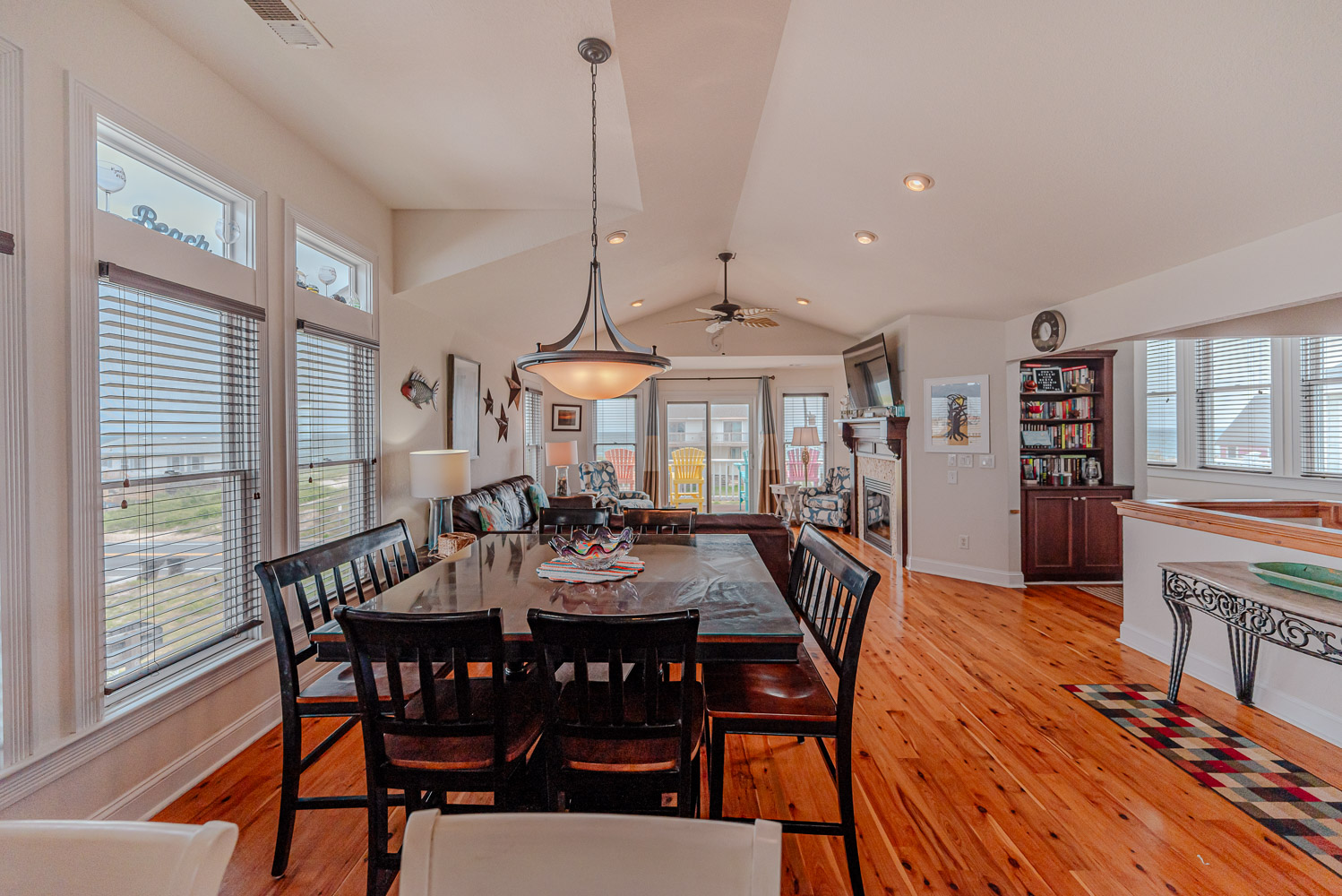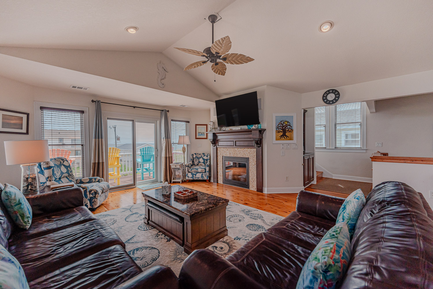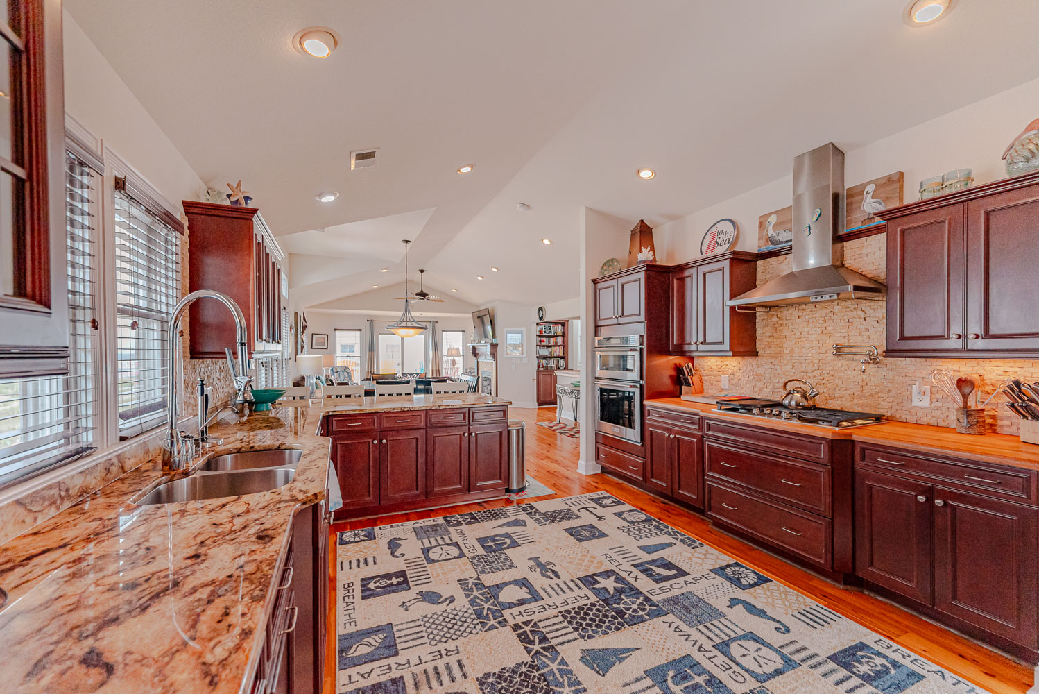 Top Level: Lovely Living Area, Large Flat Panel TV, Gas Fireplace, Beautiful Flooring Throughout, Fantastic Ocean Views, Well Stocked Kitchen is a Gourmets Dream w/Granite Counters, Stainless Steel Appliances, Gas Range, Double Wall Oven, Breakfast Bar Seating for Four (4), Dining Area w/Seating for Ten (10), Half Bath, Private Suite w/King, TV, and Full Bath w/Dual Vanity and Tiled Walk-In Shower, Steps to Ship's Watch w/Futon, Access to Ocean Facing Sun Deck w/Deck Furniture Beautiful Ocean View, Back Sun Deck Overlooking Pool Area w/Deck Furniture,.