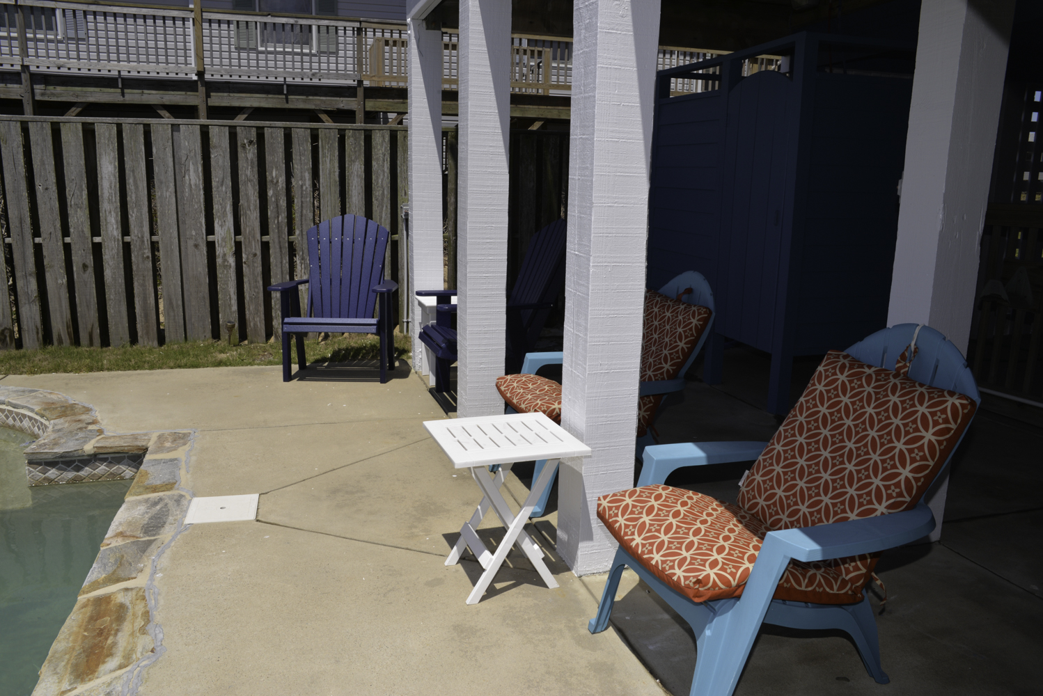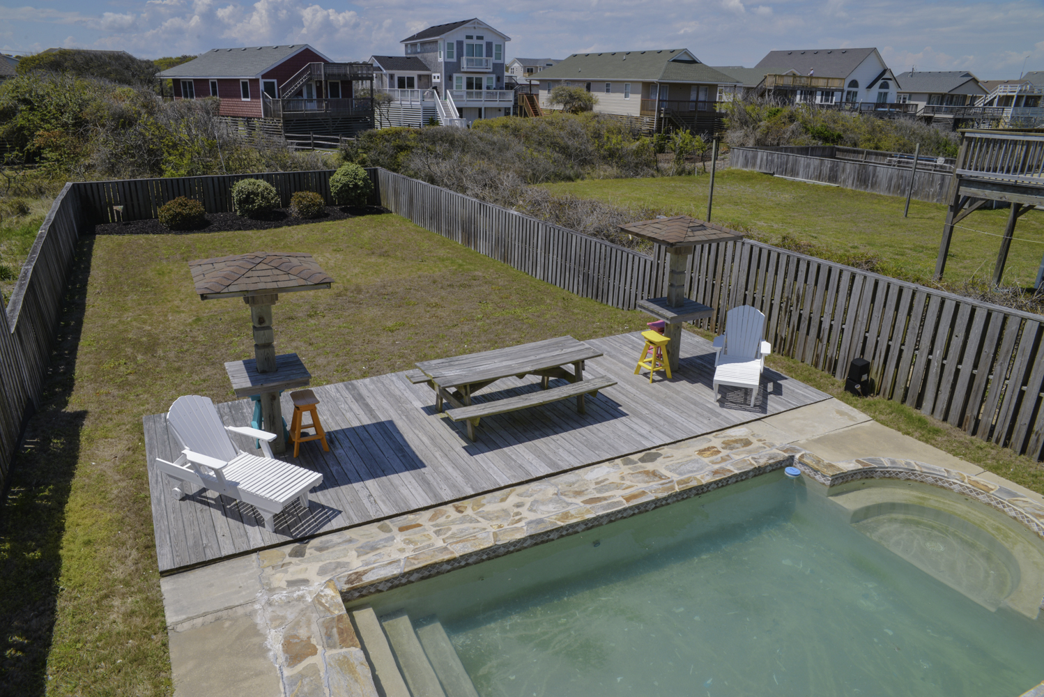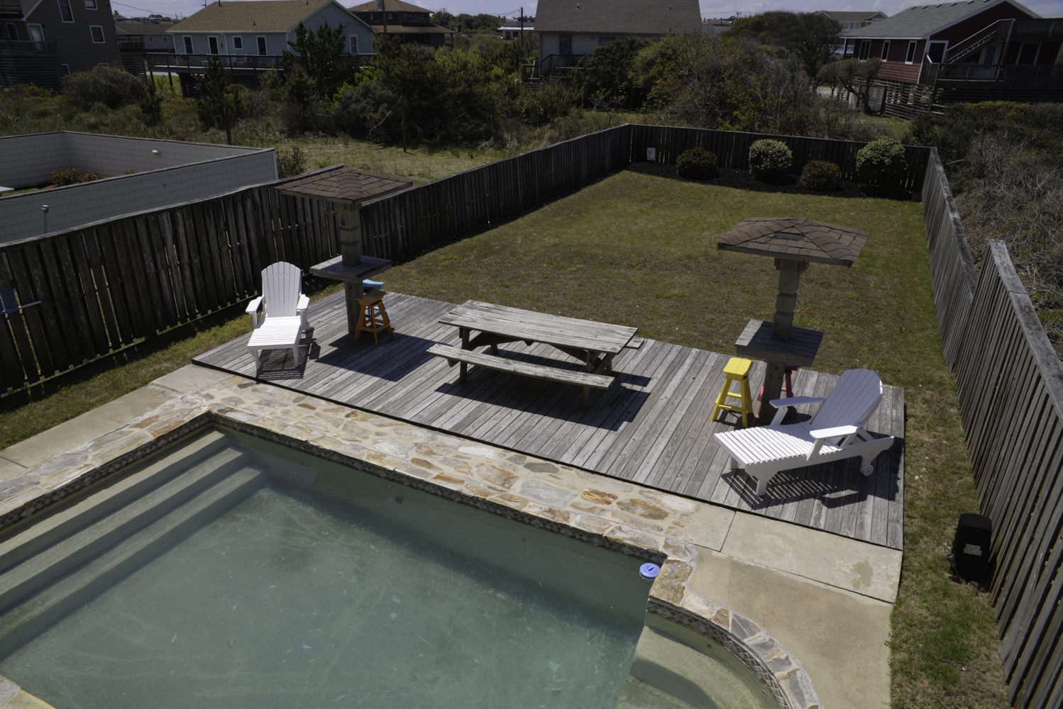Ground Level: Parking for 4 Cars, Covered Entry, Steps to Mid Level Entry, Access to Enclosed Outside Shower, Large Fenced-In Pool Patio Area, Lounge Furniture, Private 16x21 Swimming Pool - Open Seasonally, Picnic Table, and Charcoal Grill.