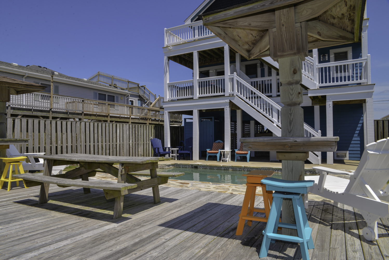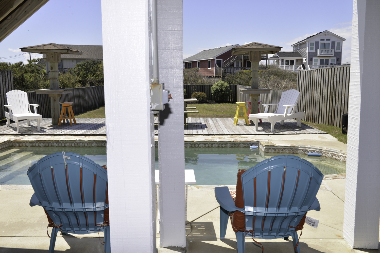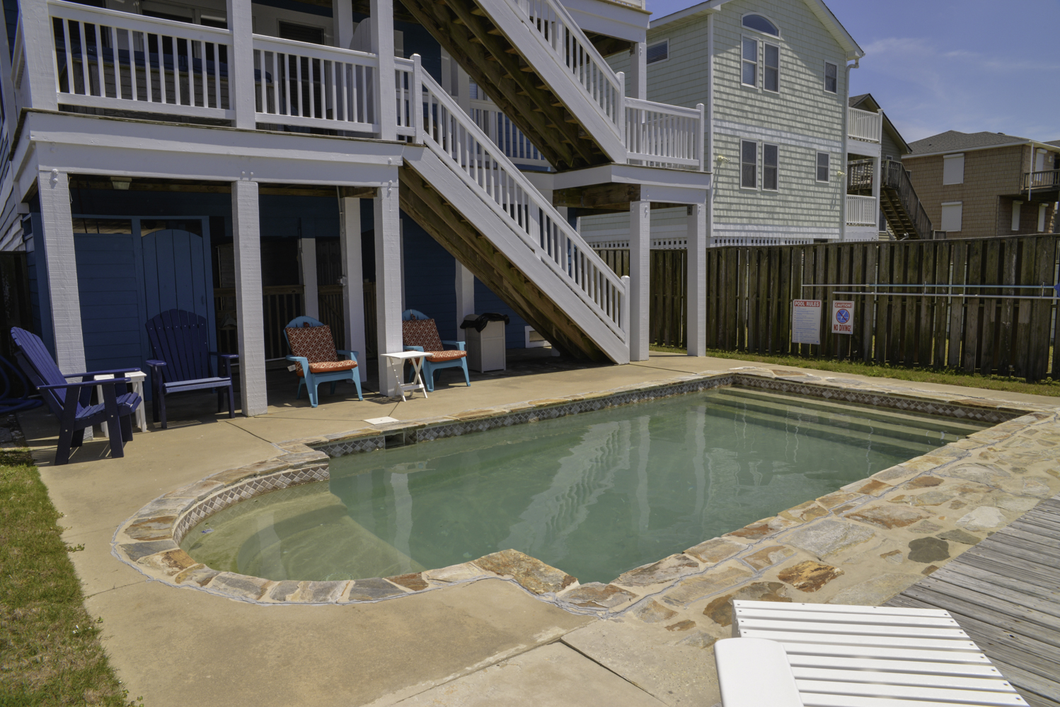 Ground Level: Parking for 4 Cars, Covered Entry, Steps to Mid Level Entry, Access to Enclosed Outside Shower, Large Fenced-In Pool Patio Area, Lounge Furniture, Private 16x21 Swimming Pool - Open Seasonally, Picnic Table, and Charcoal Grill.