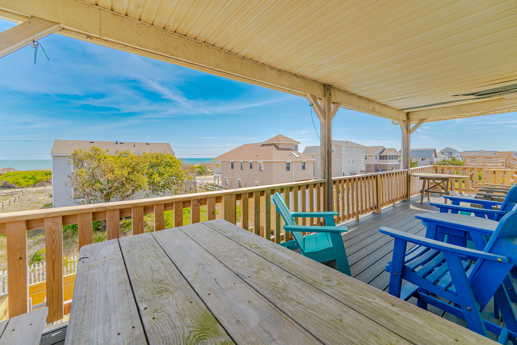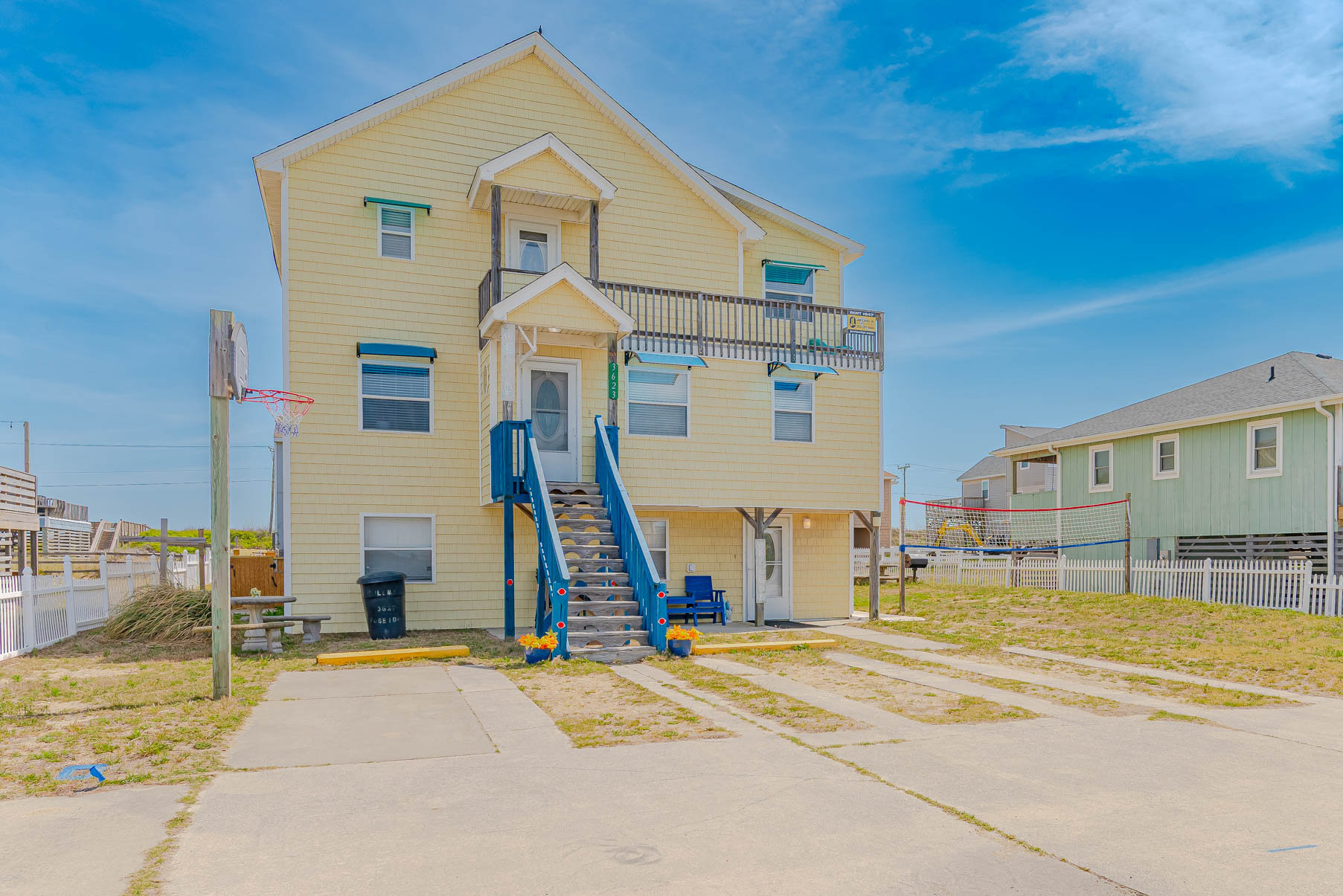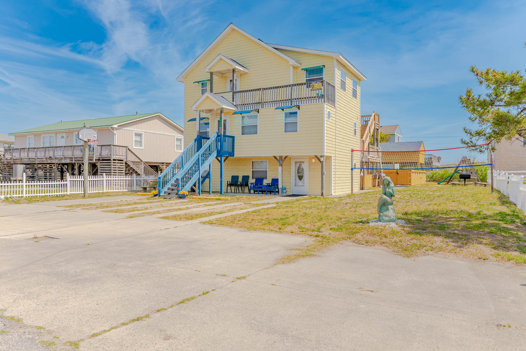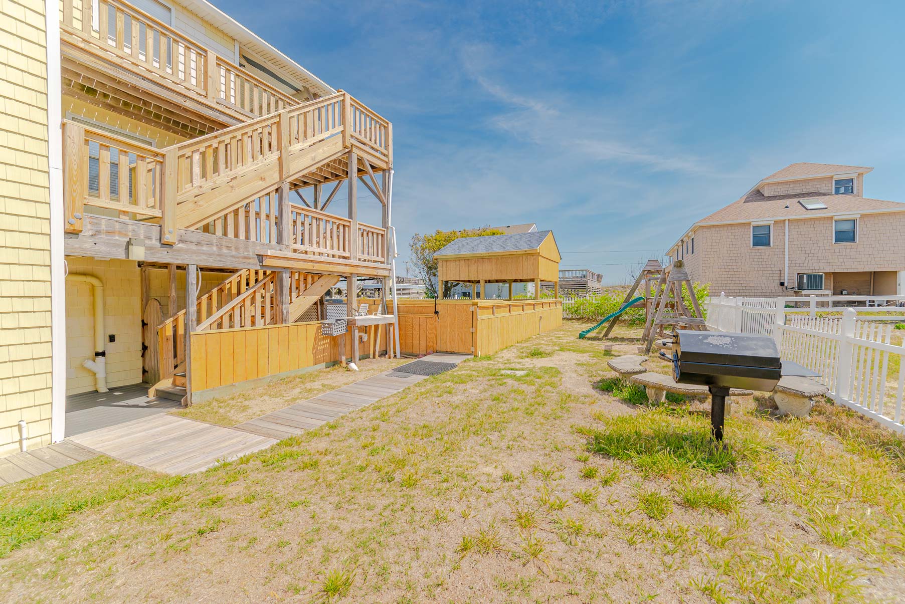 The Hideaway provides covered and open porches and a short walk to the beach (pedestrian beach access is located one house over to the north, and then a sand path to the dune crossover, approximately 300 feet across the Beach Road). For the little ones, there is a swing set, volleyball court, and the adults will appreciate the grilling area, picnic table, fish cleaning station and enclosed outside shower. Situated in the popular Kitty Hawk community, this home is convenient to several local restaurants, shopping and the Sea Scape Gold Links.