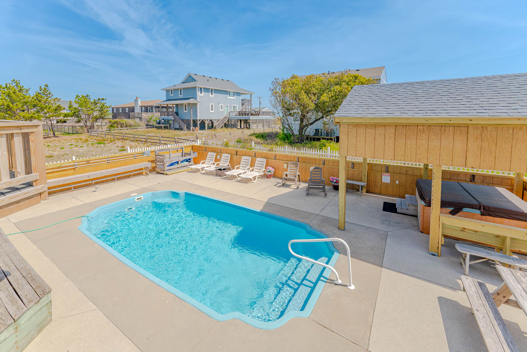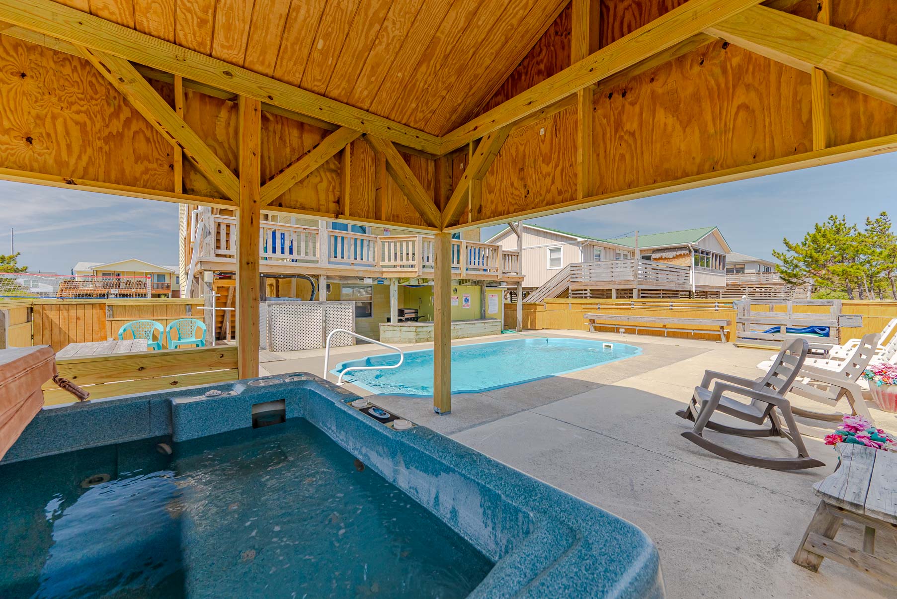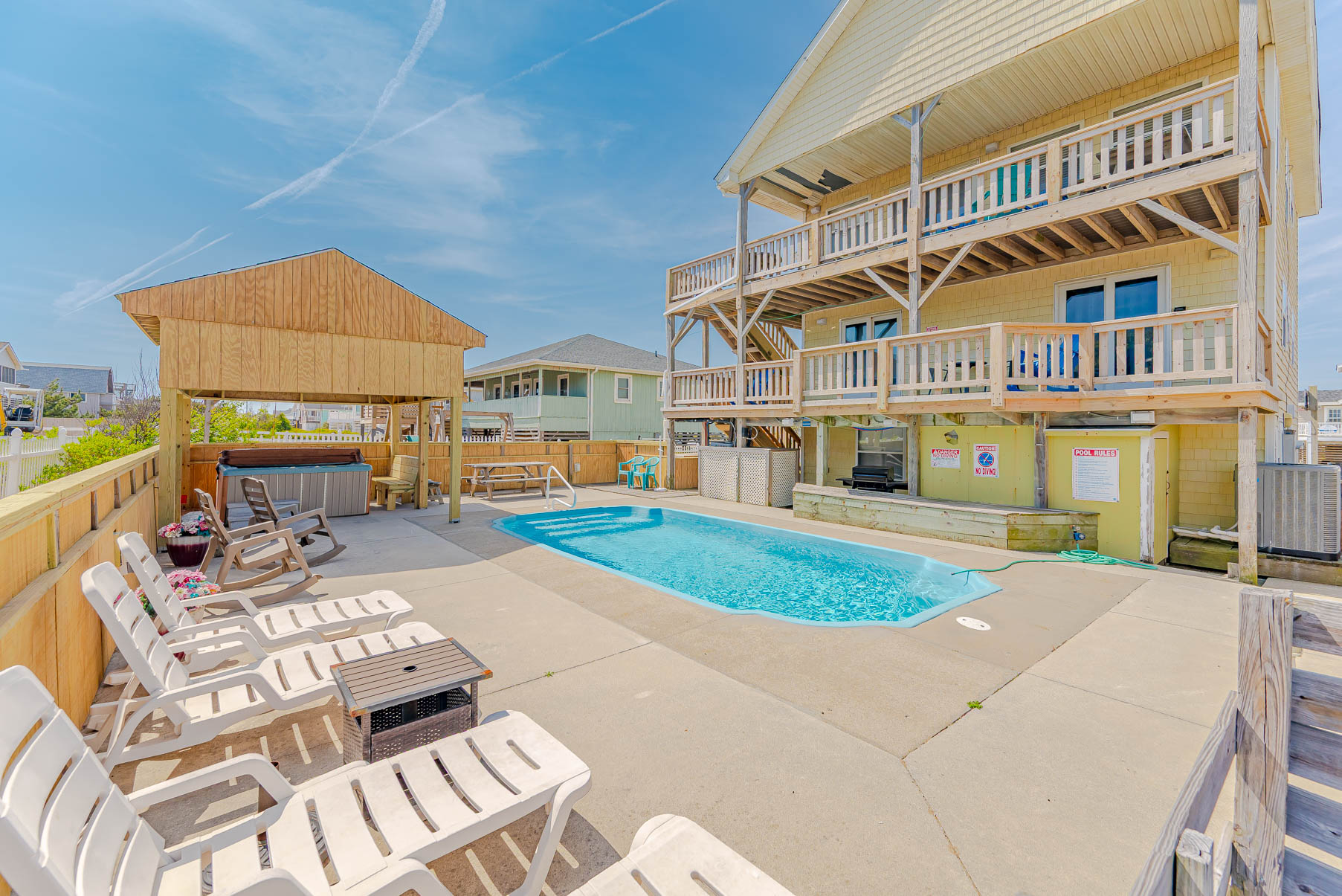 Ground Level: Ground Level: Parking for 5 Cars, Entry to Home, Large Living Room/Den, TV, Rec. Room w/Pool Table, Half Bath, Kitchenette, Microwave, Laundry w/Washer/Dryer, Full Size Refrigerator, Bedroom w/Queen, Access to Private Heated Swimming Pool (HEATED FOR FREE – March 28 - October 31). Pool Temperature is Subject to Outside Temperatures and Conditions, 6 Person Hot Tub, Lights in Yard / Pool Area for Nighttime Enjoyment, the Entire Back Yard has been Fenced for Security. Beach Access is Located One House to the North, and then a path toward Ocean.