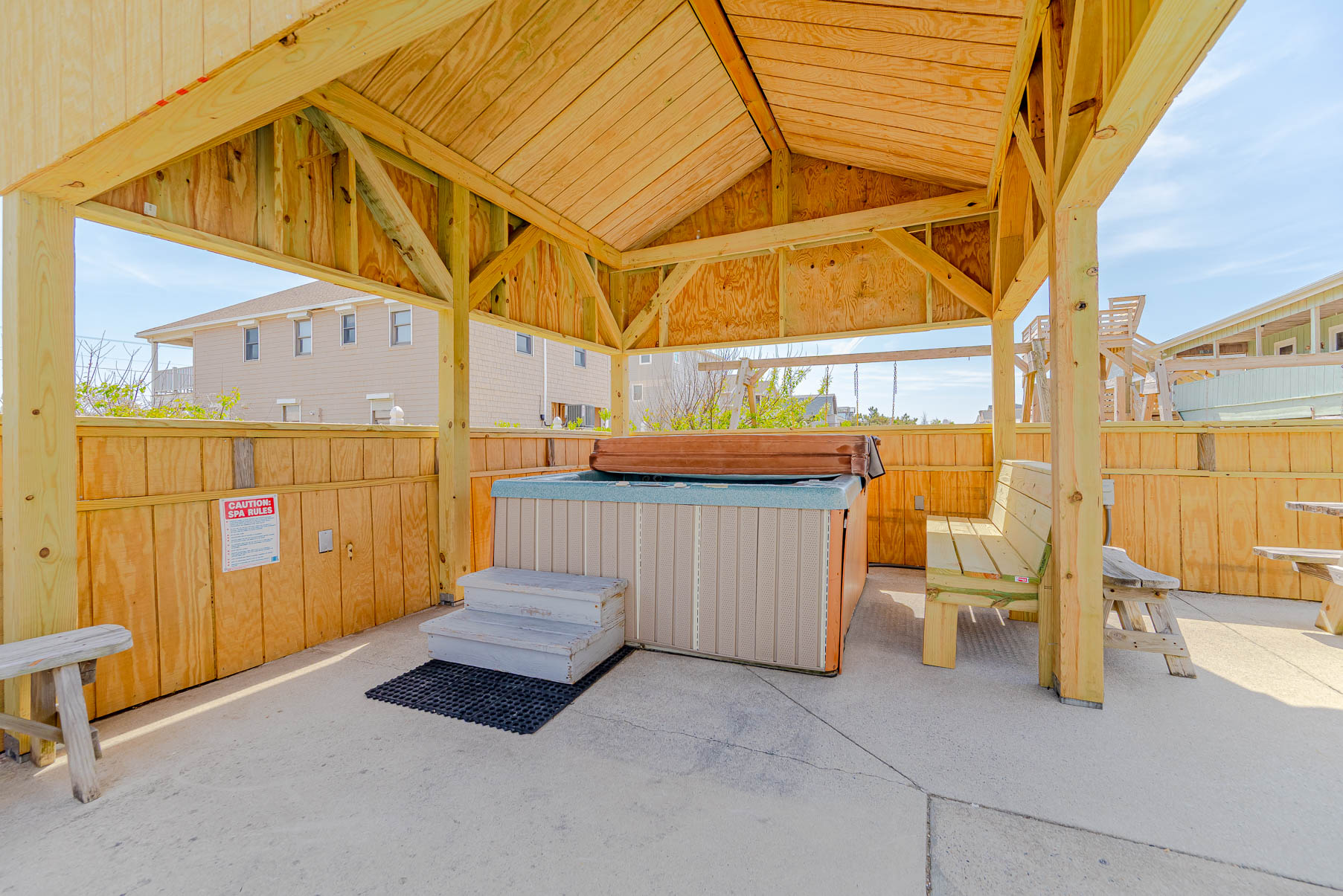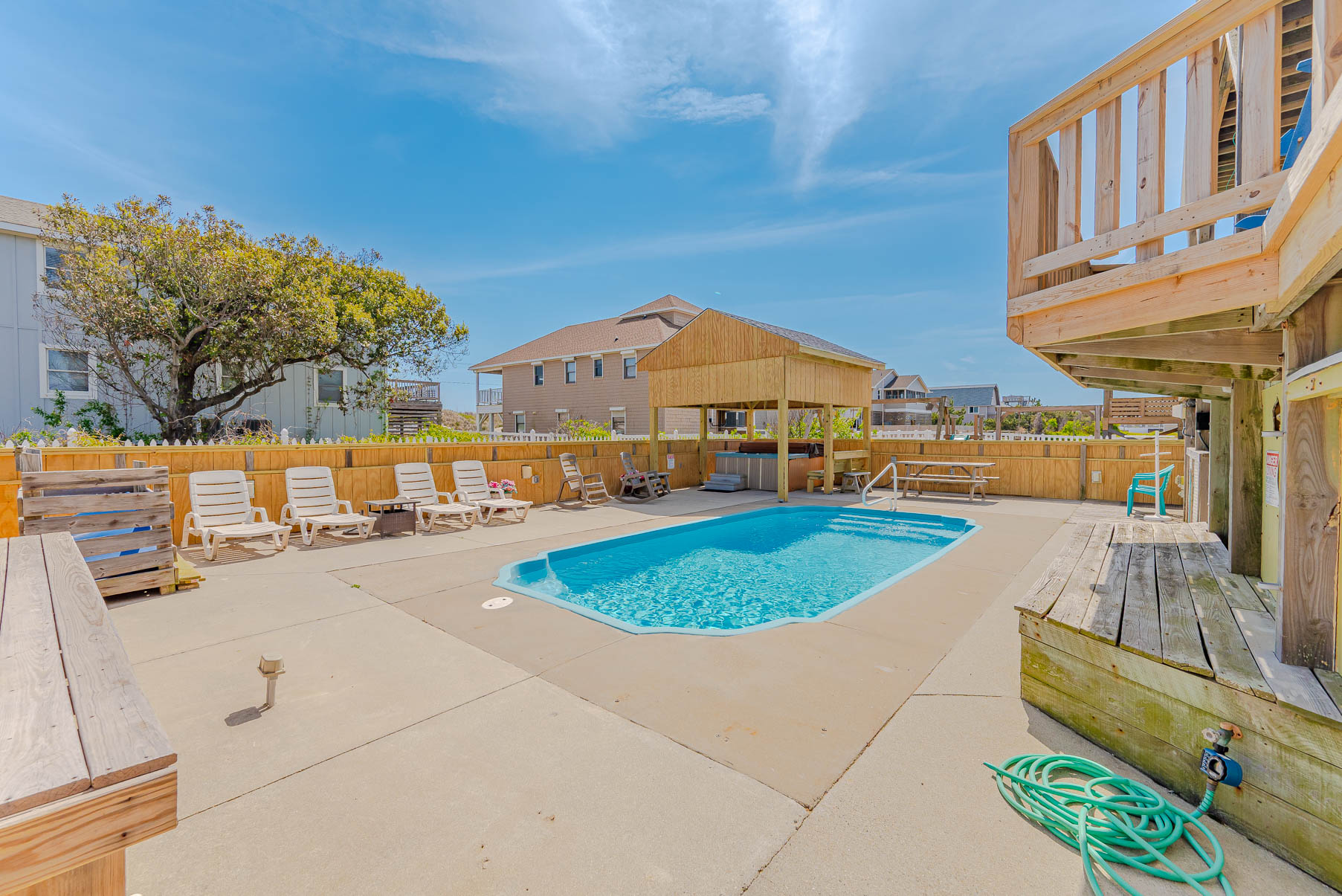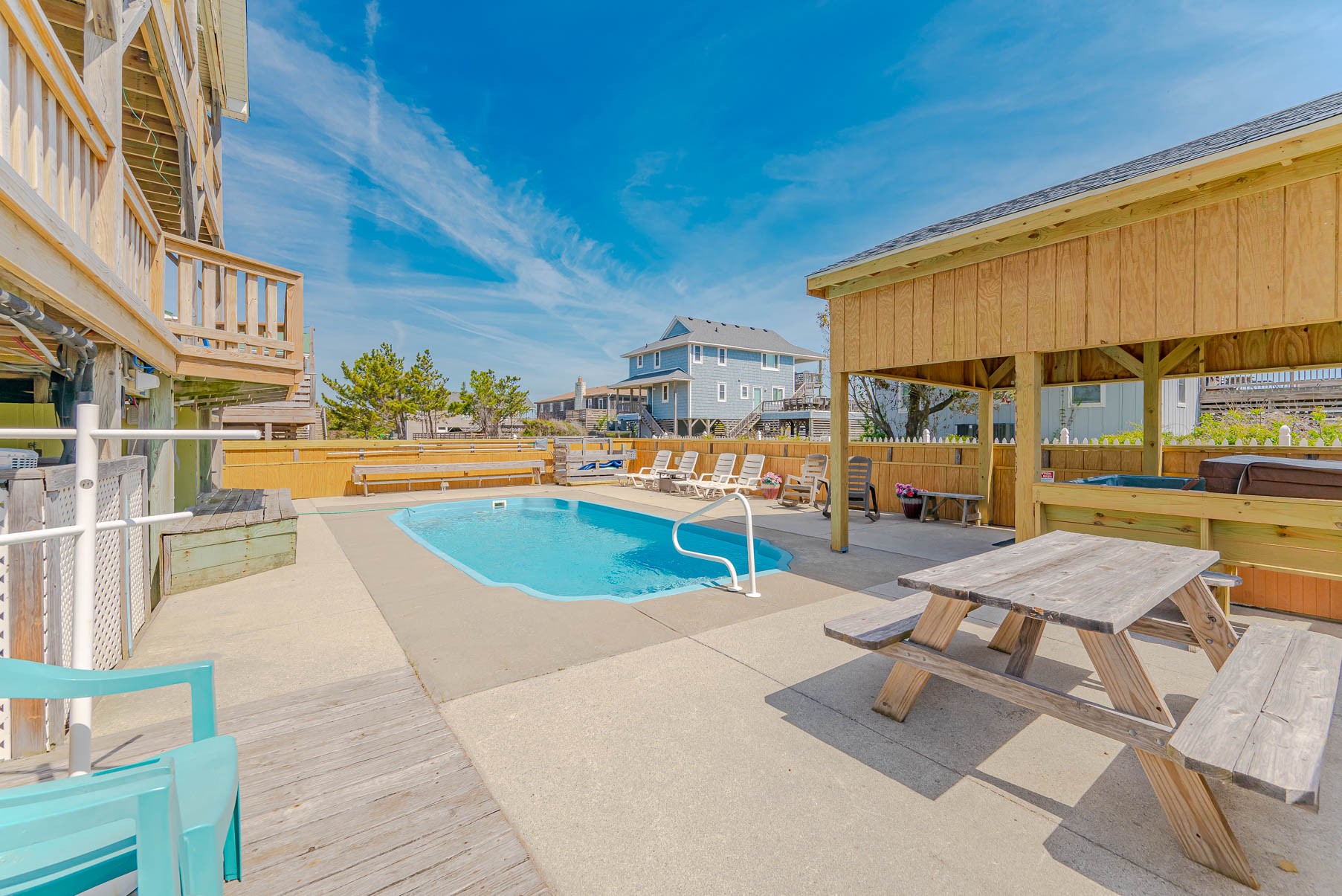 Ground Level: Ground Level: Parking for 5 Cars, Entry to Home, Large Living Room/Den, TV, Rec. Room w/Pool Table, Half Bath, Kitchenette, Microwave, Laundry w/Washer/Dryer, Full Size Refrigerator, Bedroom w/Queen, Access to Private Heated Swimming Pool (HEATED FOR FREE – March 28 - October 31). Pool Temperature is Subject to Outside Temperatures and Conditions, 6 Person Hot Tub, Lights in Yard / Pool Area for Nighttime Enjoyment, the Entire Back Yard has been Fenced for Security. Beach Access is Located One House to the North, and then a path toward Ocean.