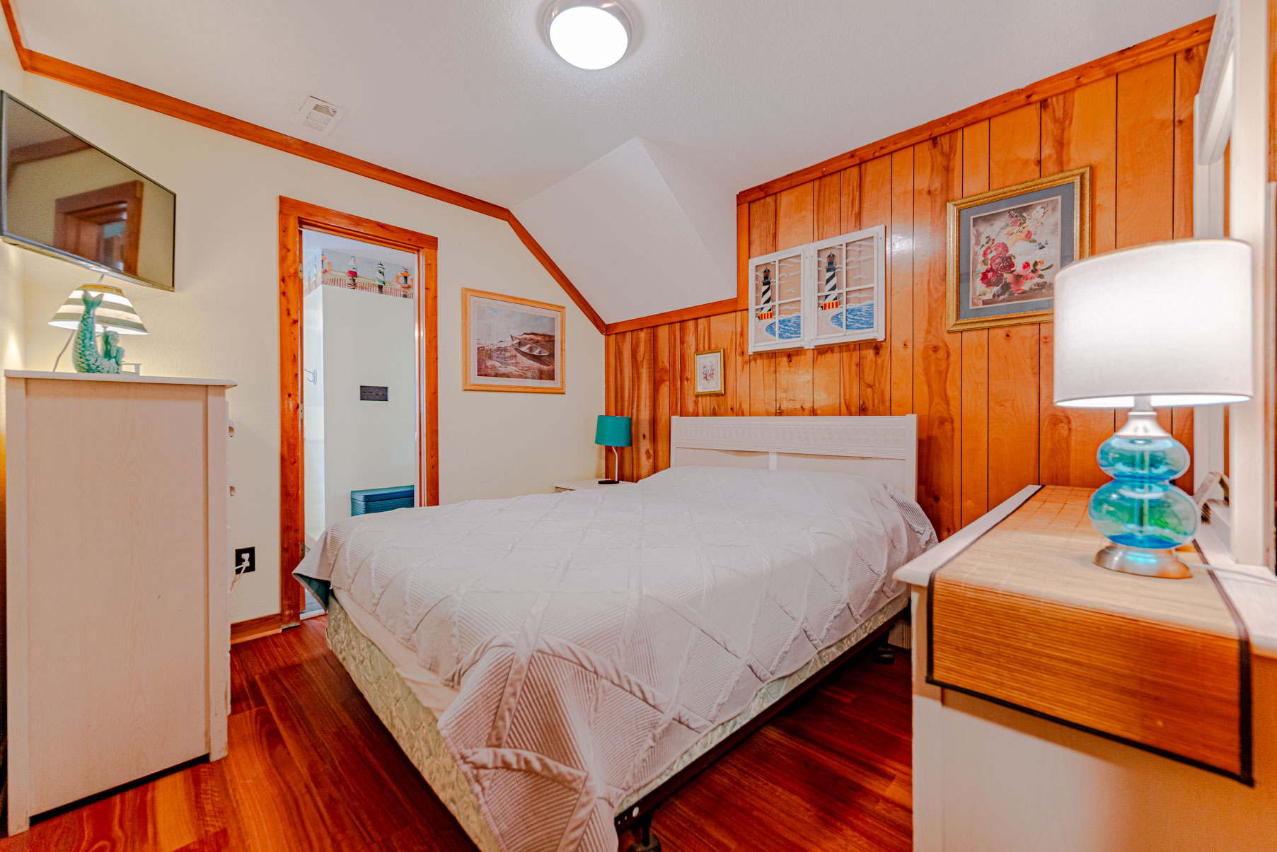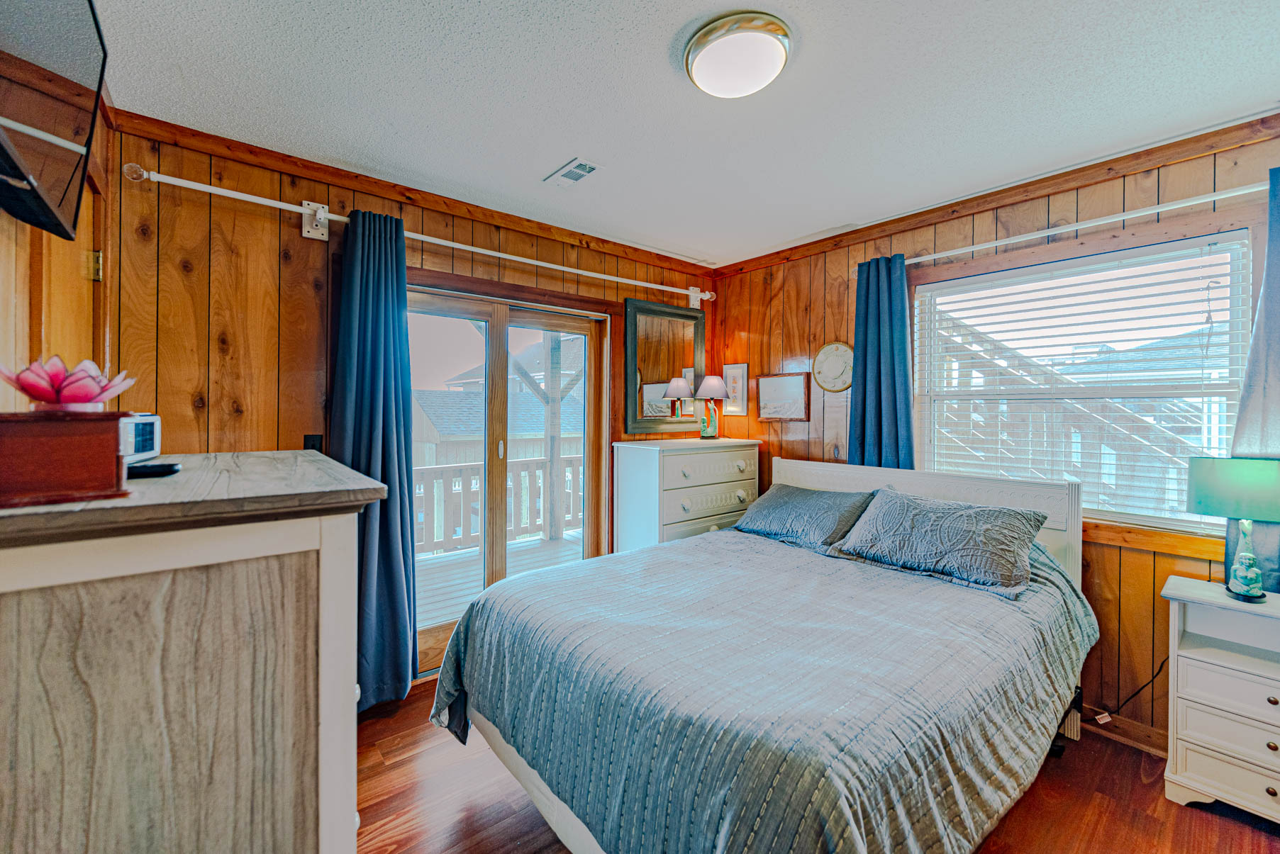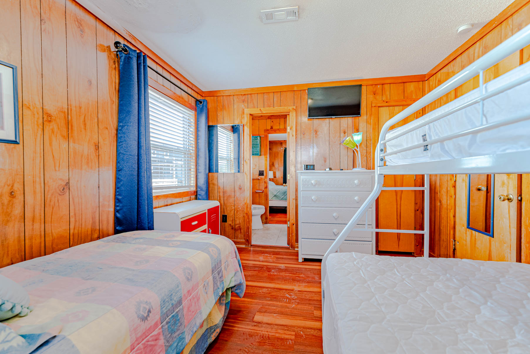 Mid Level: Foyer at Main Entry, 4 Bedrooms (Private Suite w/Queen and Full Bath; 1 w/Queen and 1 w/Duo Bunk, Single and a Shared Full Bath; 1 w/Queen), Full Bath Hall Bath w/Garden Tub (3 Full Baths on This Level), and Covered Deck overlooking the Pool Area.