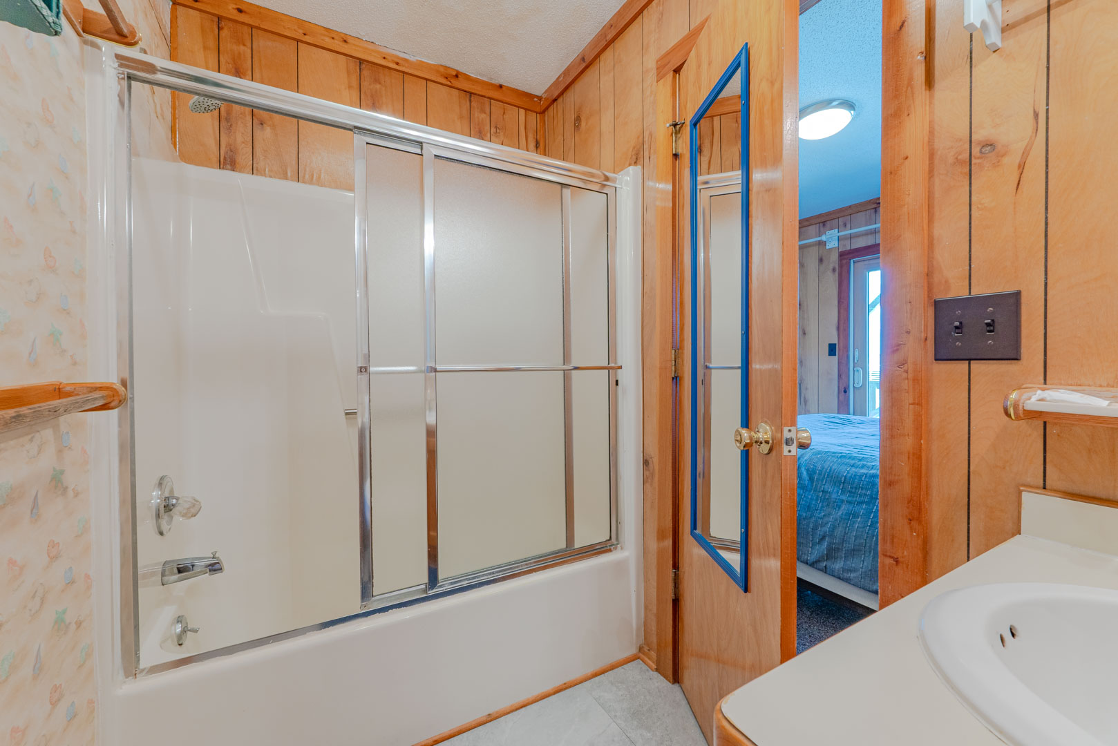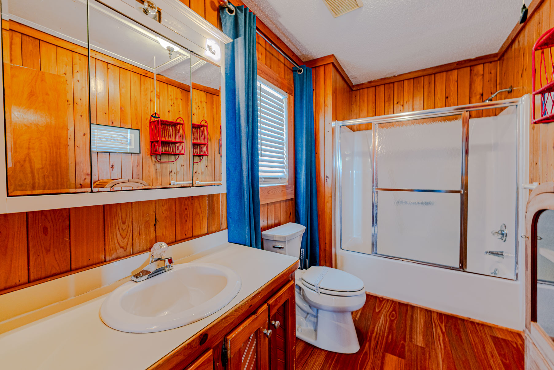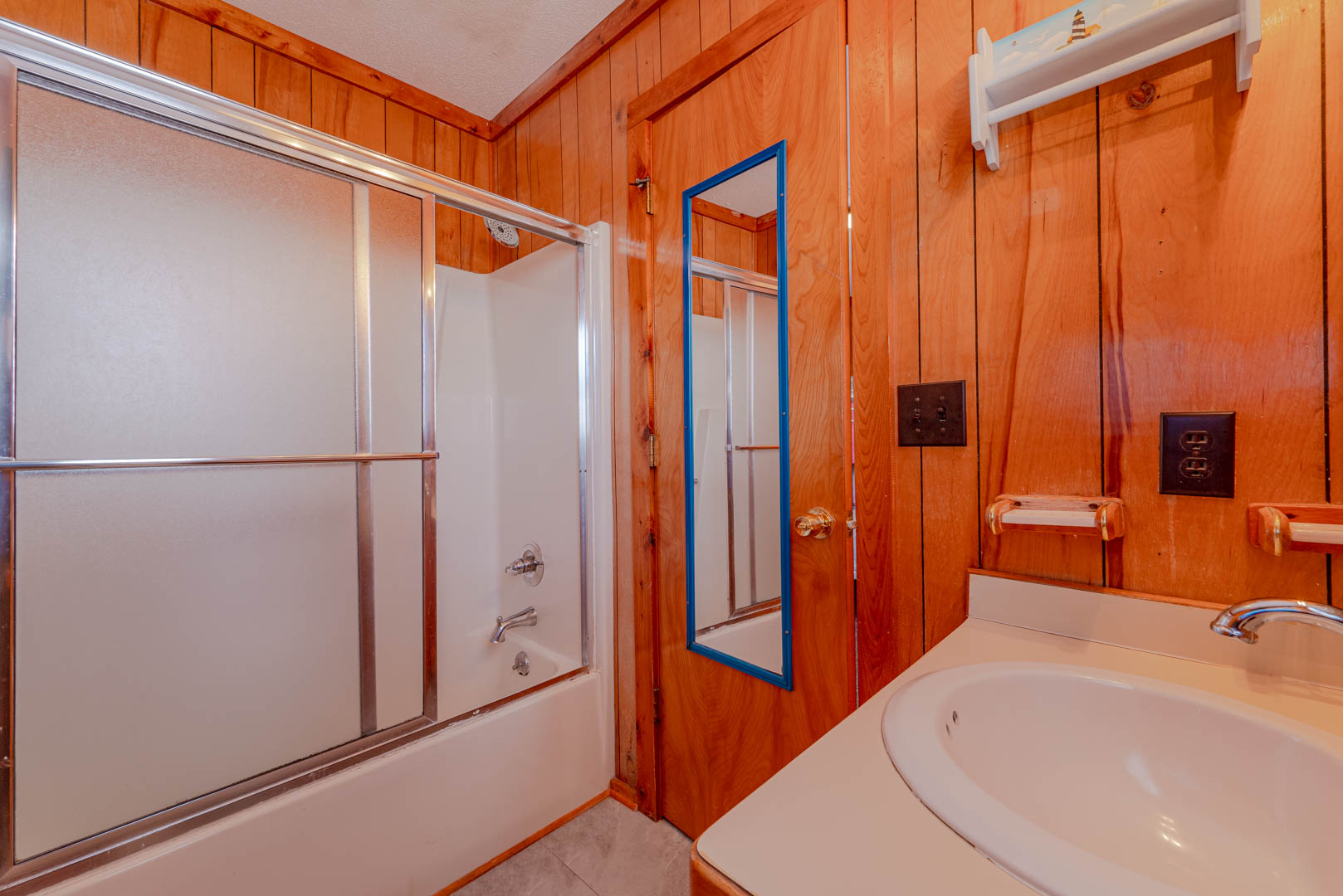 Mid Level: Foyer at Main Entry, 4 Bedrooms (Private Suite w/Queen and Full Bath; 1 w/Queen and 1 w/Duo Bunk, Single and a Shared Full Bath; 1 w/Queen), Full Bath Hall Bath w/Garden Tub (3 Full Baths on This Level), and Covered Deck overlooking the Pool Area.