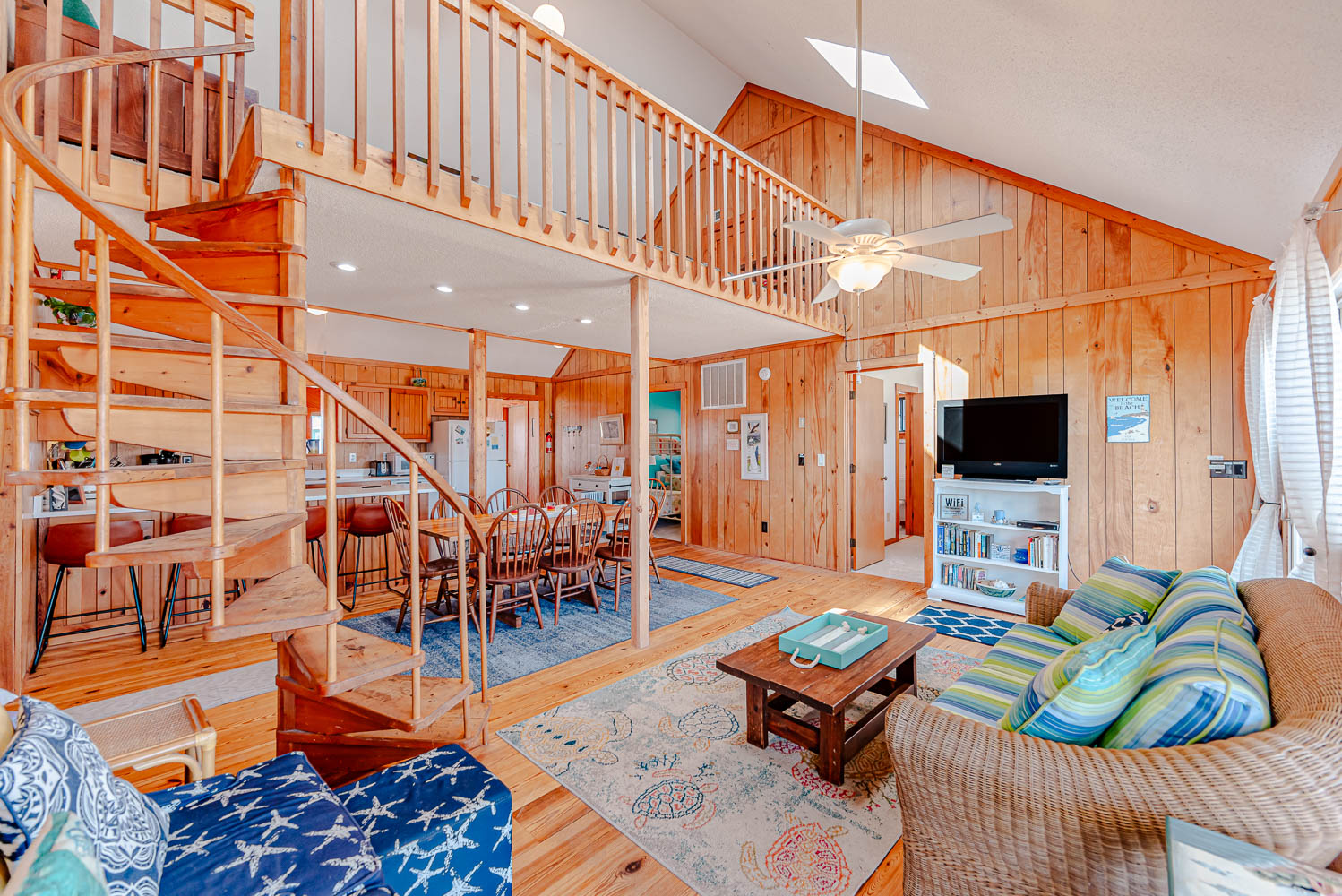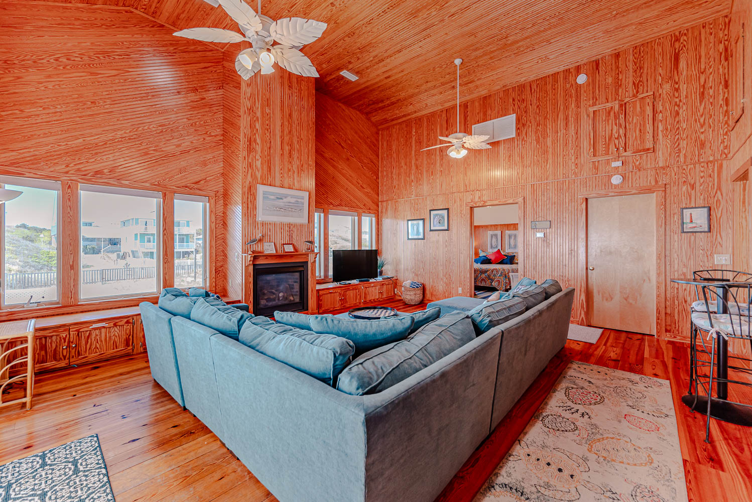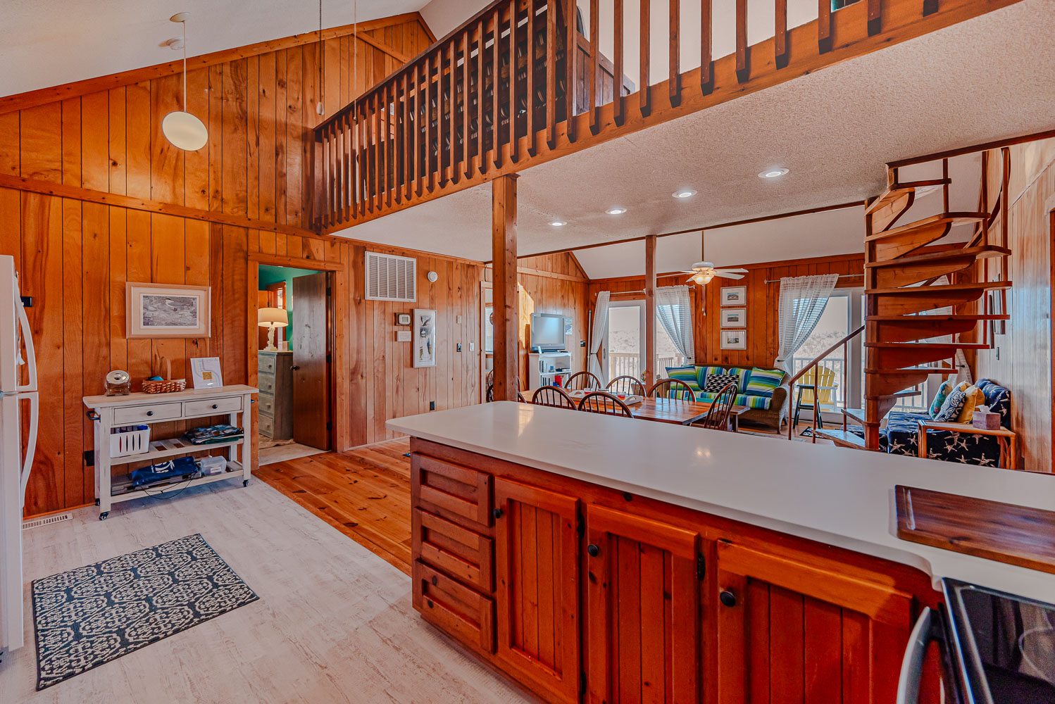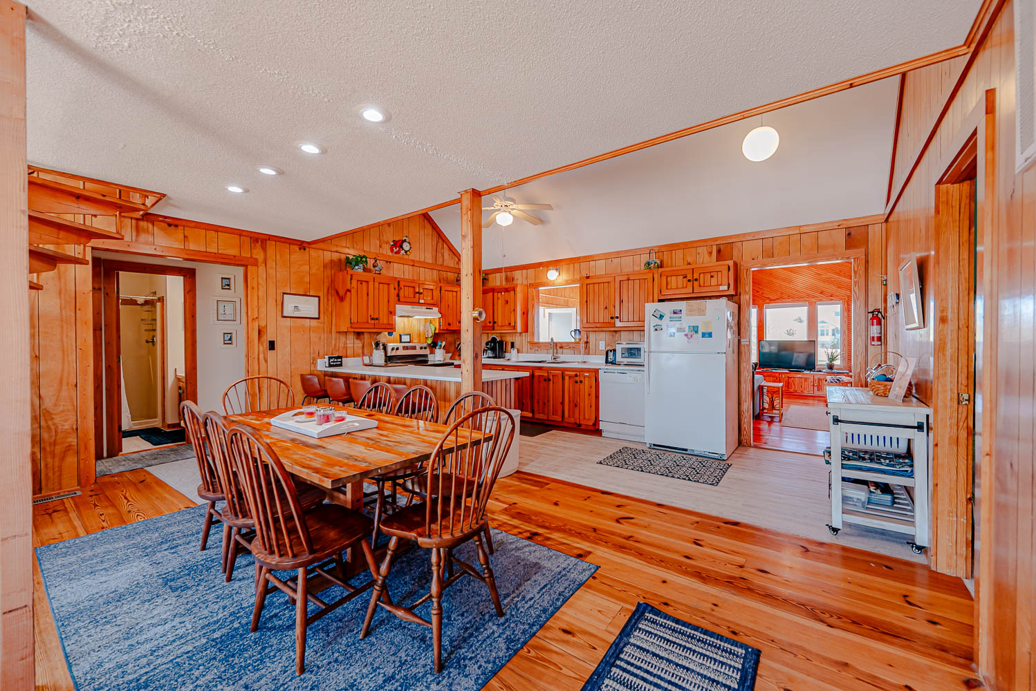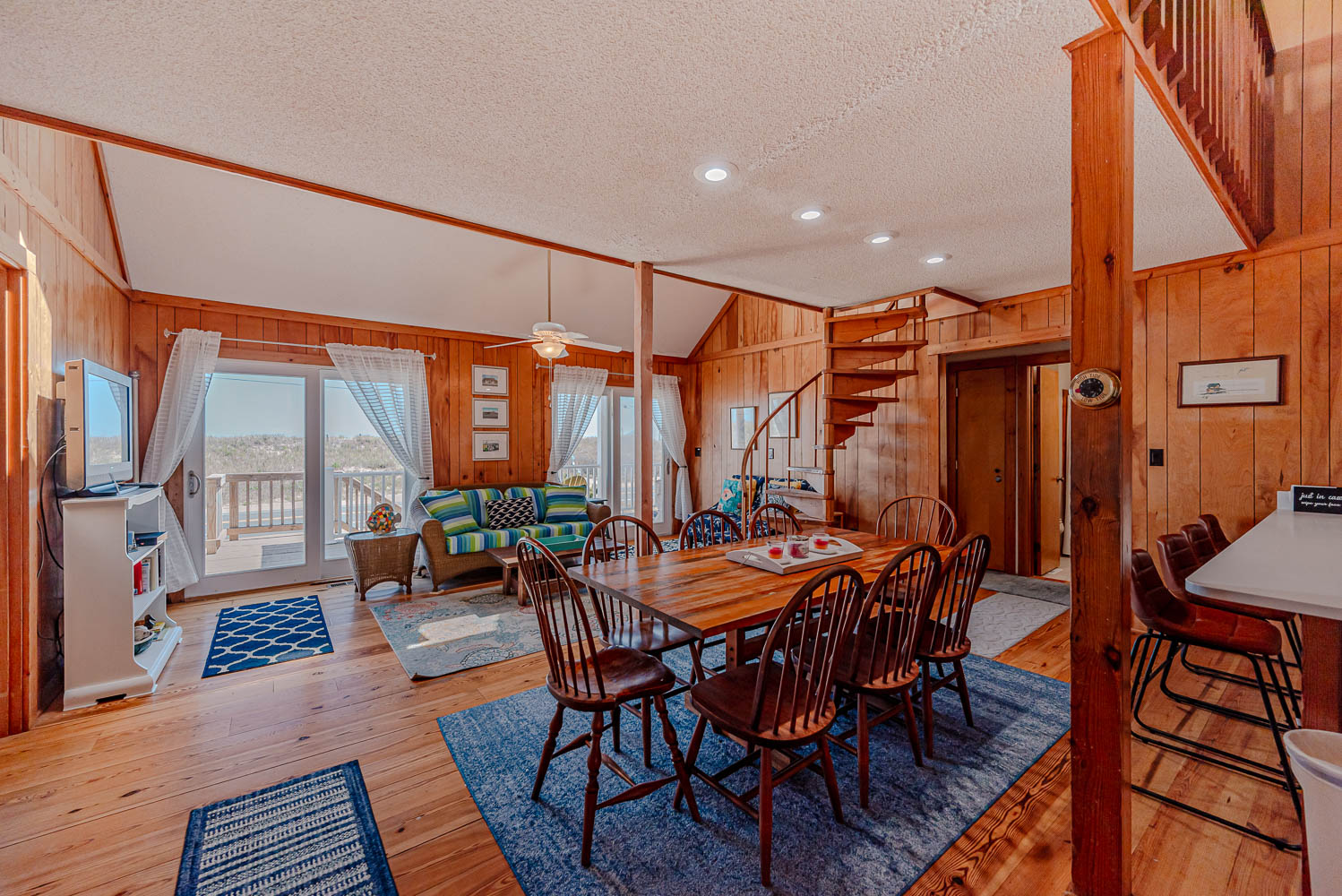 Main Level: Living Area, TV, Full Equipped Kitchen Area, Bar Seating for Four (4), See Through to Large Family Room, Gas Fireplace, Dining Area w/Dining Table w/Seating for Eight (8), Access to Covered Deck w/Composite Deck Furniture, 5 Bedrooms (Private Suite w/Queen, TV, Full Bath w/Roll In Shower; 1 w/Queen, TV; 1 w/Queen; 1 w/Duo Bunk, Single; 1 w/2 Singles, TV), Full Hall Bath w/Tub/Shower Comb, Full Hall Bath w/Step In Shower, and Access to Large Sun Deck w/Deck Furniture and Picnic Table.