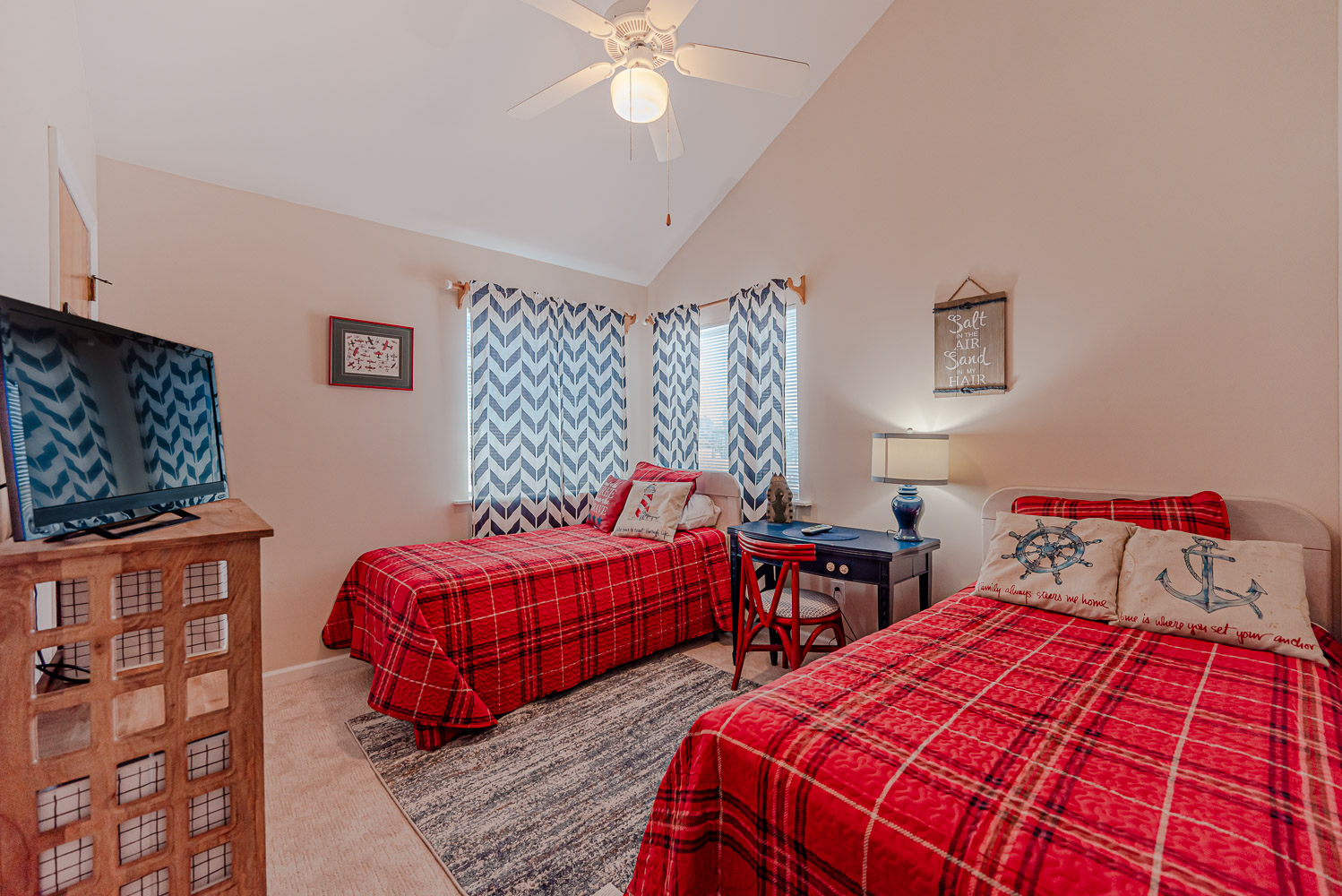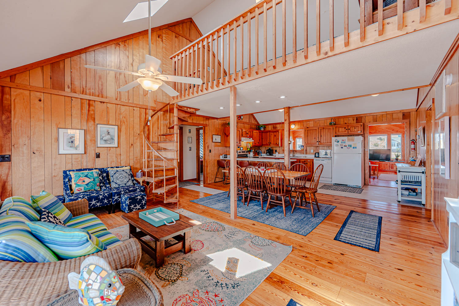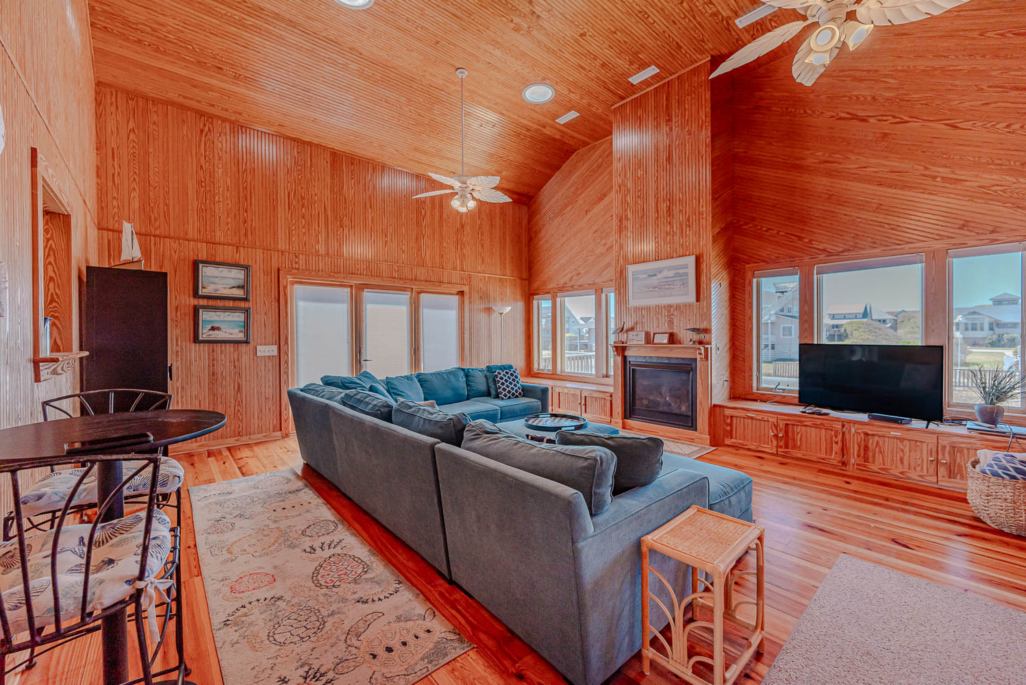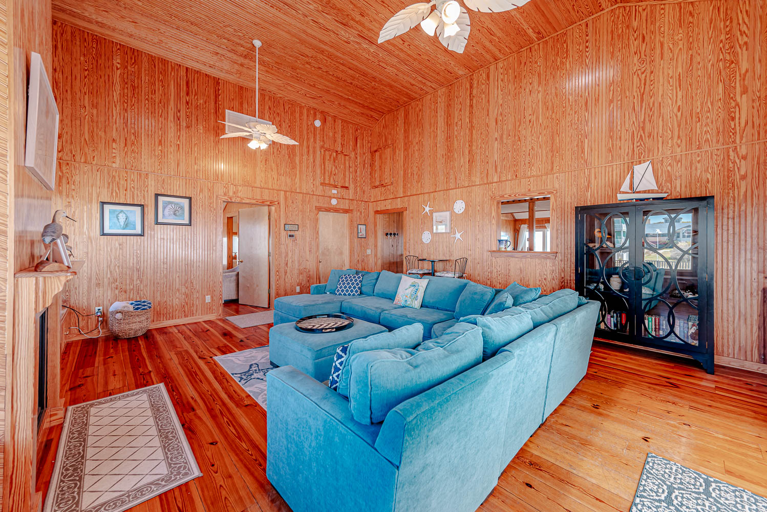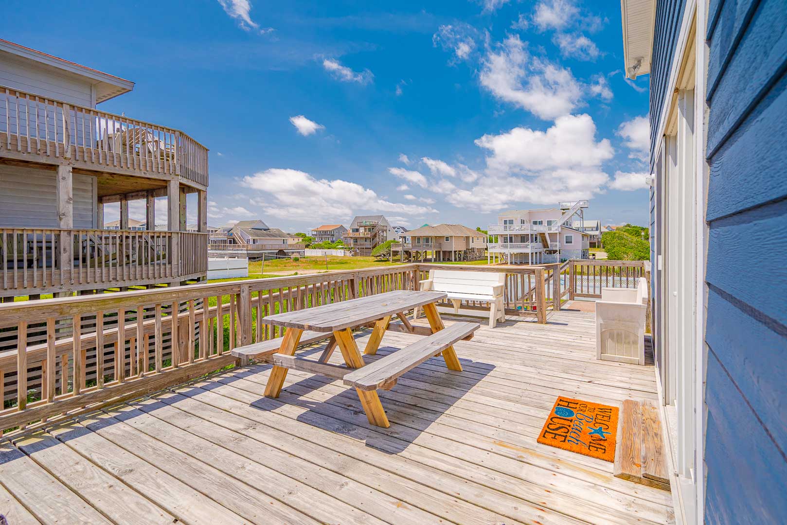 Main Level: Living Area, TV, Full Equipped Kitchen Area, Bar Seating for Four (4), See Through to Large Family Room, Gas Fireplace, Dining Area w/Dining Table w/Seating for Eight (8), Access to Covered Deck w/Composite Deck Furniture, 5 Bedrooms (Private Suite w/Queen, TV, Full Bath w/Roll In Shower; 1 w/Queen, TV; 1 w/Queen; 1 w/Duo Bunk, Single; 1 w/2 Singles, TV), Full Hall Bath w/Tub/Shower Comb, Full Hall Bath w/Step In Shower, and Access to Large Sun Deck w/Deck Furniture and Picnic Table.