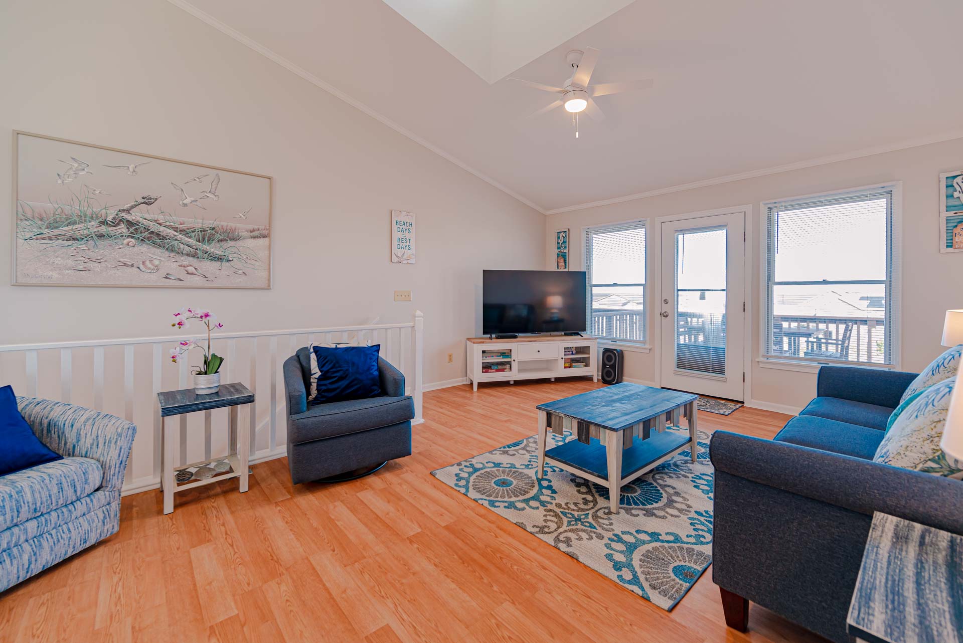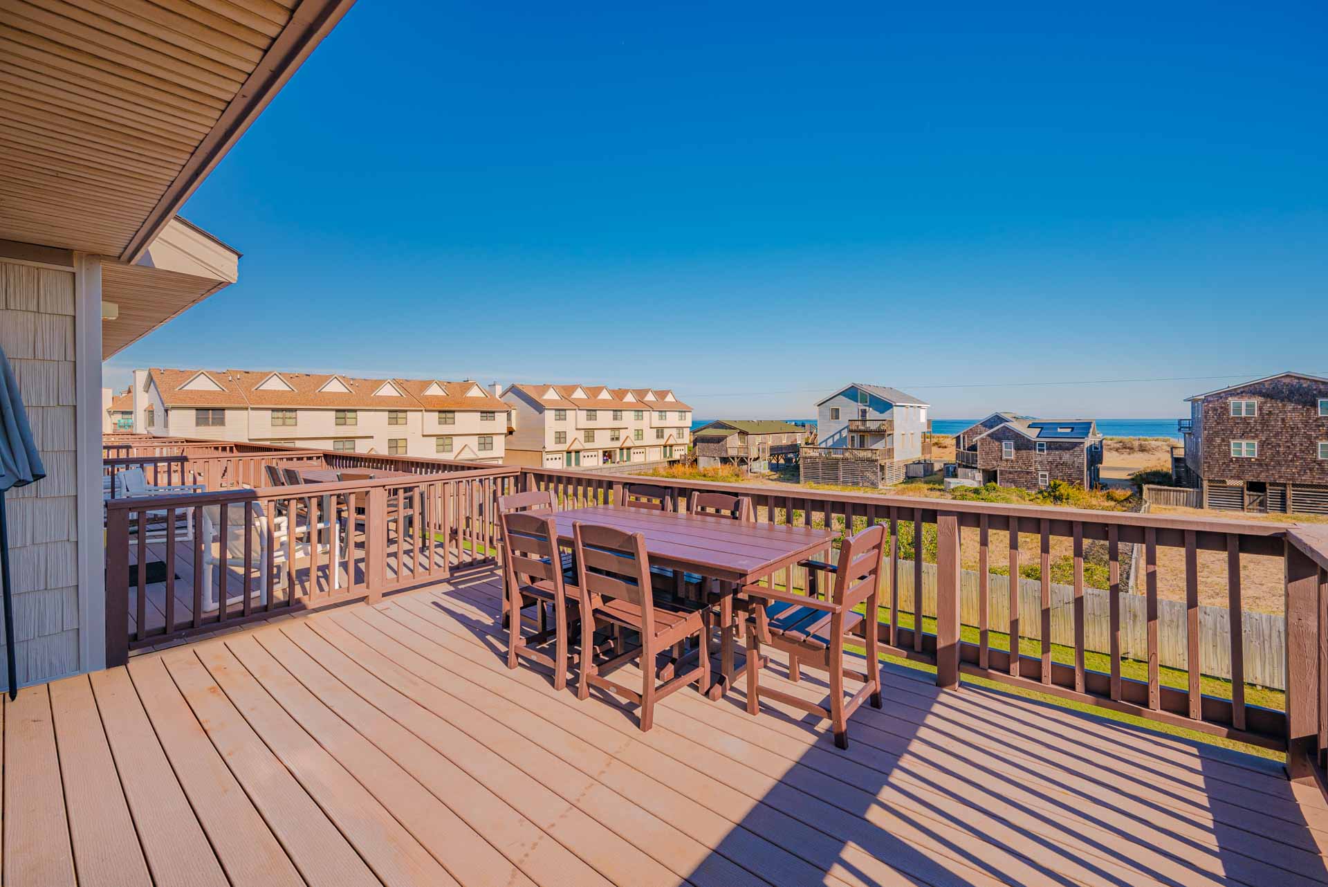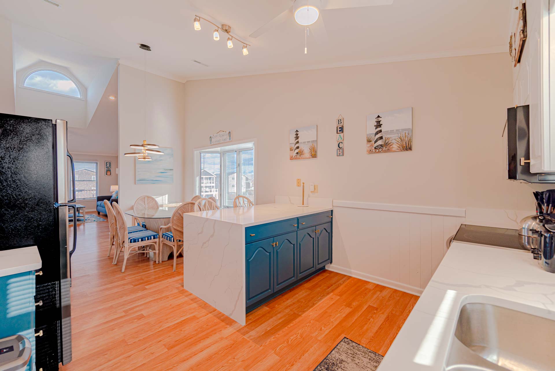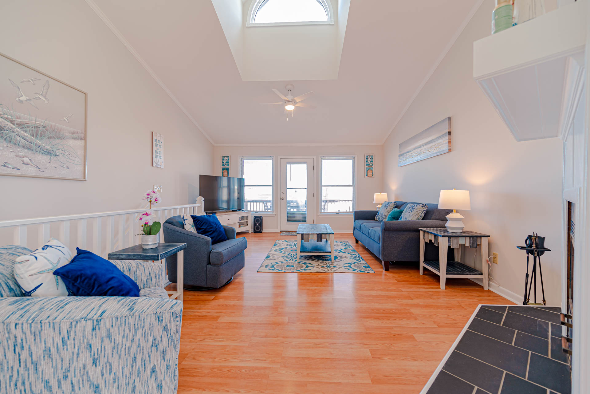 Top Level: Living Area w/Large TV, Well Equipped Kitchen w/Breakfast Bar w/Seating for Three (3), Dining Area w/Seating for Six (6), Half Bath, and Access to Well Furnished Sun Deck w/Great Ocean Views.