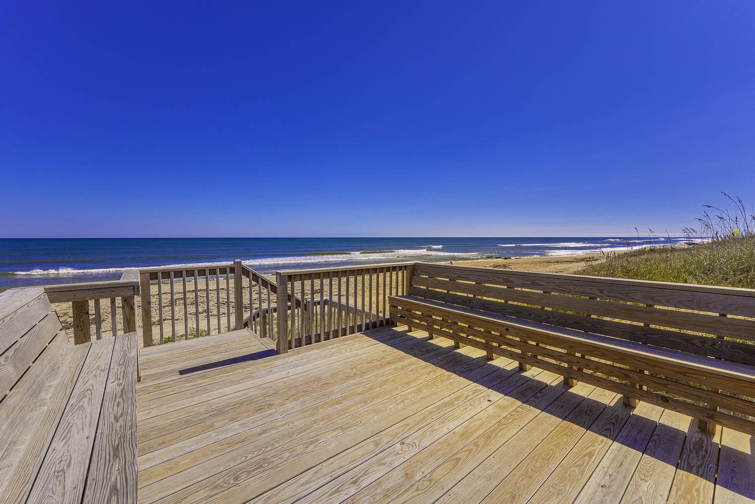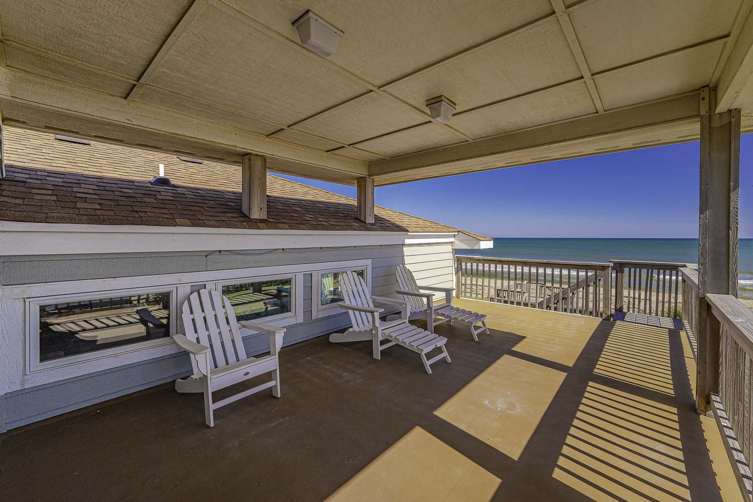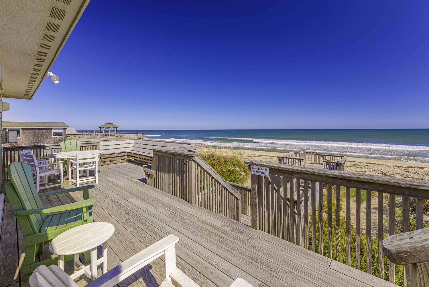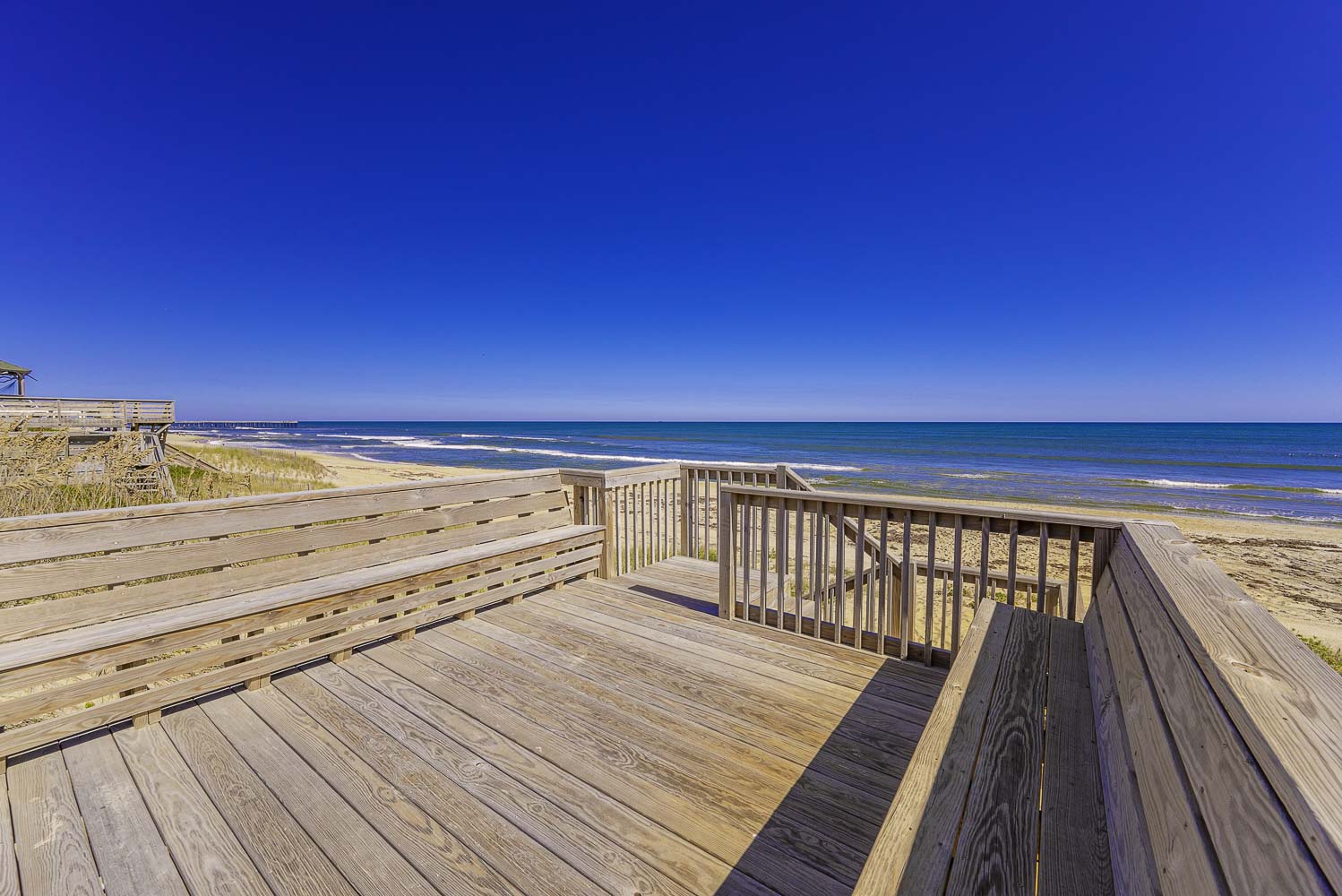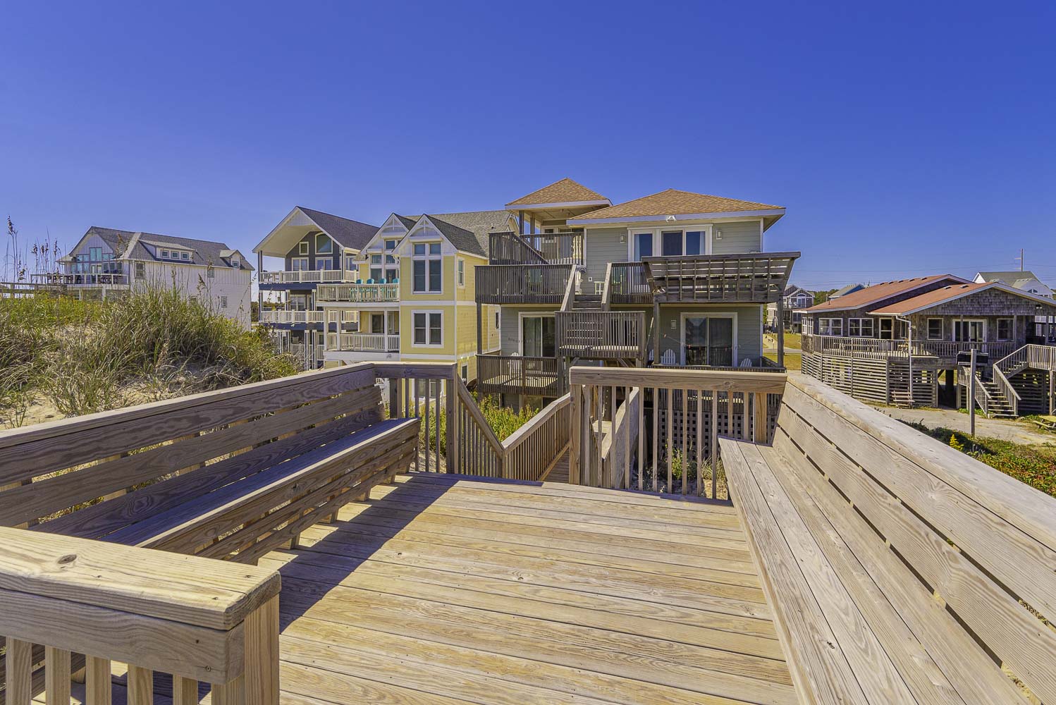 Mid Level: 4 Bedrooms (2 Private Suites w/Kings, Flat Screen TVs, Full Baths, Ocean Views; Private Suite w/Queen, Flat Screen TV, Full Bath; Private Suite w/2 Duo Bunks, Flat Screen TV, Full Bath), and Covered Deck w/Walkway to Dune Top Deck w/Built-In Seating.