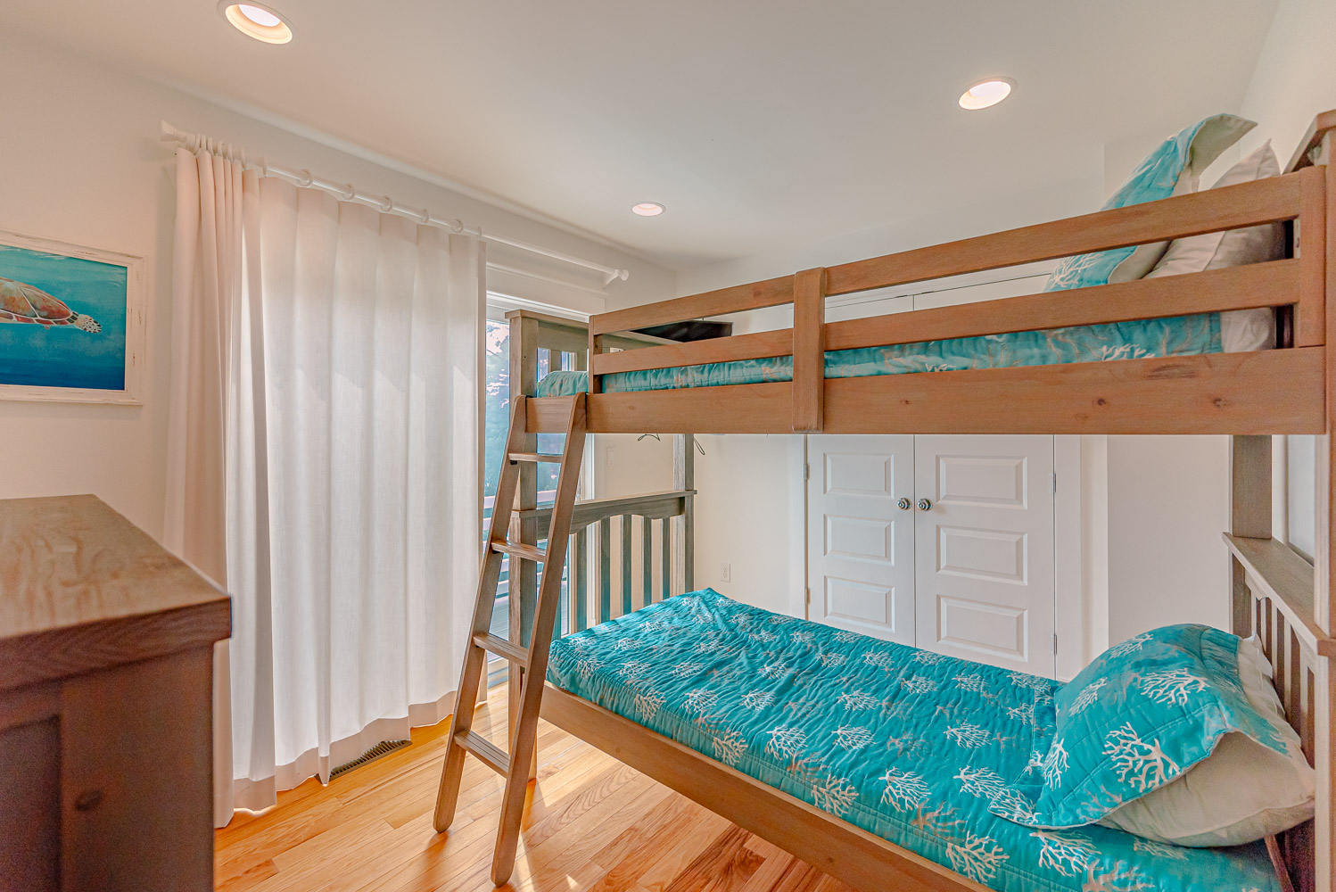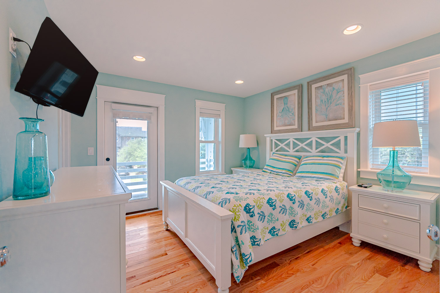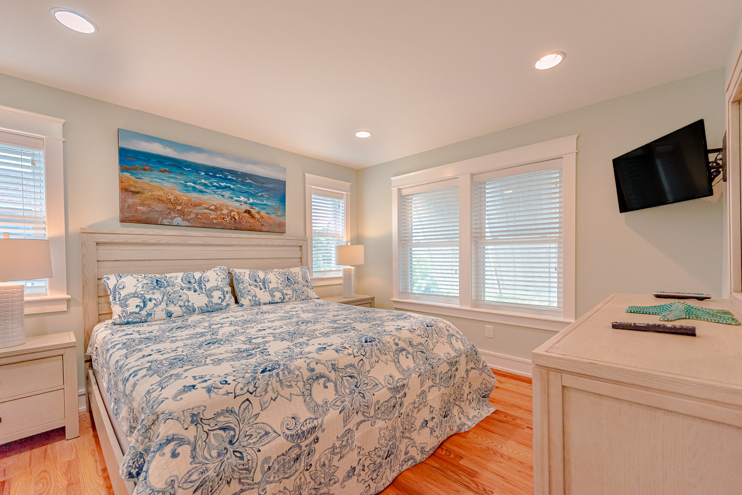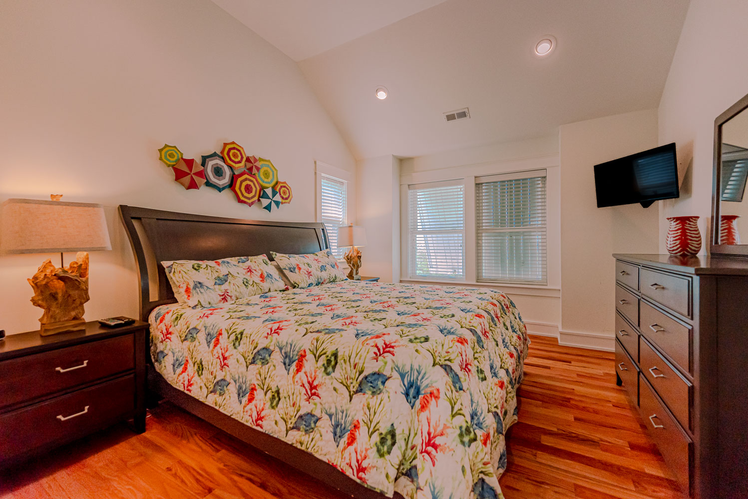 Mid Level: 4 Bedrooms (Private Suite w/King, TV, Full Bath w/Walk-In Shower; Private Suite w/Queen, TV, Full Bath w/Tub, Separate Shower Access to Covered Deck; 1 w/Queen, TV, Access to Covered Deck; 1 w/Bunk Set, TV, Access to Covered Deck); Full Hall Bath w/Walk-In Shower; Laundry Area; and Covered Deck w/Deck Furniture.