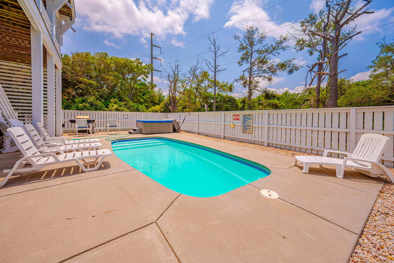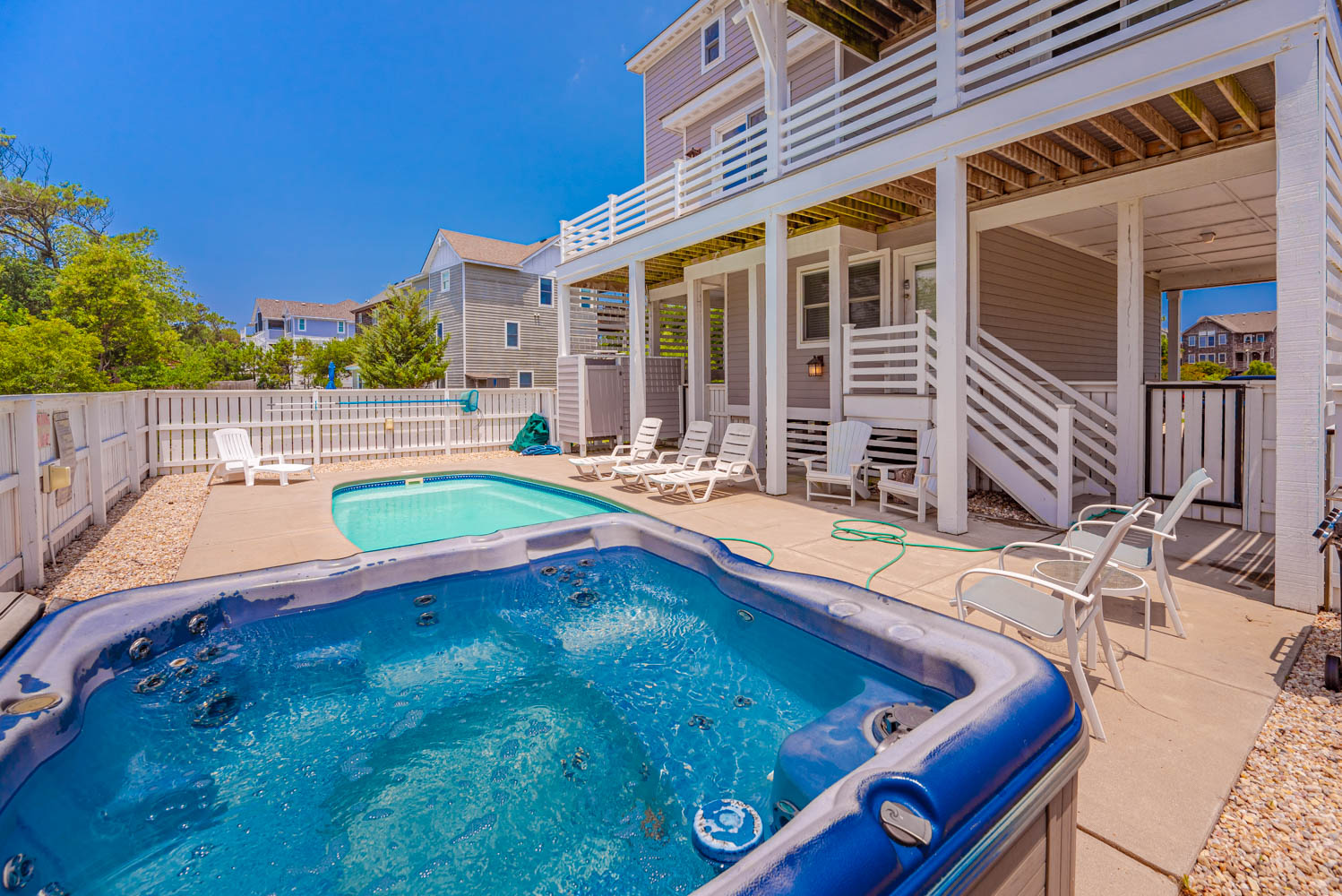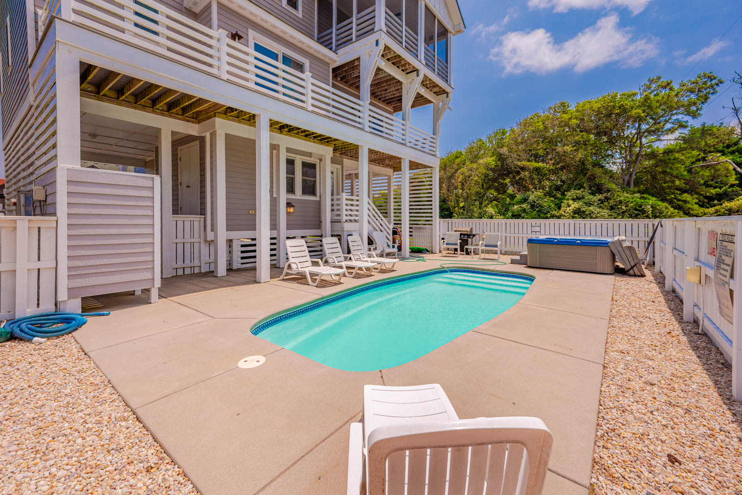 Ground Level: Parking for 5 Cars, Covered Entry, 7 Steps to First Level, Enclosed Outside Shower, Gas Grill, and Private Swimming Pool (Open Seasonally), Hot Tub.
