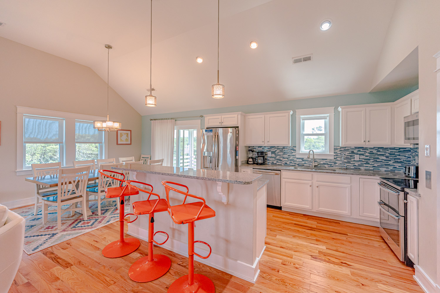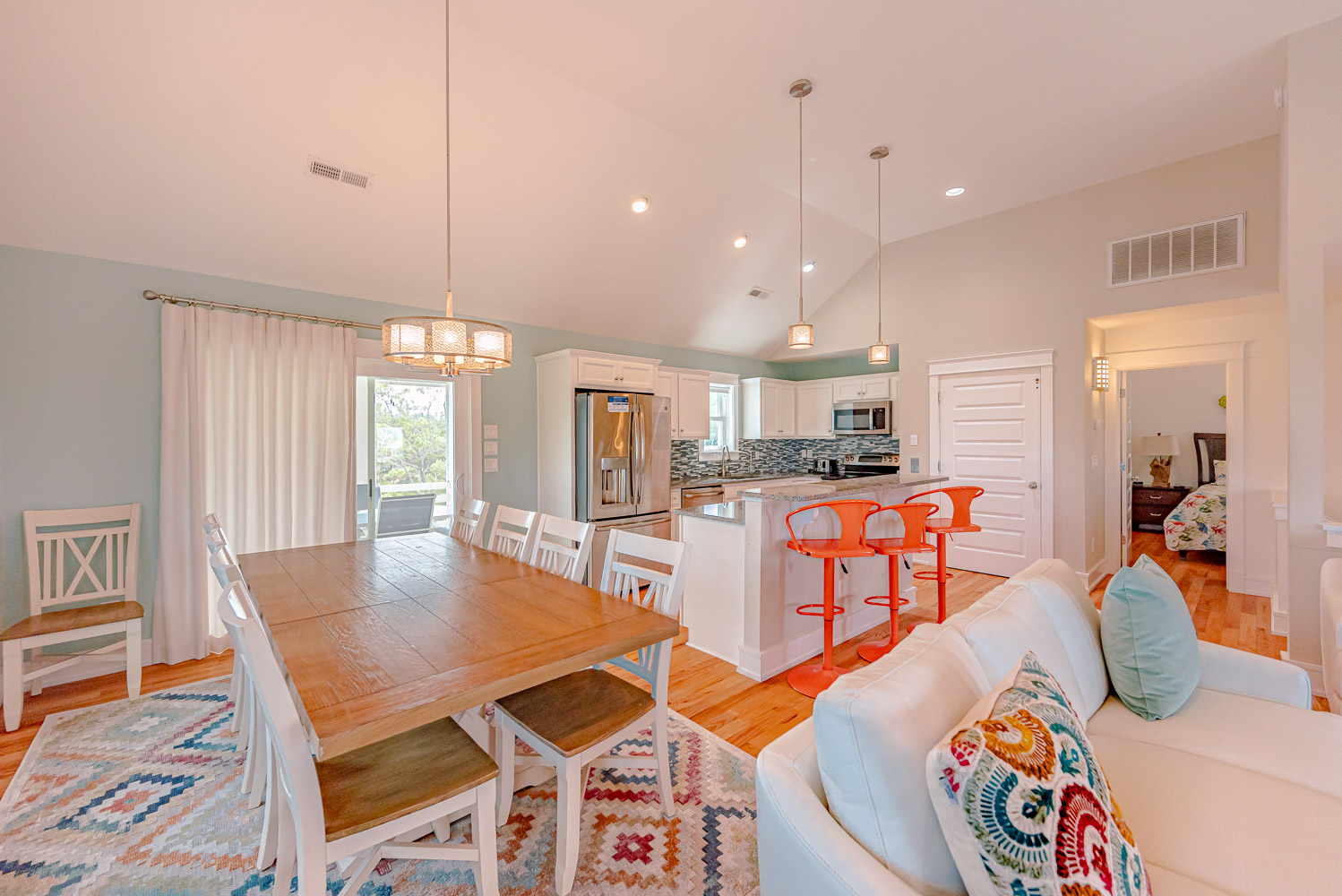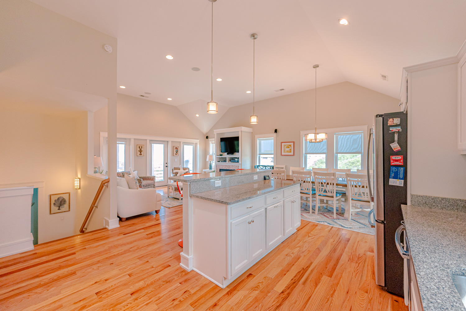 Top Level: Spacious Living Area, TV; Full Equipped Kitchen Area w/Stainless Steel Appliances, Island Bar w/Seating for Three (3); Dining Area w/Seating for Ten (10); Half Bath; Screened Porch; and Private Suite w/King, TV, Full Bath w/Walk-In Tiled Shower, Separate Tub; Access to Front Covered Porch, and Access to Screen Porch w/Ceiling Fan and Furniture.