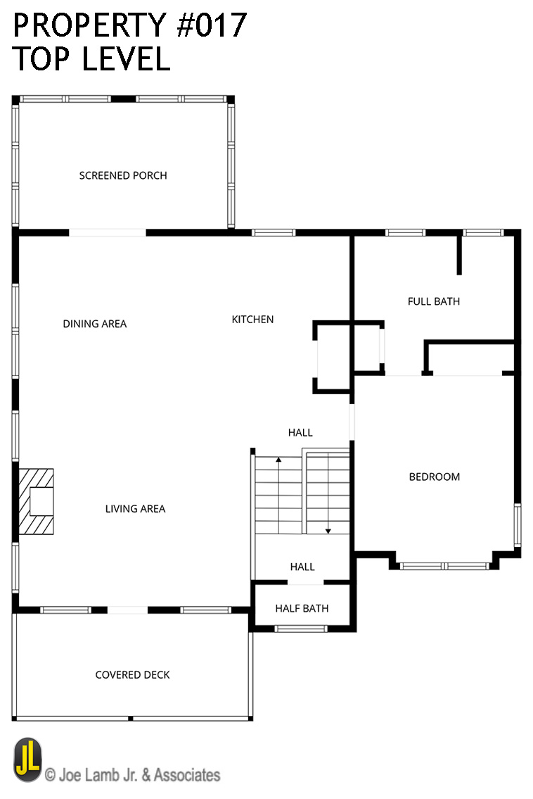 Top Level: Spacious Living Area, TV; Full Equipped Kitchen Area w/Stainless Steel Appliances, Island Bar w/Seating for Three (3); Dining Area w/Seating for Ten (10); Half Bath; Screened Porch; and Private Suite w/King, TV, Full Bath w/Walk-In Tiled Shower, Separate Tub; Access to Front Covered Porch, and Access to Screen Porch w/Ceiling Fan and Furniture.