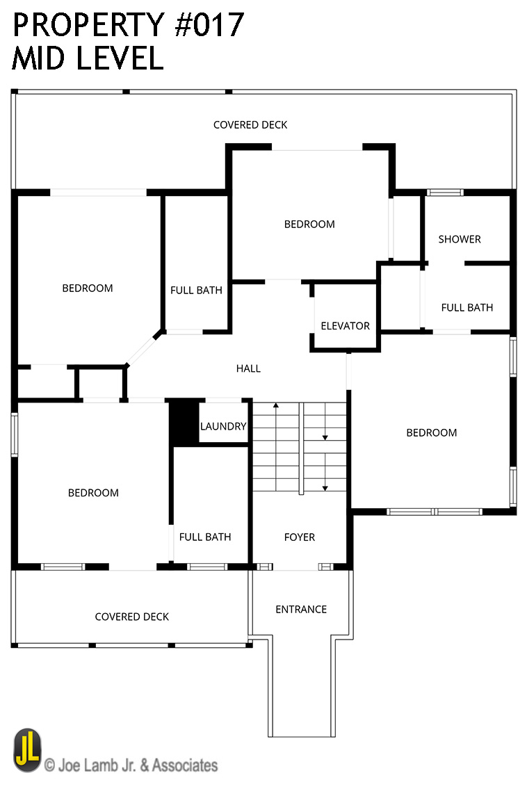 Mid Level: 4 Bedrooms (Private Suite w/King, TV, Full Bath w/Walk-In Shower; Private Suite w/Queen, TV, Full Bath w/Tub, Separate Shower Access to Covered Deck; 1 w/Queen, TV, Access to Covered Deck; 1 w/Bunk Set, TV, Access to Covered Deck); Full Hall Bath w/Walk-In Shower; Laundry Area; and Covered Deck w/Deck Furniture.