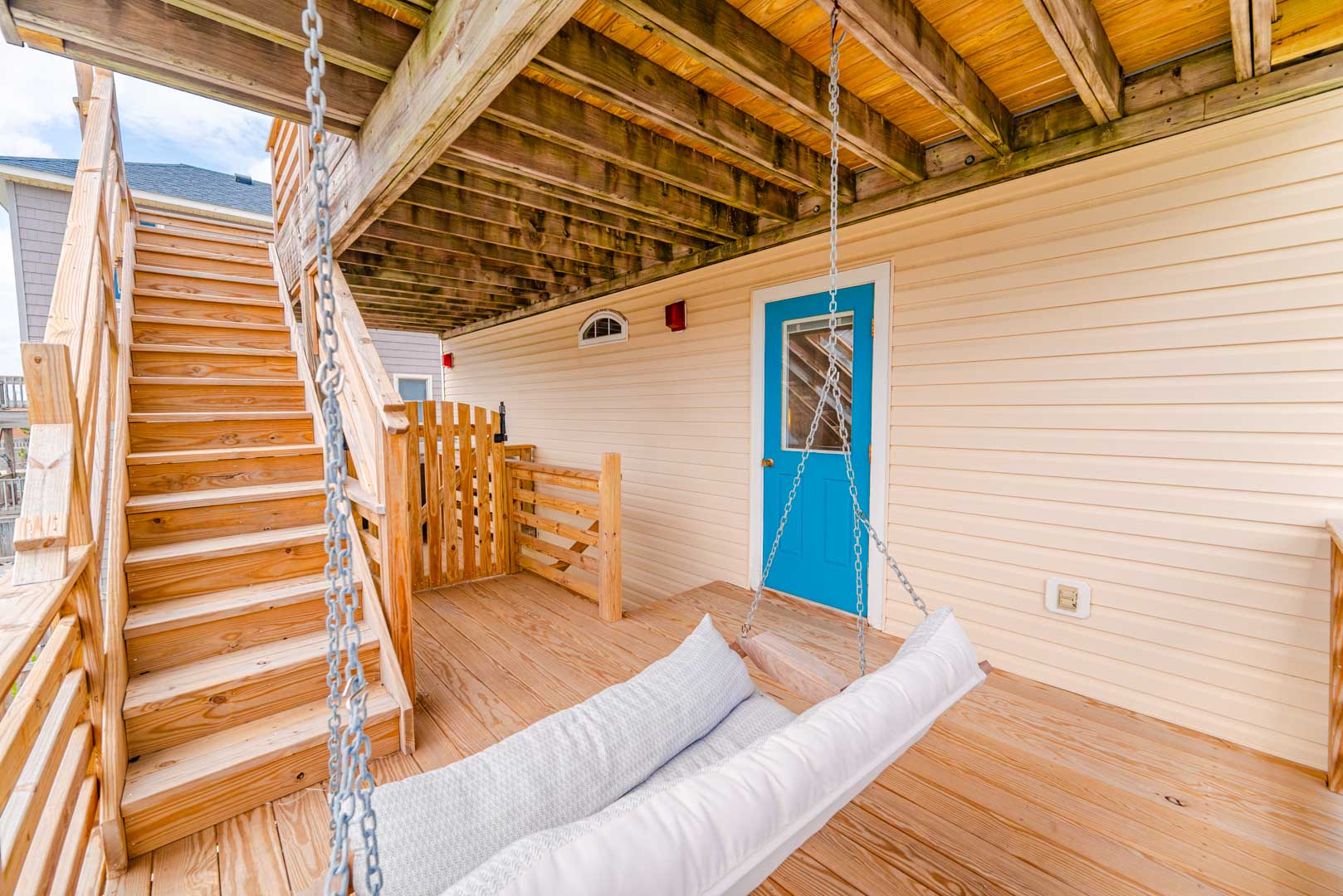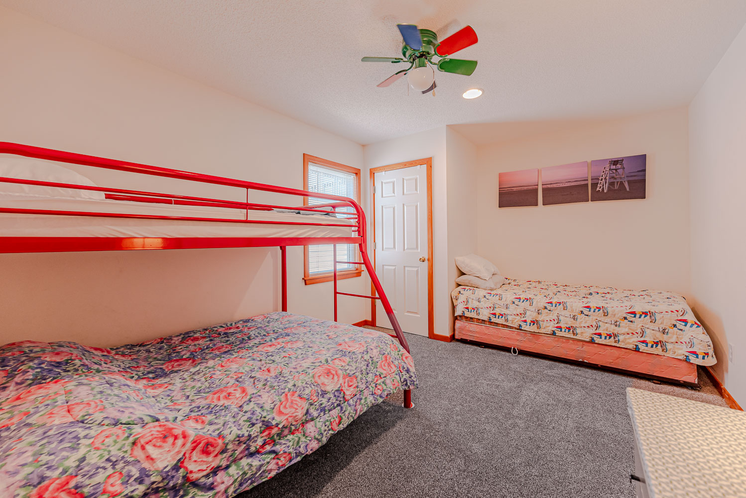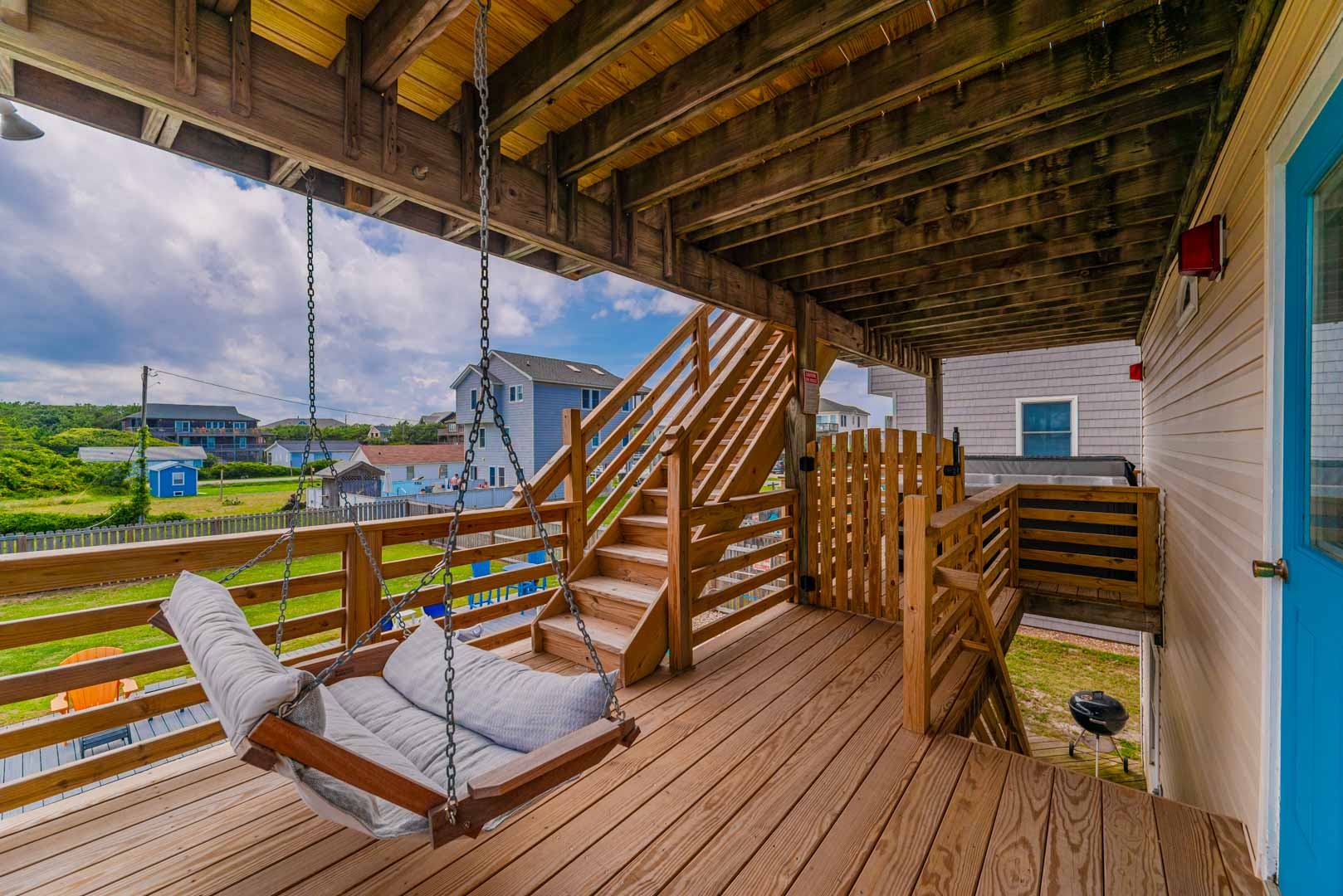 Mid Level: Sitting Area, Daybed w/Trundle, TV; 3 Bedrooms (Private Suite w/King, TV, Full Bath w/Tub/Shower, Access to Covered Deck; Private Suite w/Queen, TV, Full Bath w/Tub/Shower, Access to Covered Deck; 1 w/Duo Bunk w/Trundle, TV), Full Hall Bath w/Tub/Shower, and Gated Covered Deck w/Hot Tub and Porch Swing Overlooking Pool Area.