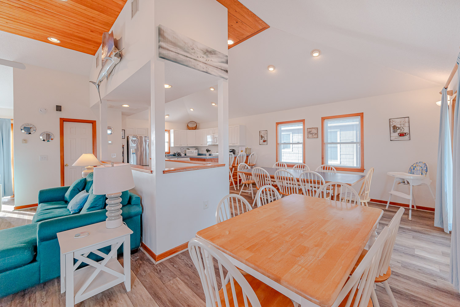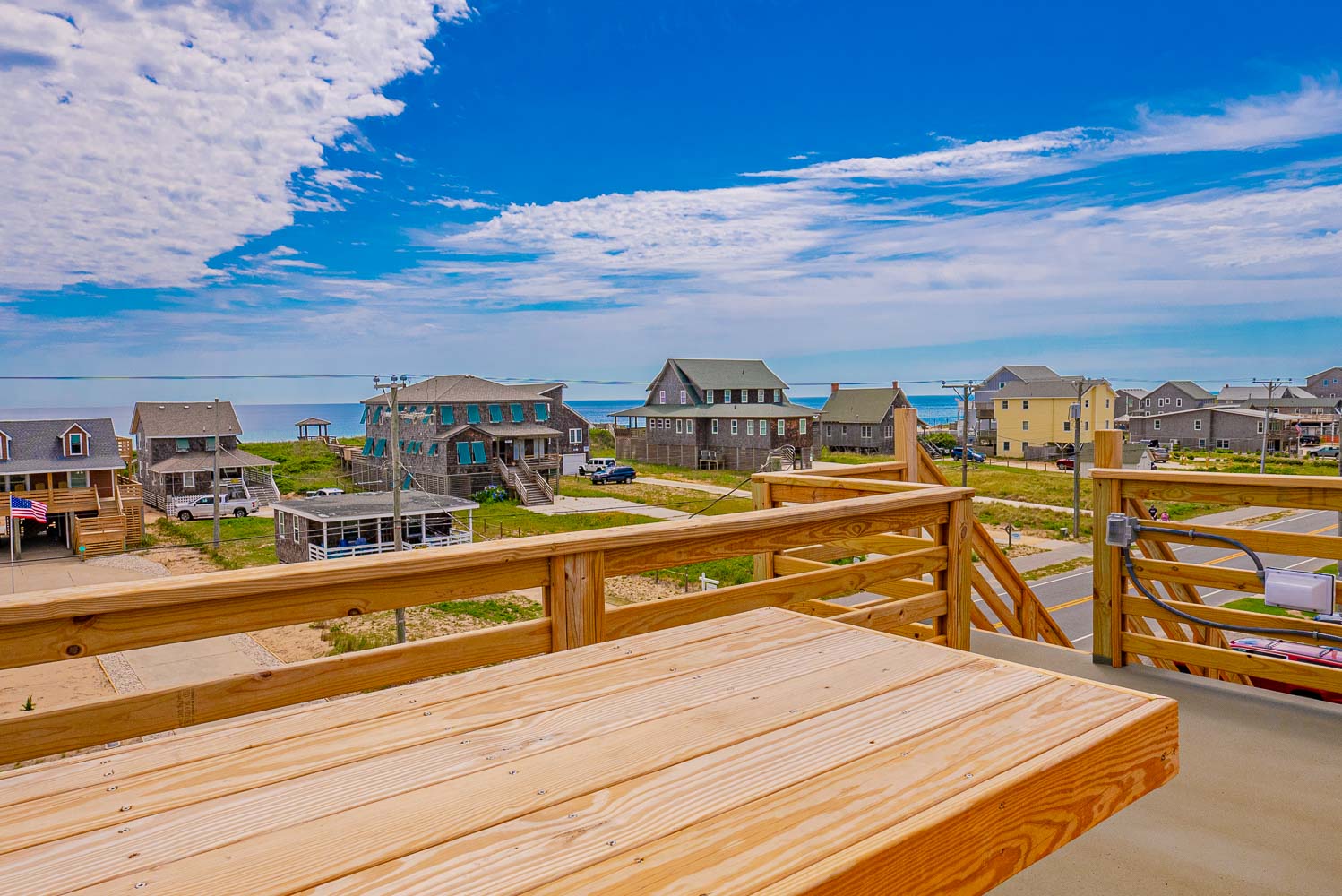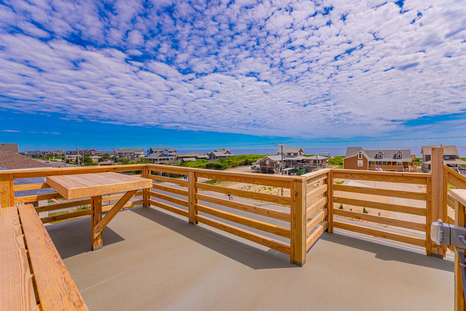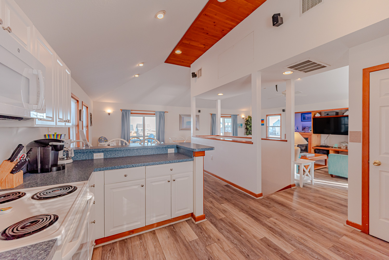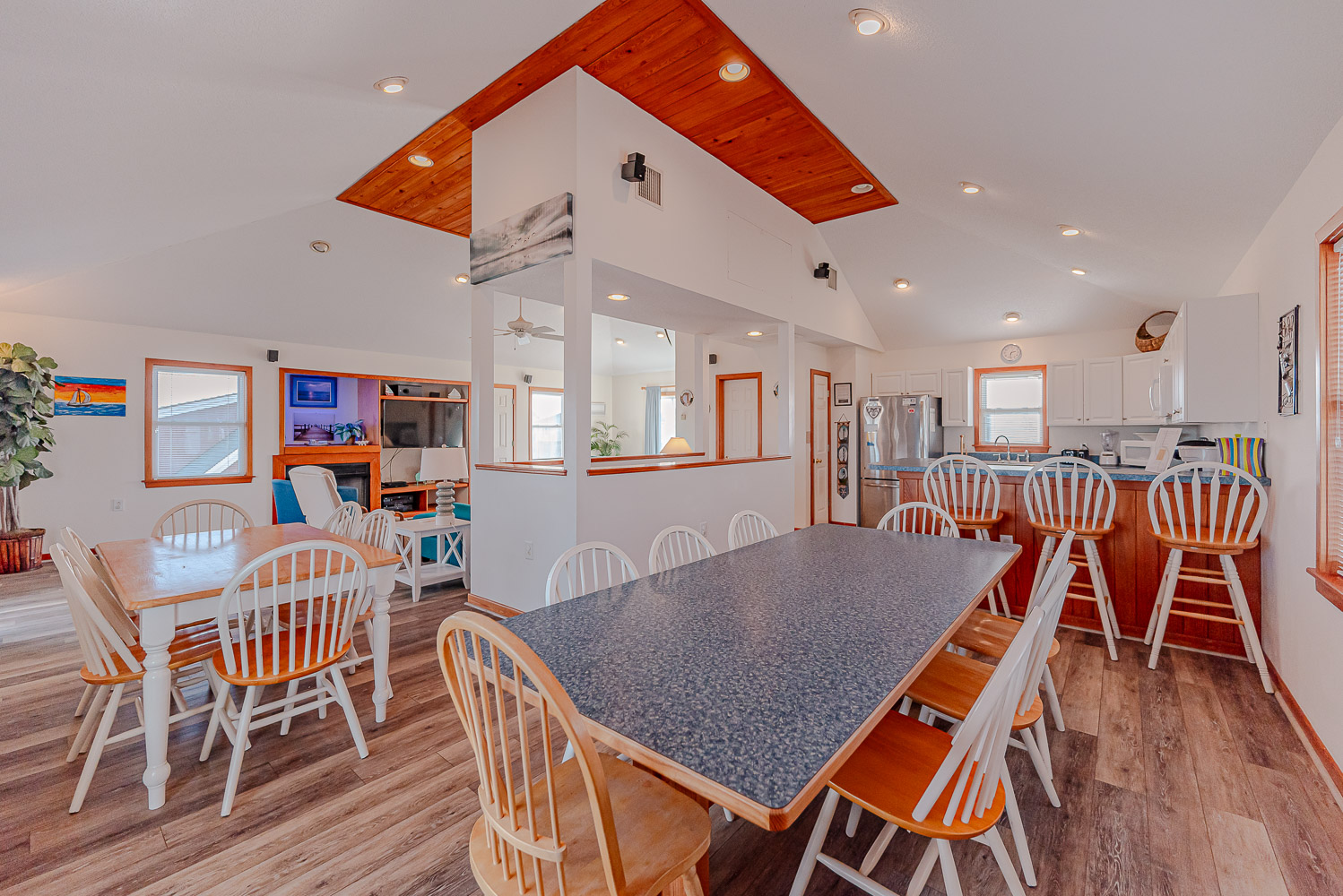 Top Level: Spacious Living Area, Large TV; Dining Area w/Two (2) Dining Table; Kitchen Area w/Stainless Steel Appliances, Bar Seating for Three (3); Hall Bath, Access to Back Sun Deck w/Furniture, Picnic Table, Steps to Lower Levels, Access to Front Covered Deck w/Table and Chairs, Horizon Ocean Views, and Steps to Observation Deck w/Ocean Views.
