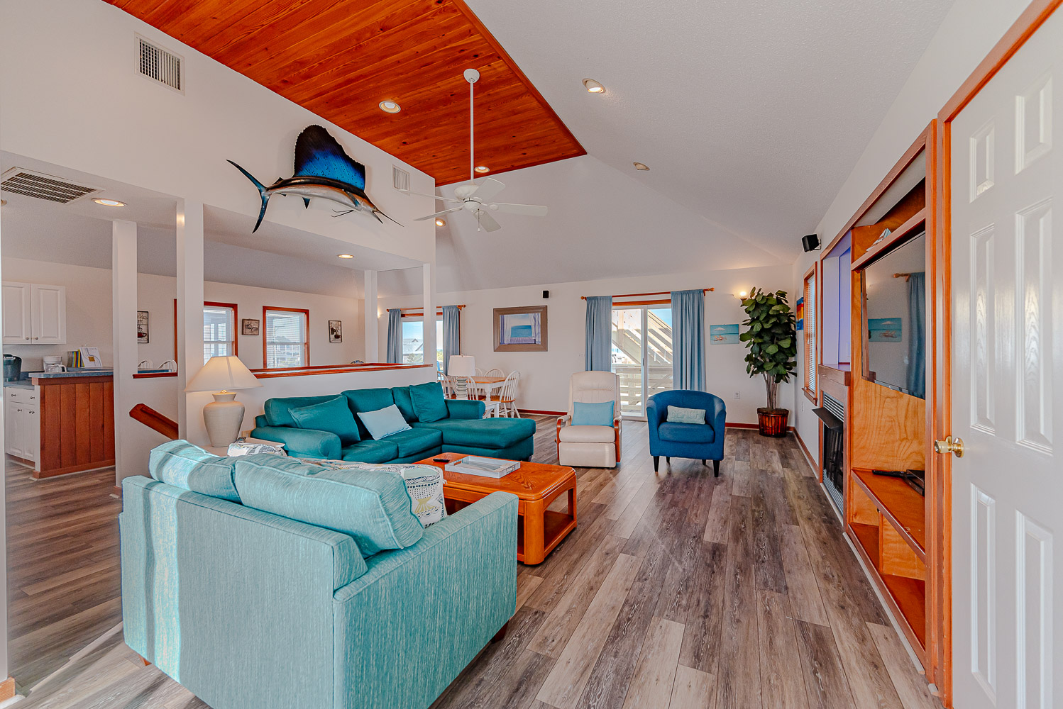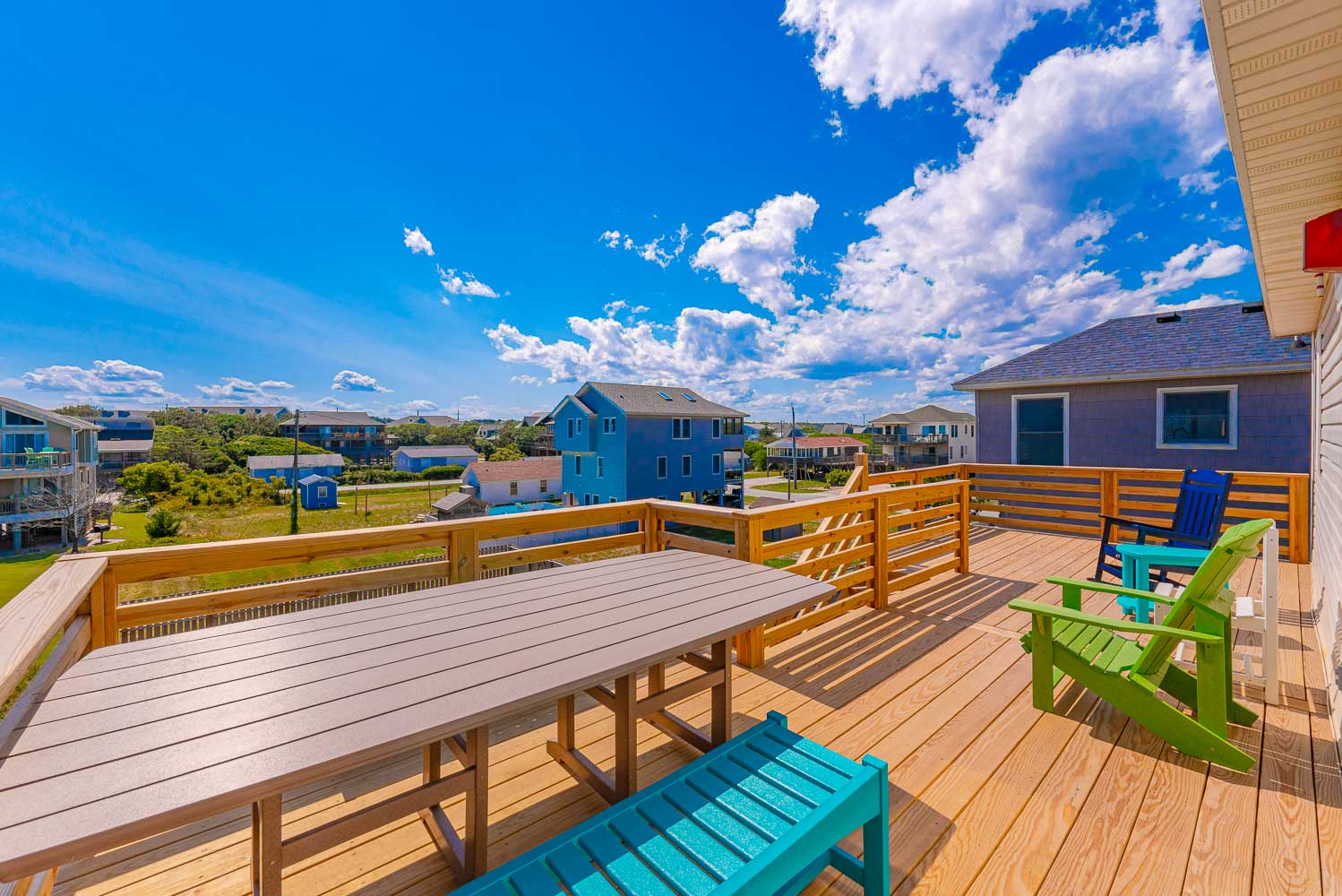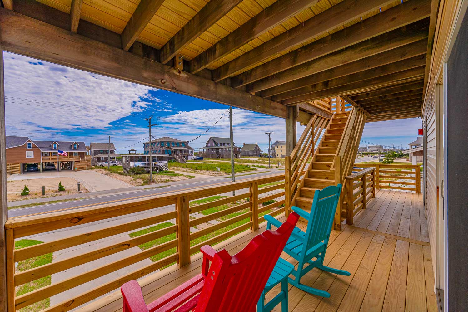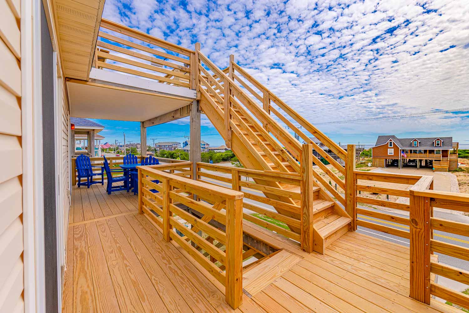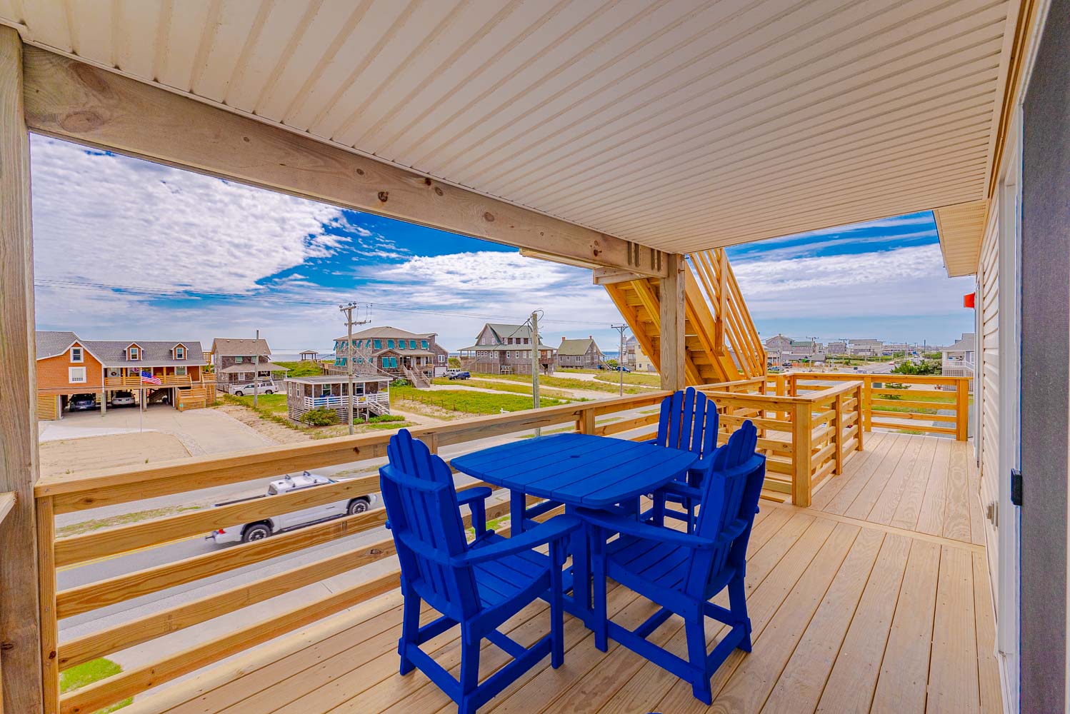 Top Level: Spacious Living Area, Large TV; Dining Area w/Two (2) Dining Table; Kitchen Area w/Stainless Steel Appliances, Bar Seating for Three (3); Hall Bath, Access to Back Sun Deck w/Furniture, Picnic Table, Steps to Lower Levels, Access to Front Covered Deck w/Table and Chairs, Horizon Ocean Views, and Steps to Observation Deck w/Ocean Views.