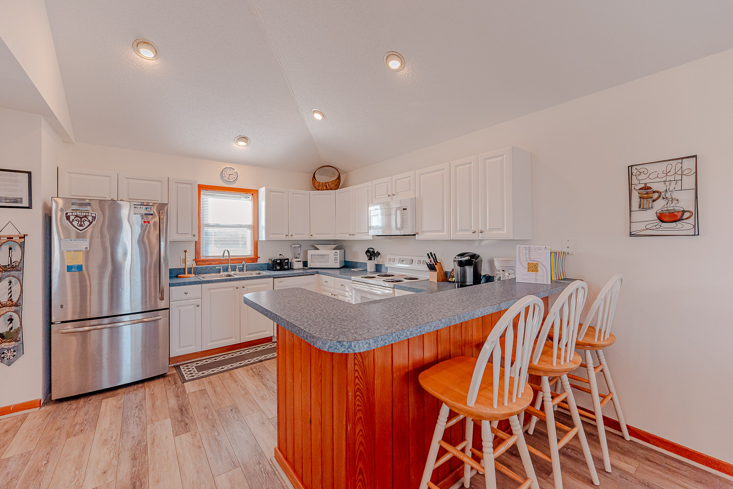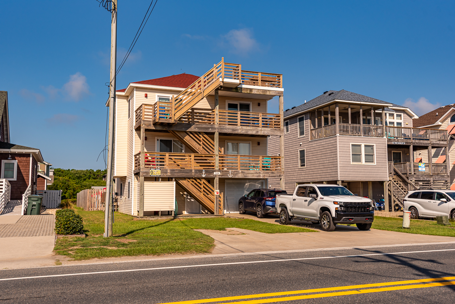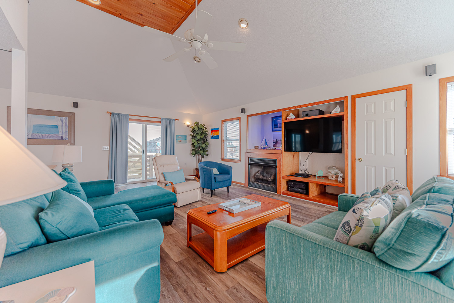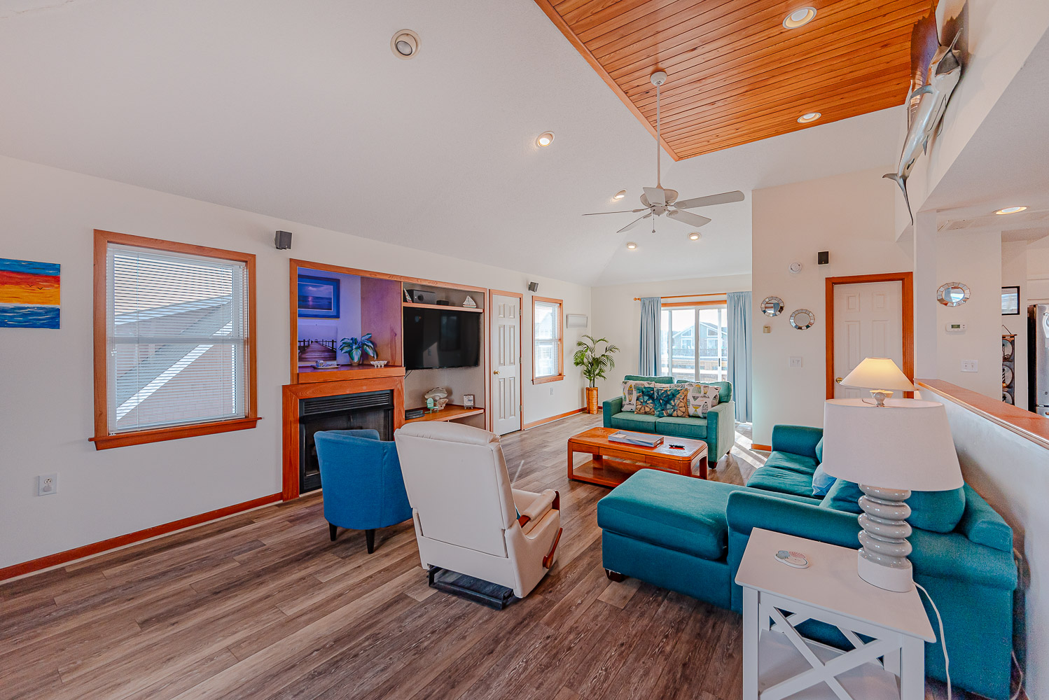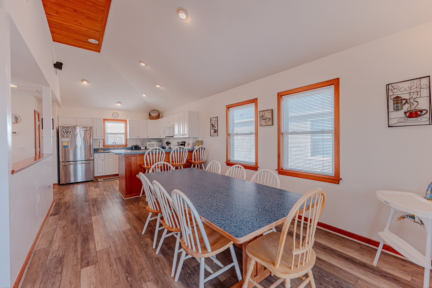Top Level: Spacious Living Area, Large TV; Dining Area w/Two (2) Dining Table; Kitchen Area w/Stainless Steel Appliances, Bar Seating for Three (3); Hall Bath, Access to Back Sun Deck w/Furniture, Picnic Table, Steps to Lower Levels, Access to Front Covered Deck w/Table and Chairs, Horizon Ocean Views, and Steps to Observation Deck w/Ocean Views.