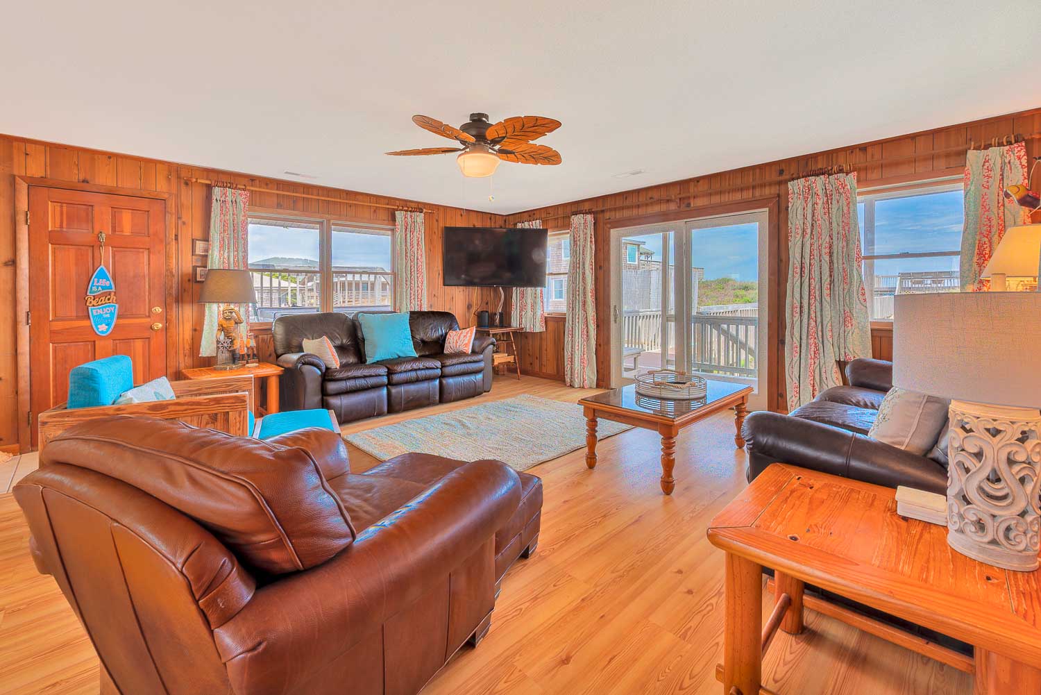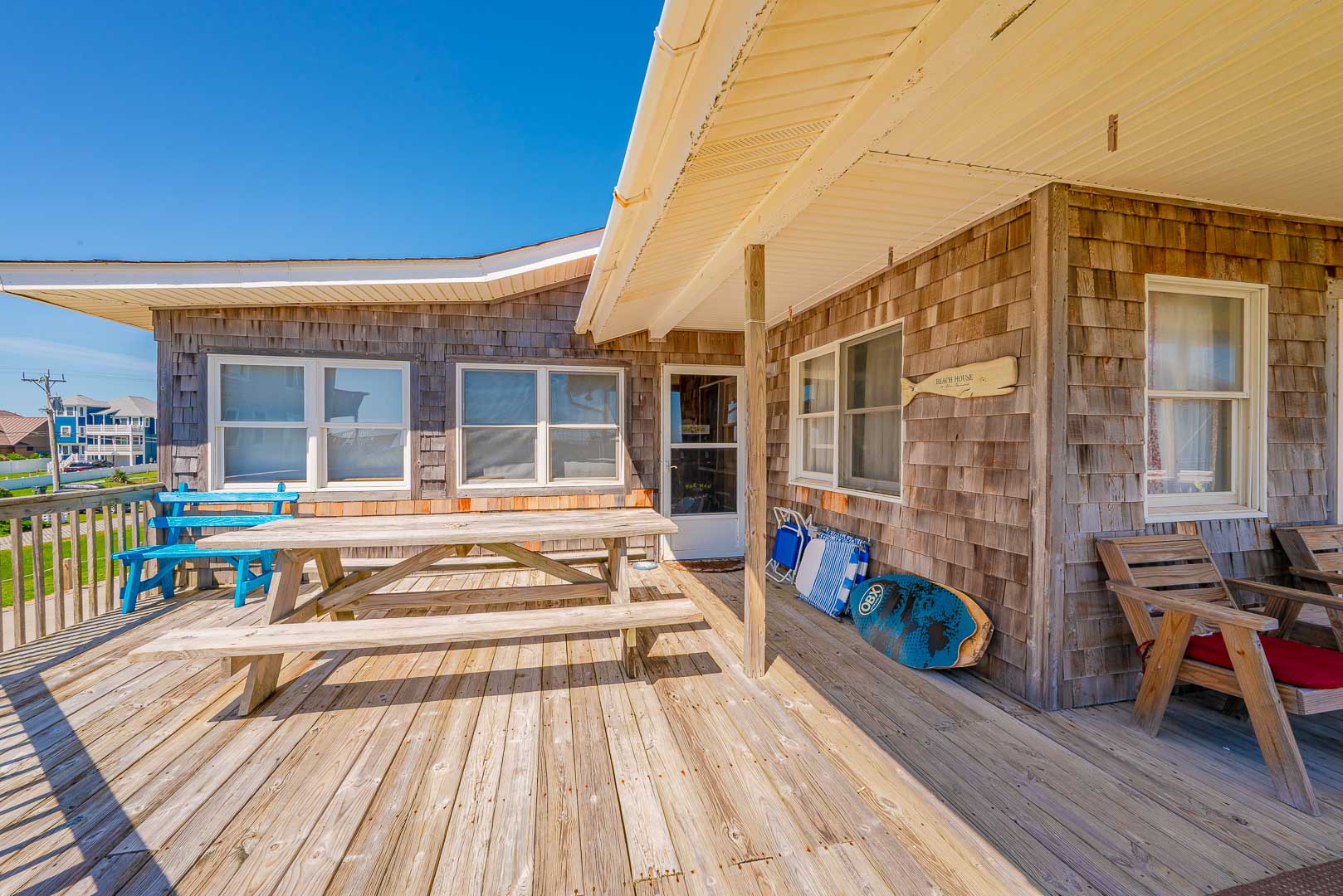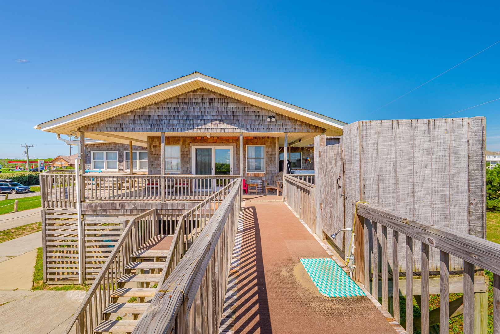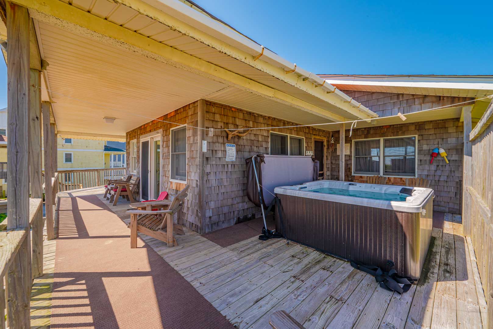 Main Level: Living/Dining/Kitchen Area, TV, 4 Bedrooms (2 w/Queens, TV; 1 w/2 Singles, TV; 1 w/2 Bunk Sets, TV), 2 Full Baths, Oceanfront Sun Room w/Furniture, Covered Deck w/Hot Tub, Picnic Table, Walkway to Beach w/Dune Top Deck, and Enclosed Outside Shower.