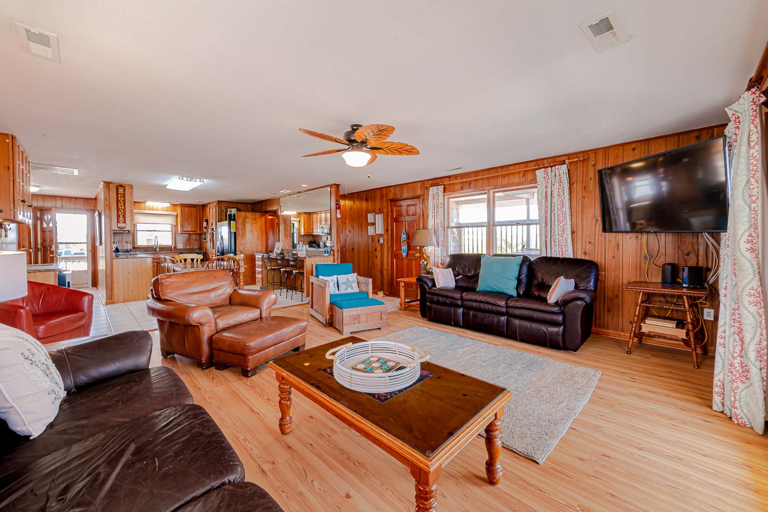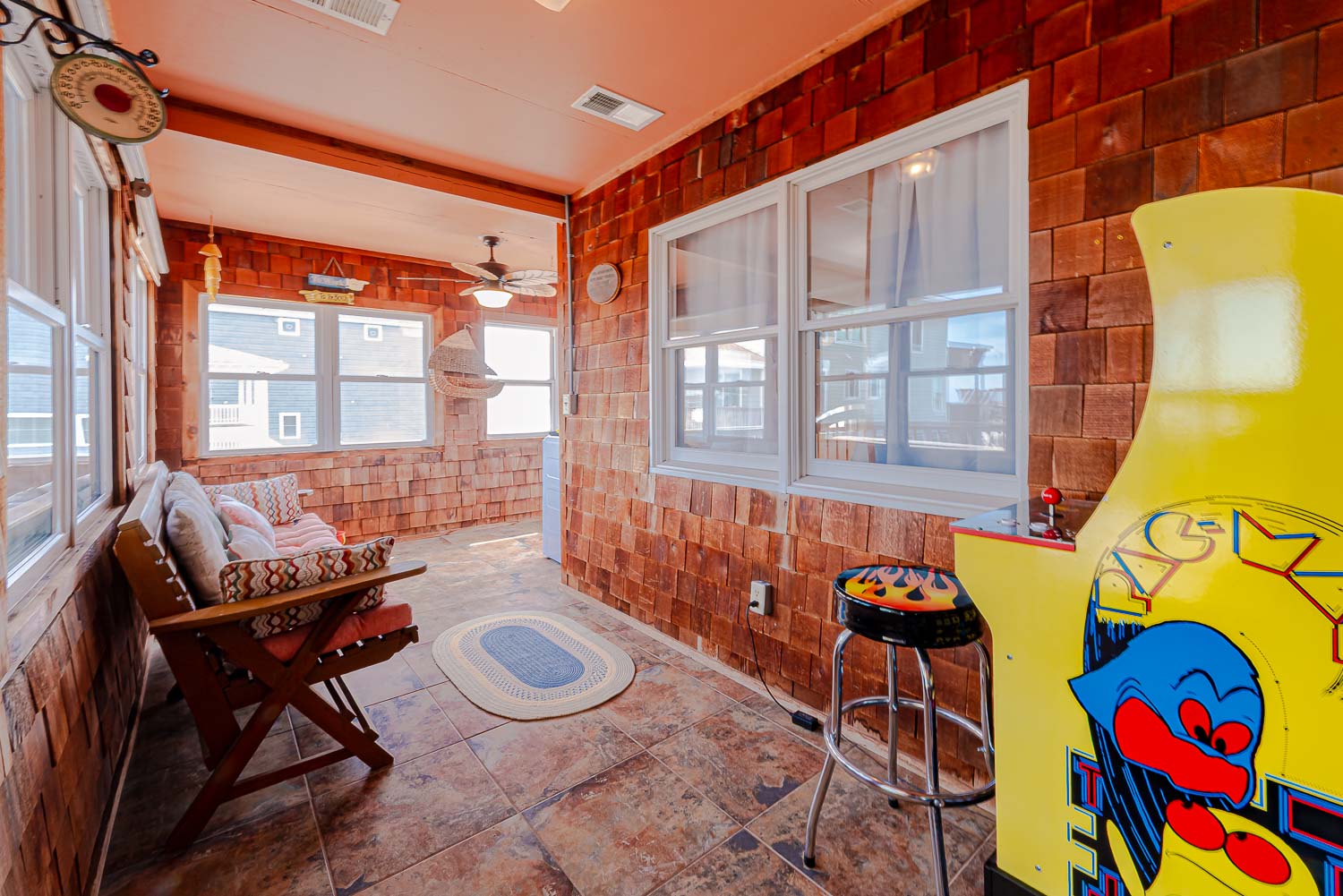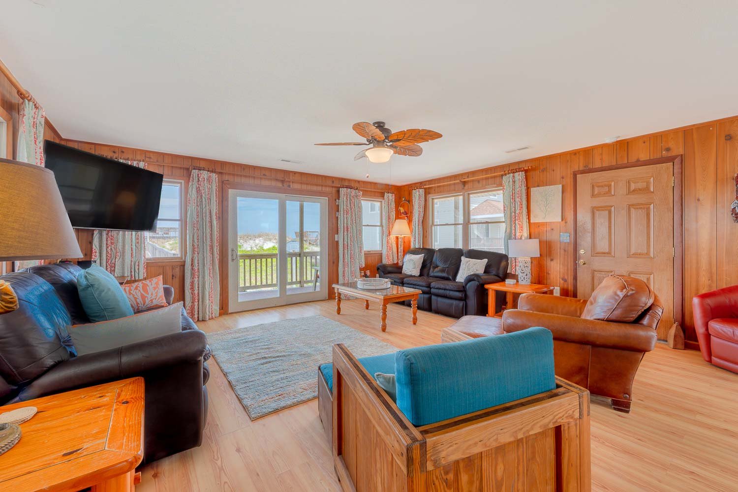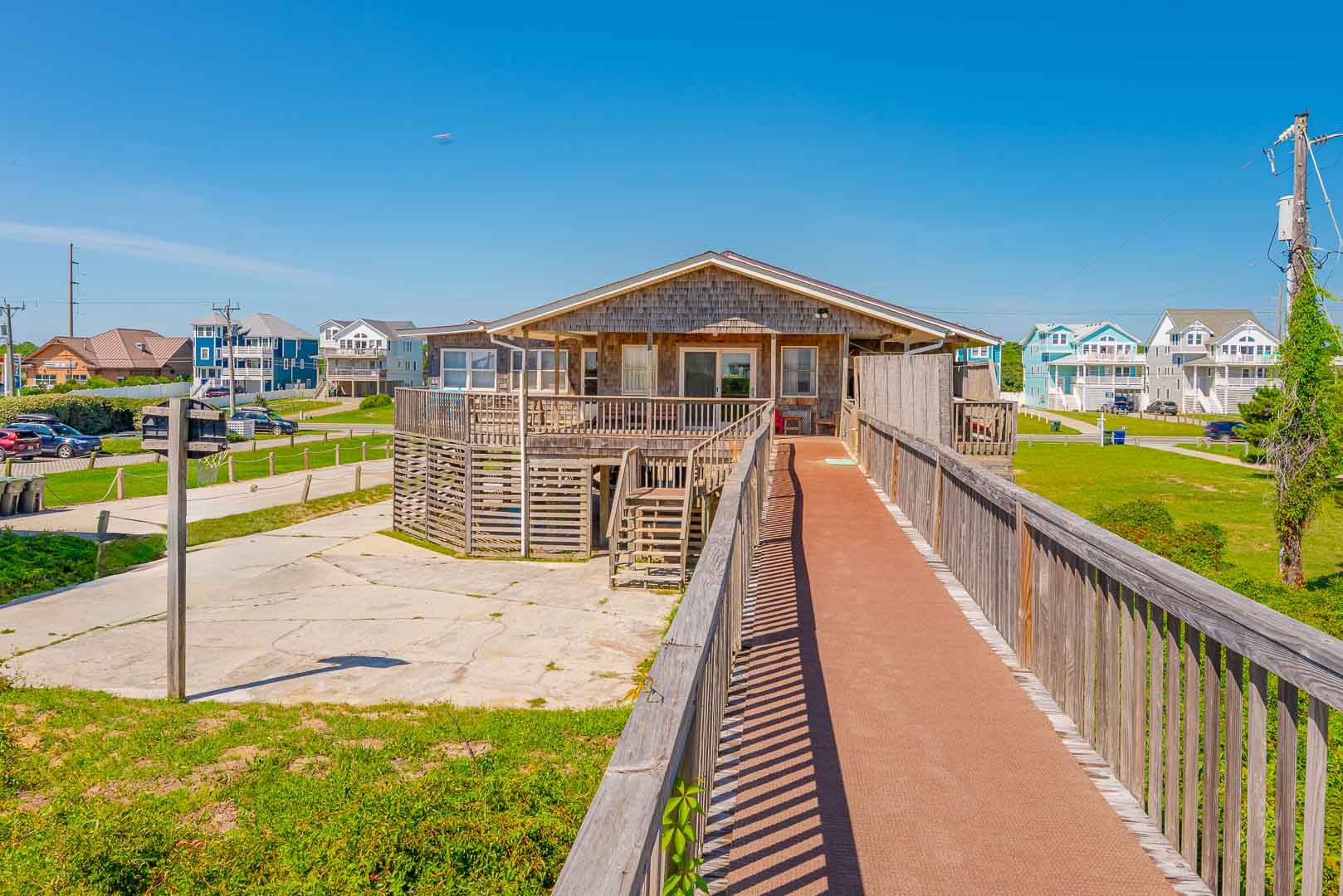 Main Level: Living/Dining/Kitchen Area, TV, 4 Bedrooms (2 w/Queens, TV; 1 w/2 Singles, TV; 1 w/2 Bunk Sets, TV), 2 Full Baths, Oceanfront Sun Room w/Furniture, Covered Deck w/Hot Tub, Picnic Table, Walkway to Beach w/Dune Top Deck, and Enclosed Outside Shower.