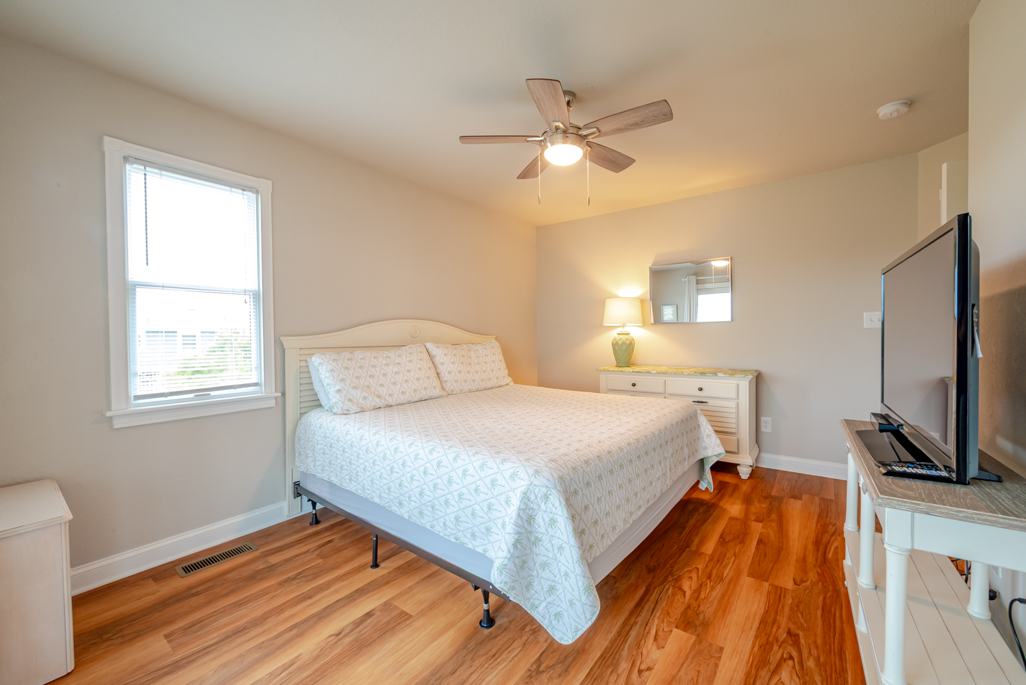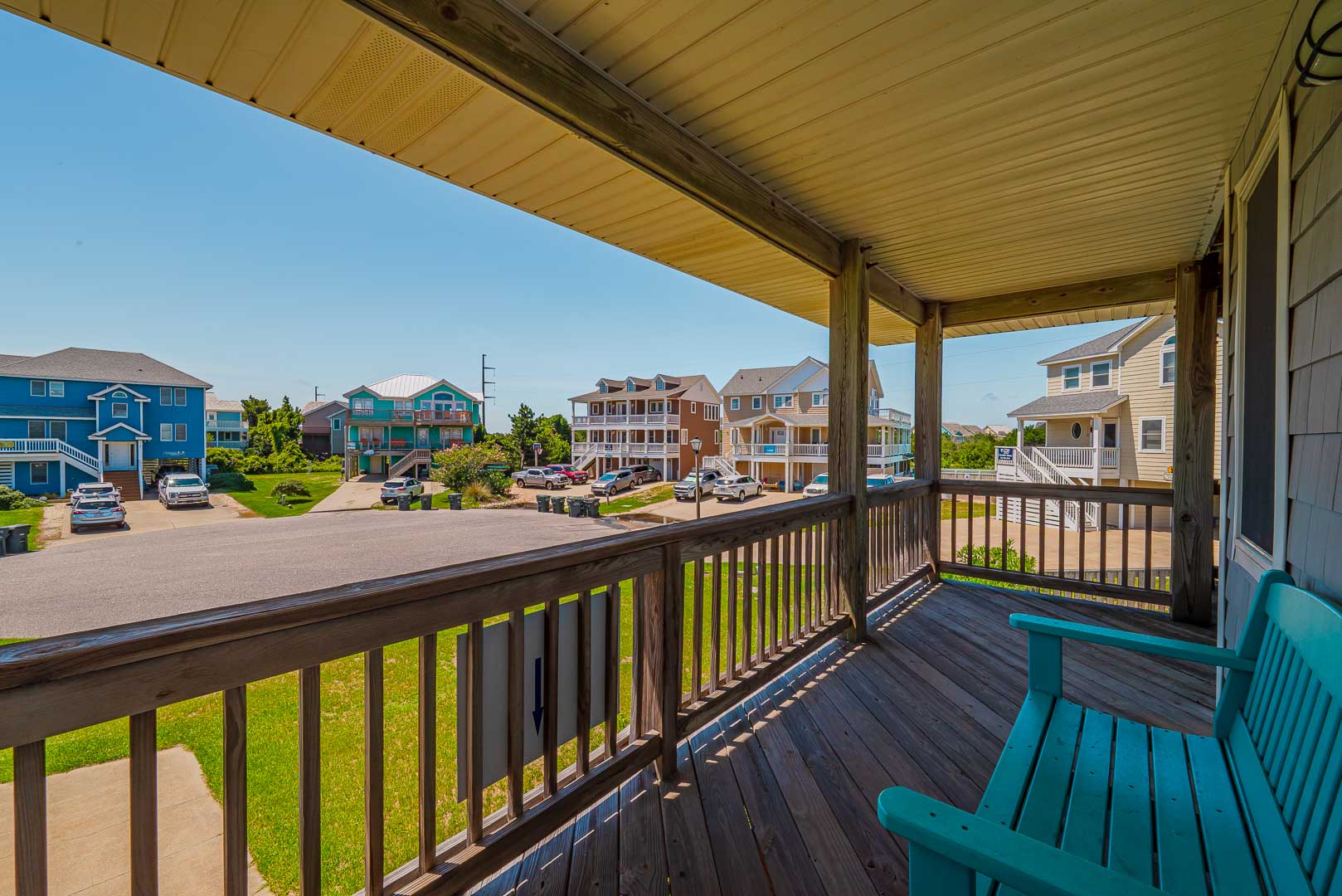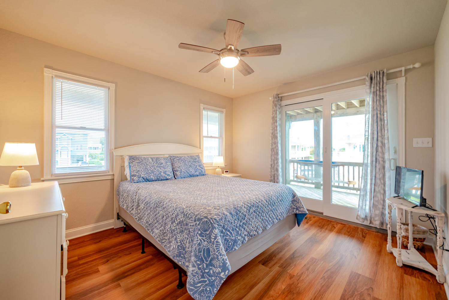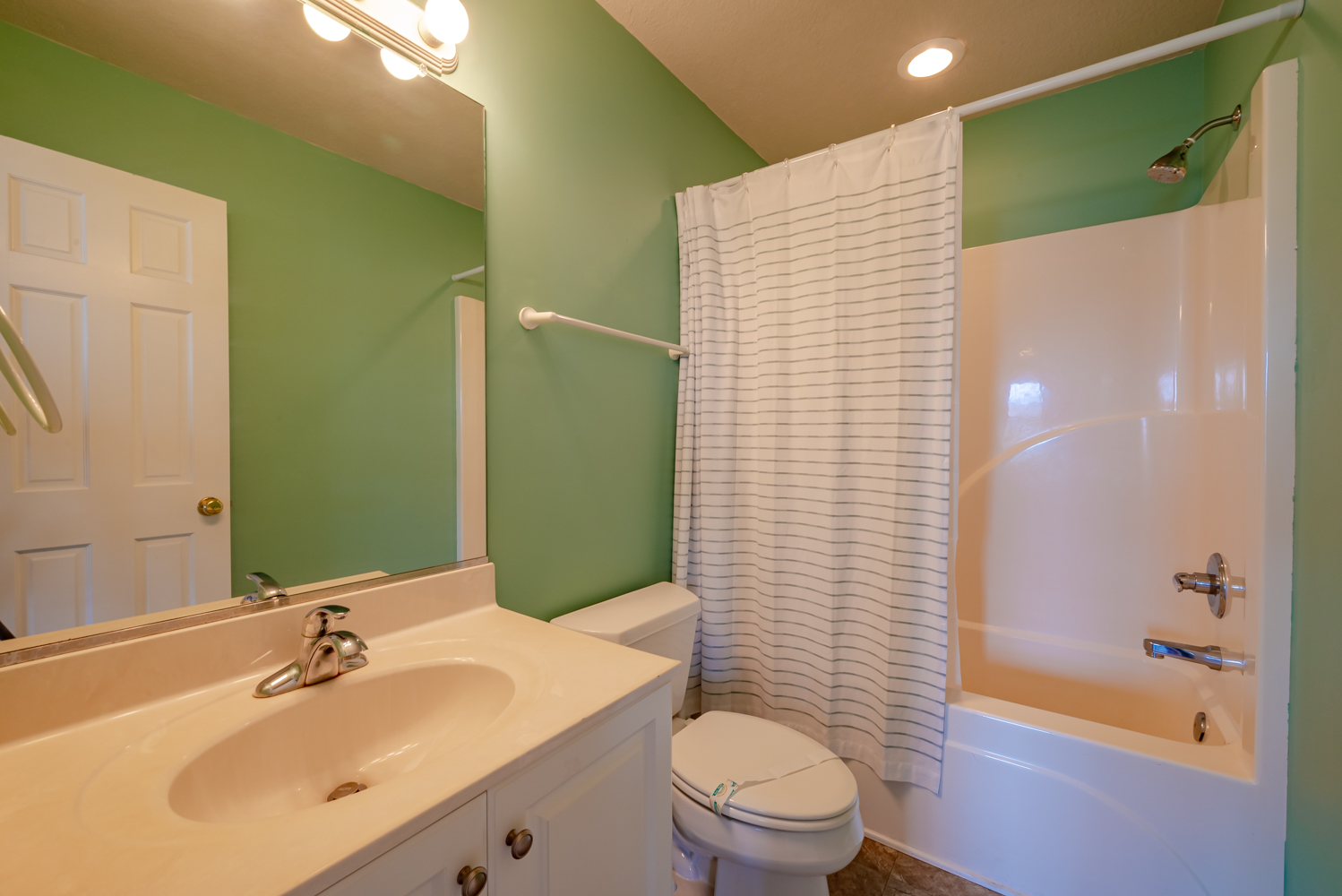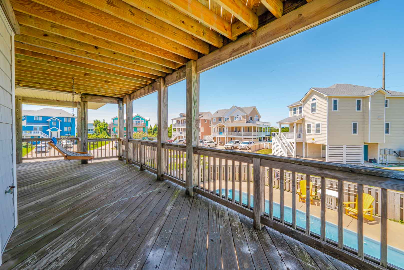 Mid Level: Den w/Large TV, Card Table, Full Hall Bath w/Tub/Shower, 3 Bedrooms (Private Suite w/King, TV, Full Bath w/Walk-In Shower; 1 w/King, TV; 1 w/Queen, TV), Full Hall Bath w/Tub/Shower, and Wrap Around Covered Deck w/Hammock Chairs and Deck Furniture Over Looking Pool Area.