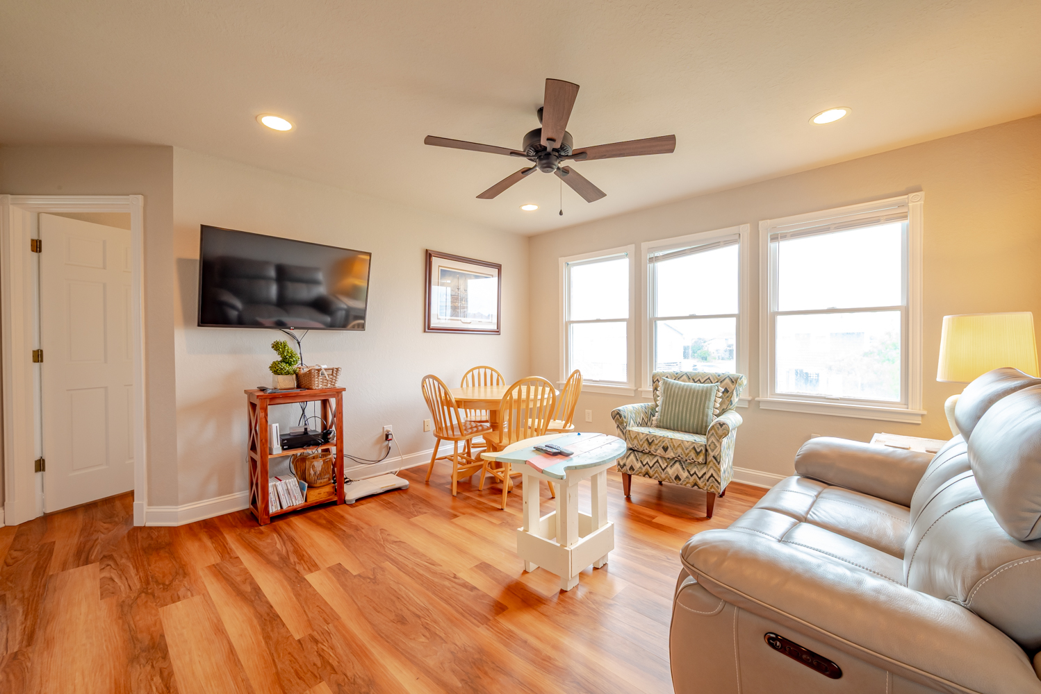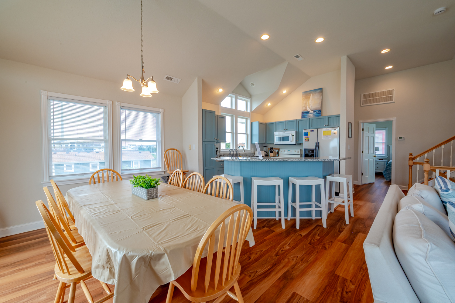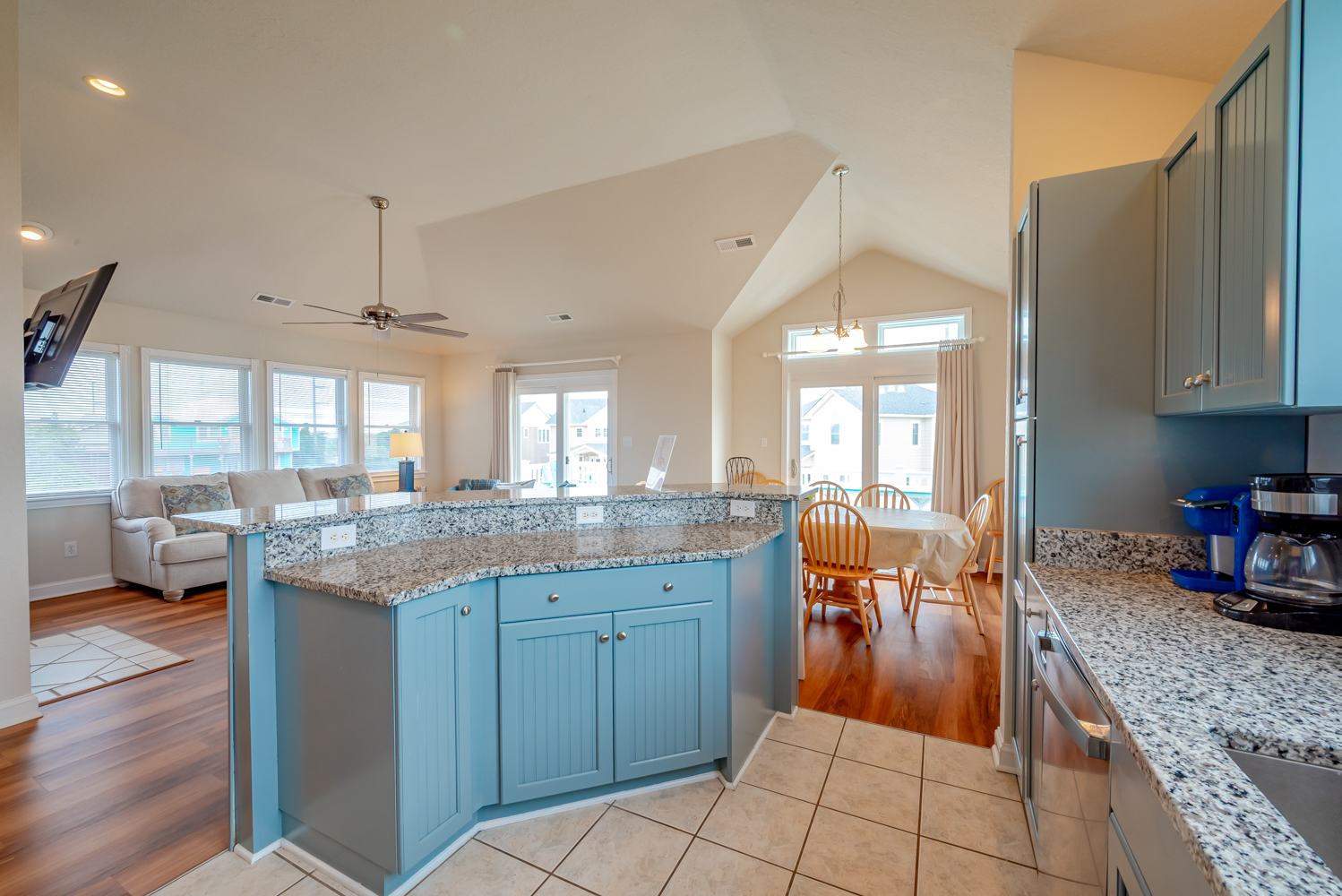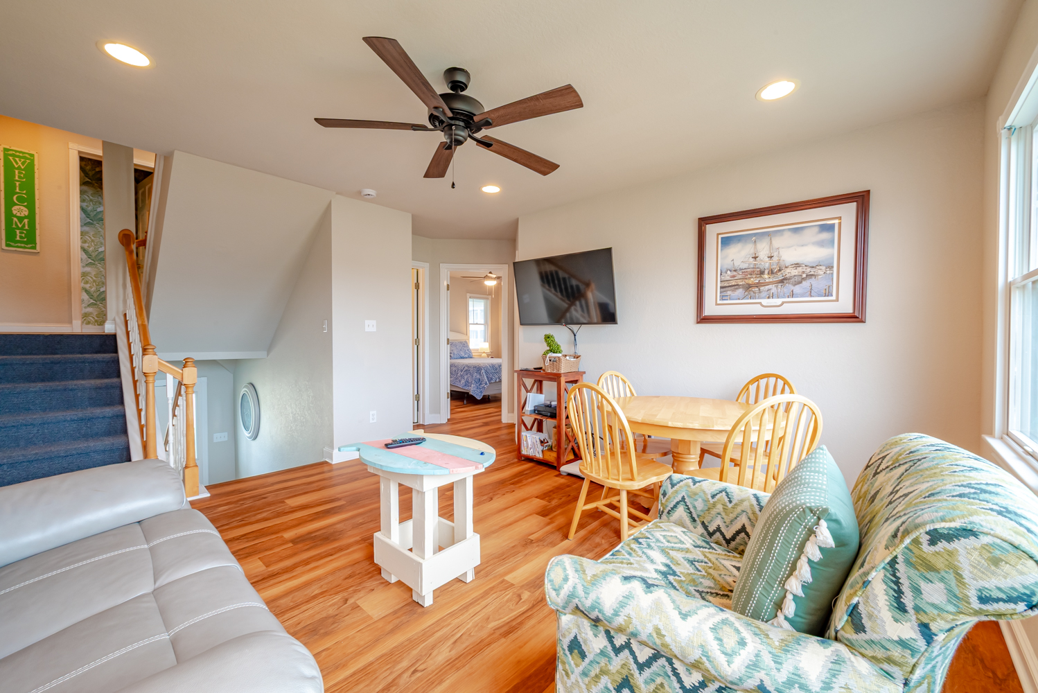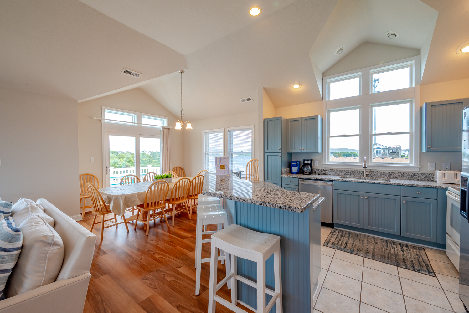 Top Level: Living Area w/TV/DVD, Access to Sun Deck w/Deck Furniture; Dining Area w/Seating for Eight (8); Fully Equipped Kitchen Area, Granite Counter Tops, Island Bar Seating for Four (4); Half Bath, Steps to Ship’s Watch Sitting Area. Private Suite w/King, TV, Full Bath w/Jet Tub, Walk-In Shower, and Access to Private Sun Deck.