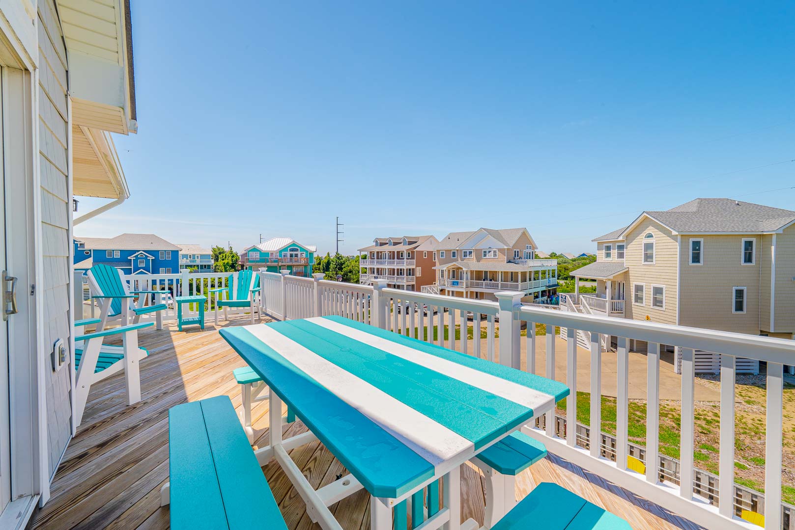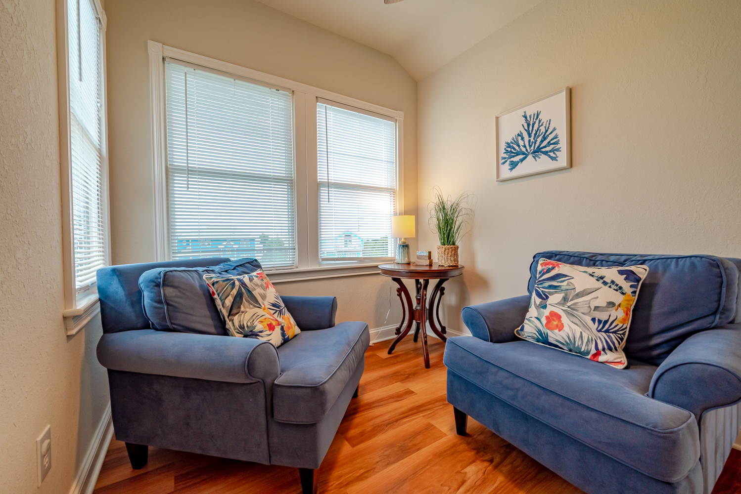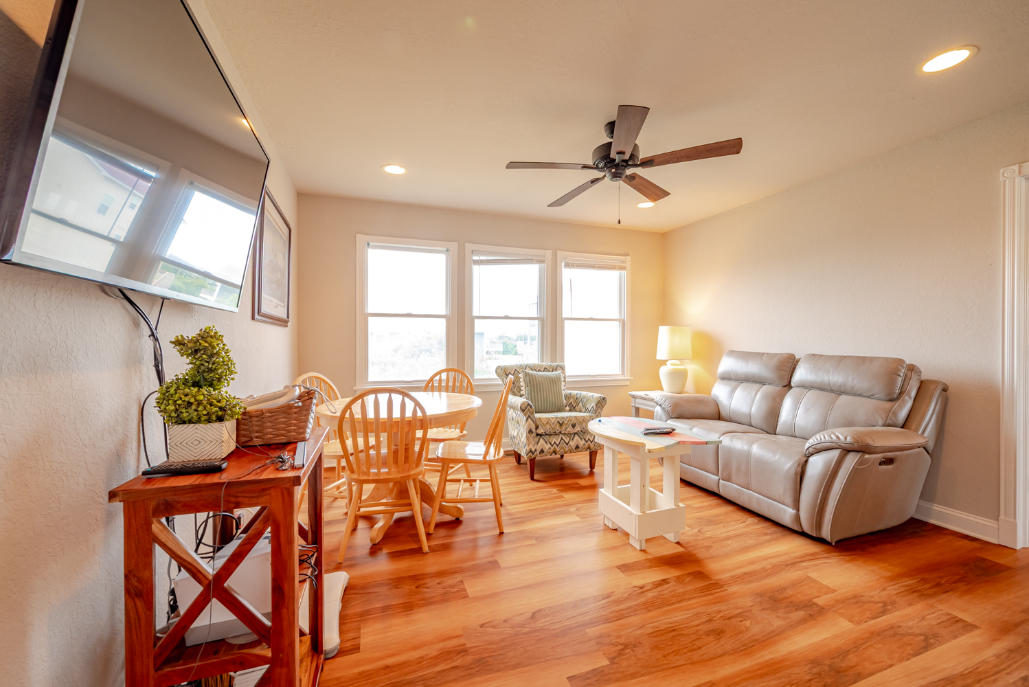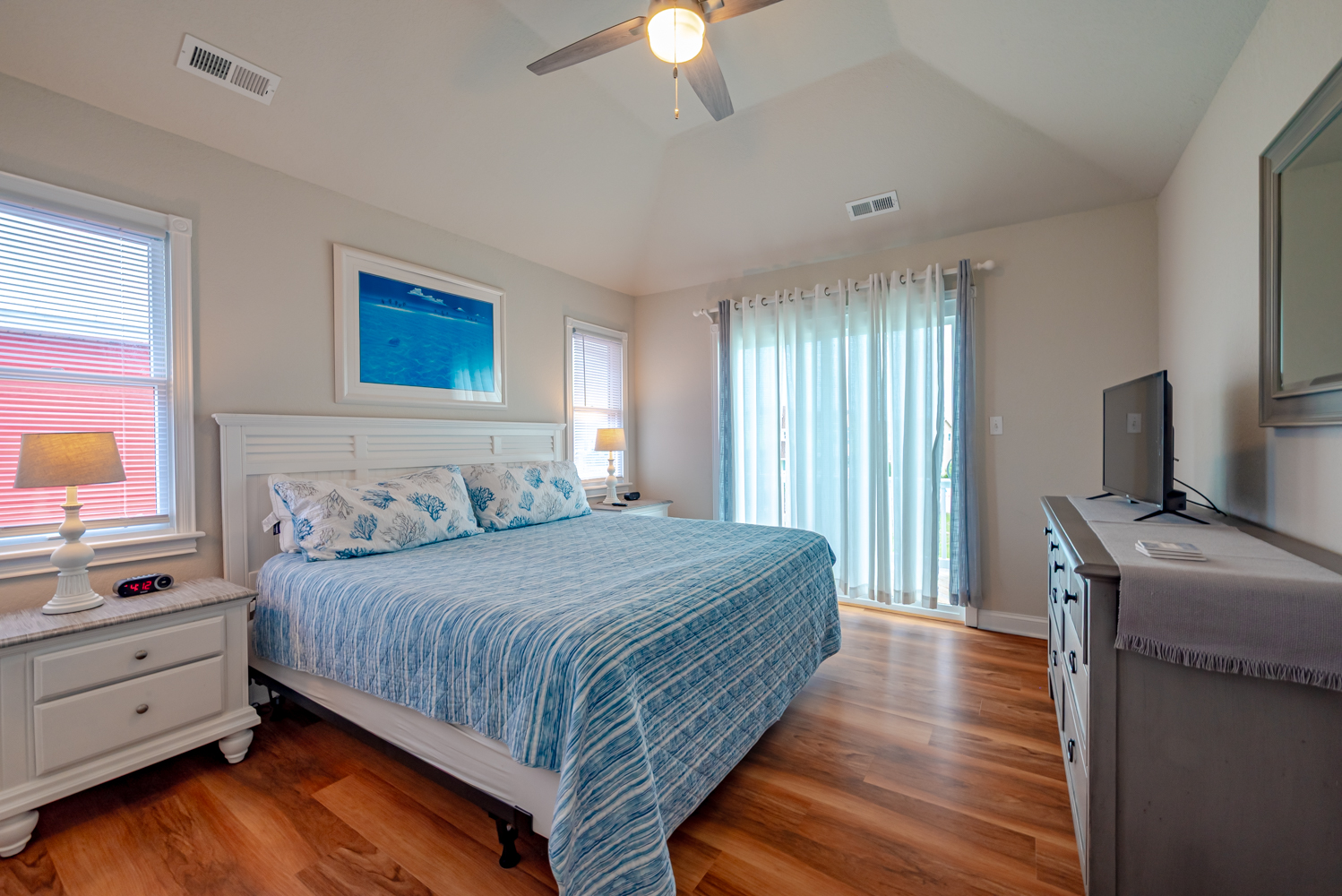 Top Level: Living Area w/TV/DVD, Access to Sun Deck w/Deck Furniture; Dining Area w/Seating for Eight (8); Fully Equipped Kitchen Area, Granite Counter Tops, Island Bar Seating for Four (4); Half Bath, Steps to Ship’s Watch Sitting Area. Private Suite w/King, TV, Full Bath w/Jet Tub, Walk-In Shower, and Access to Private Sun Deck.