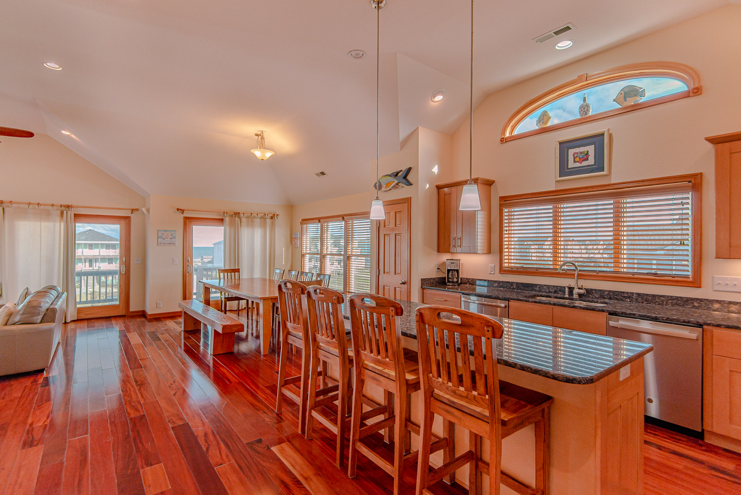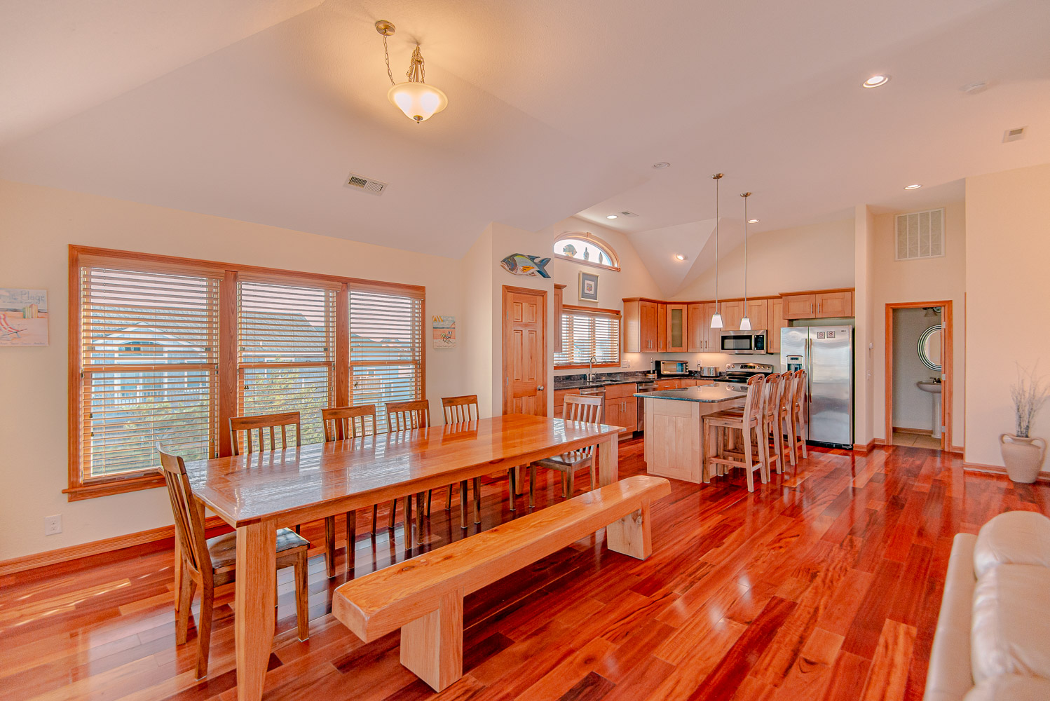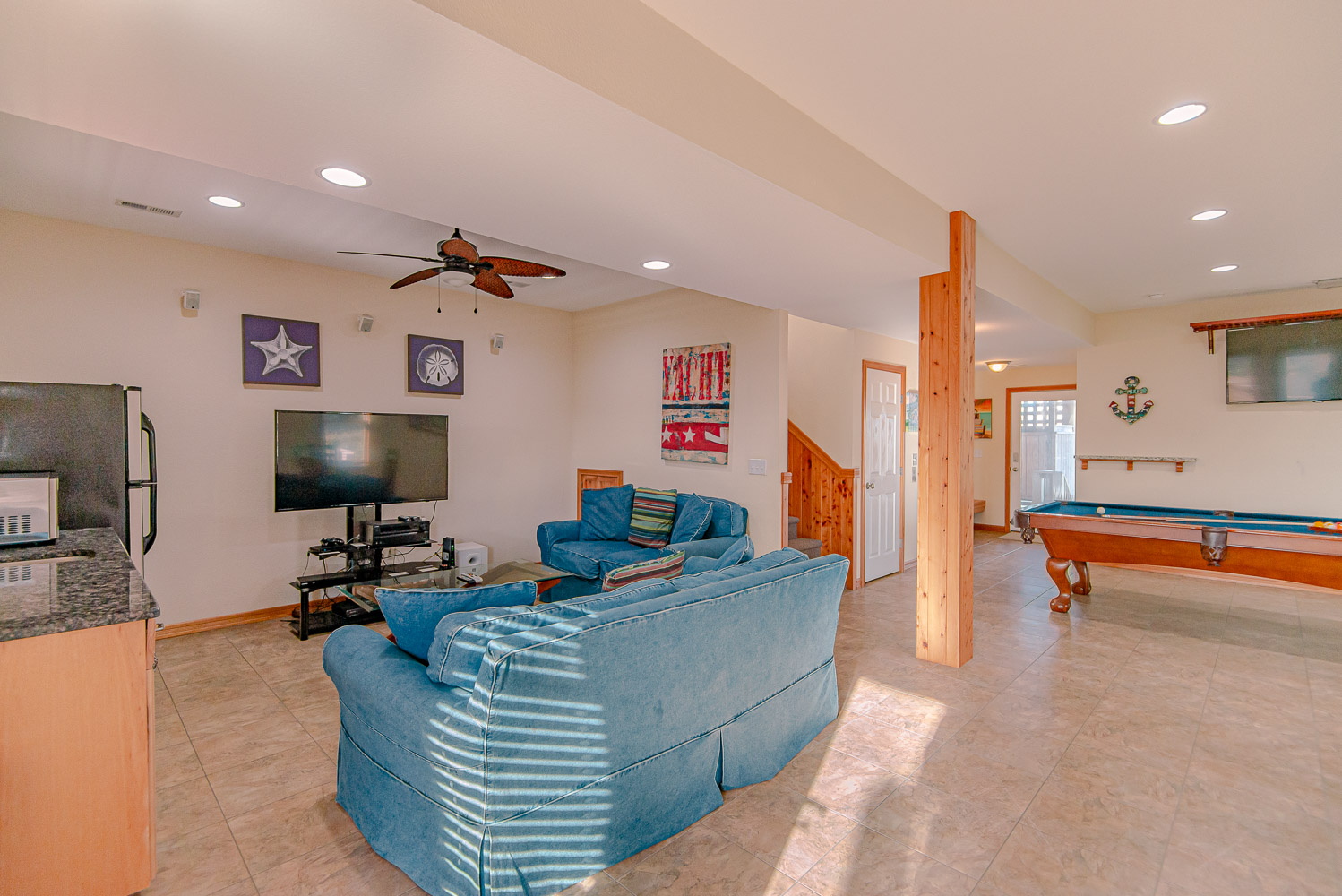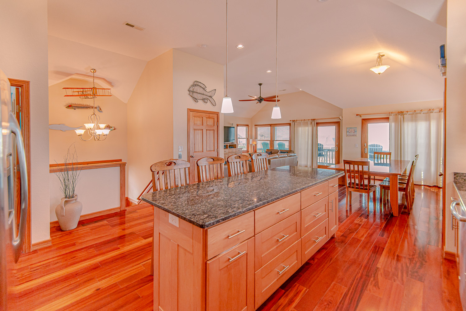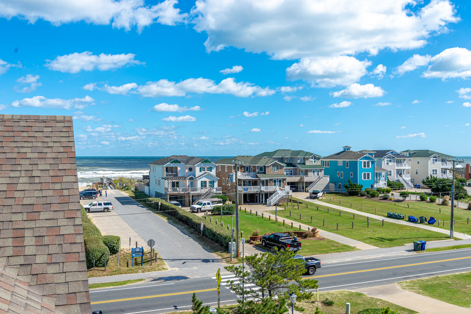 Top Level: Living Area, 50 inch Roku TV, Great Ocean Views, Large Farm Style Kitchen Table, Half Bath, Kitchen Area, Island Breakfast Bar w/Seating for Four (4), 2 Dishwashers, Full Size Refrigerator, Private Suite w/King, 32 Inch Roku TV, Full Bath w/Glass Tiled Walk-In Shower; Front Covered and Sun Deck w/Deck Furniture, Back Sun Deck Overlooking Pool Area, Deck Furniture, and Steps to Crow’s Nest w/Views of Ocean and Jockey's Ridge State Park.