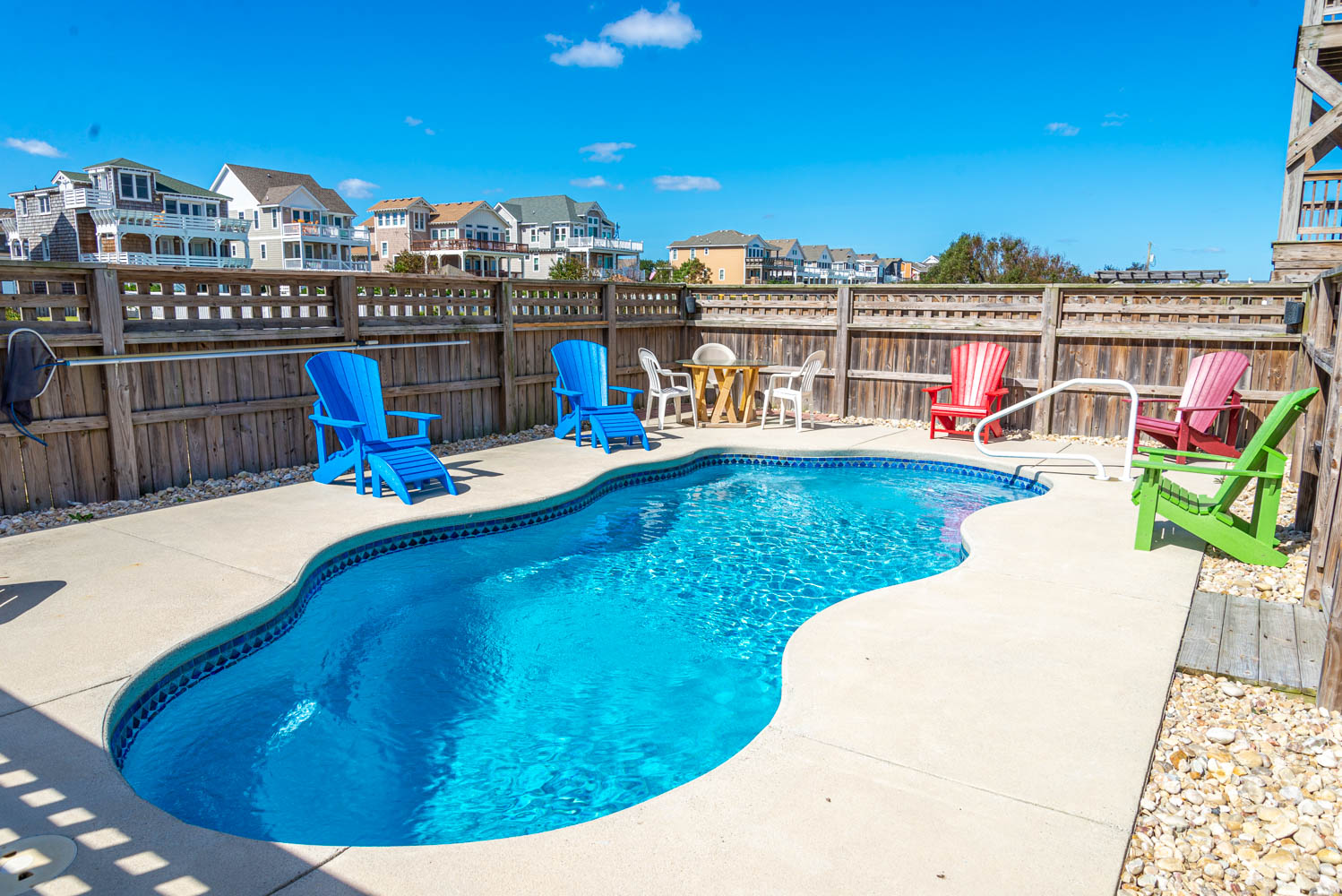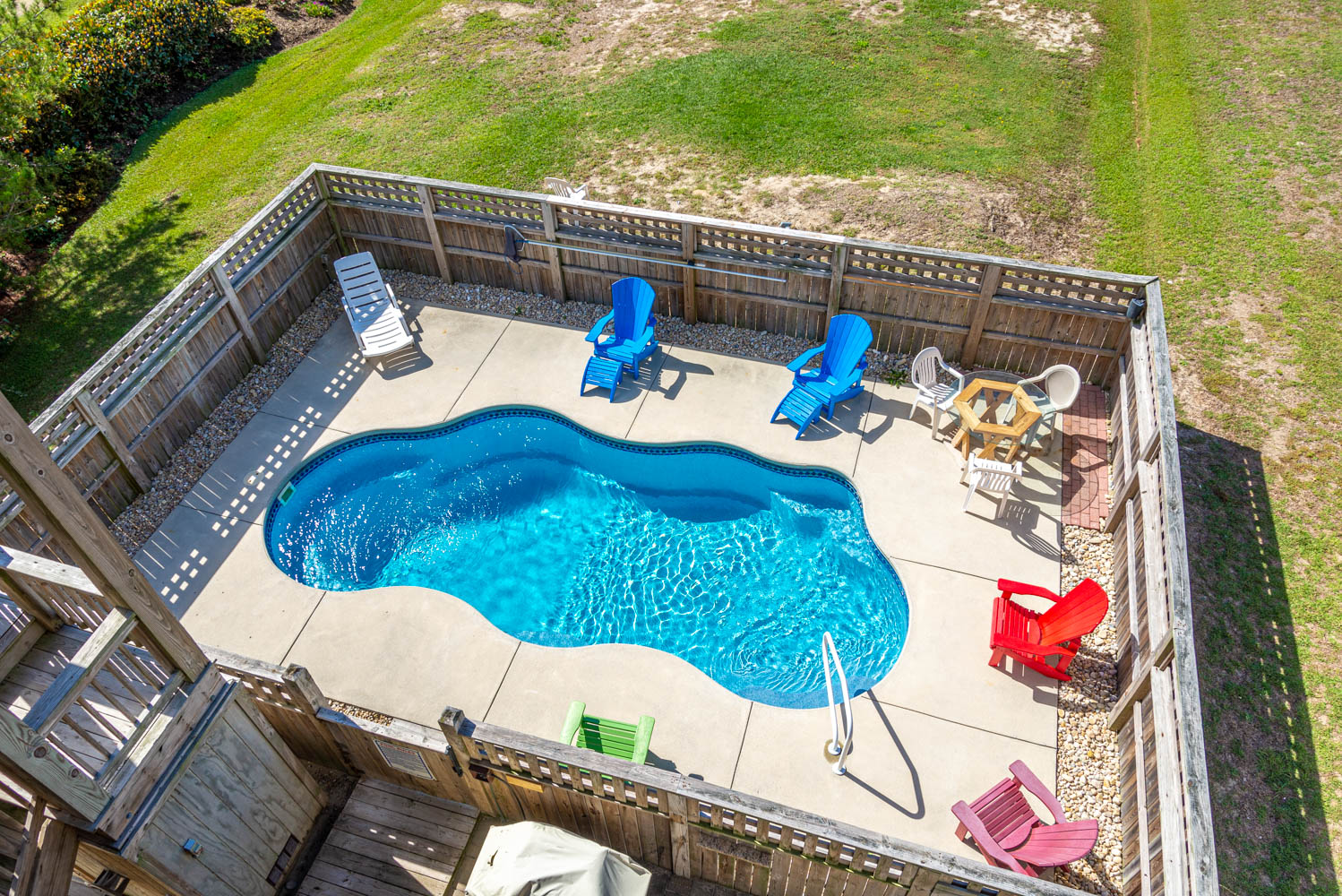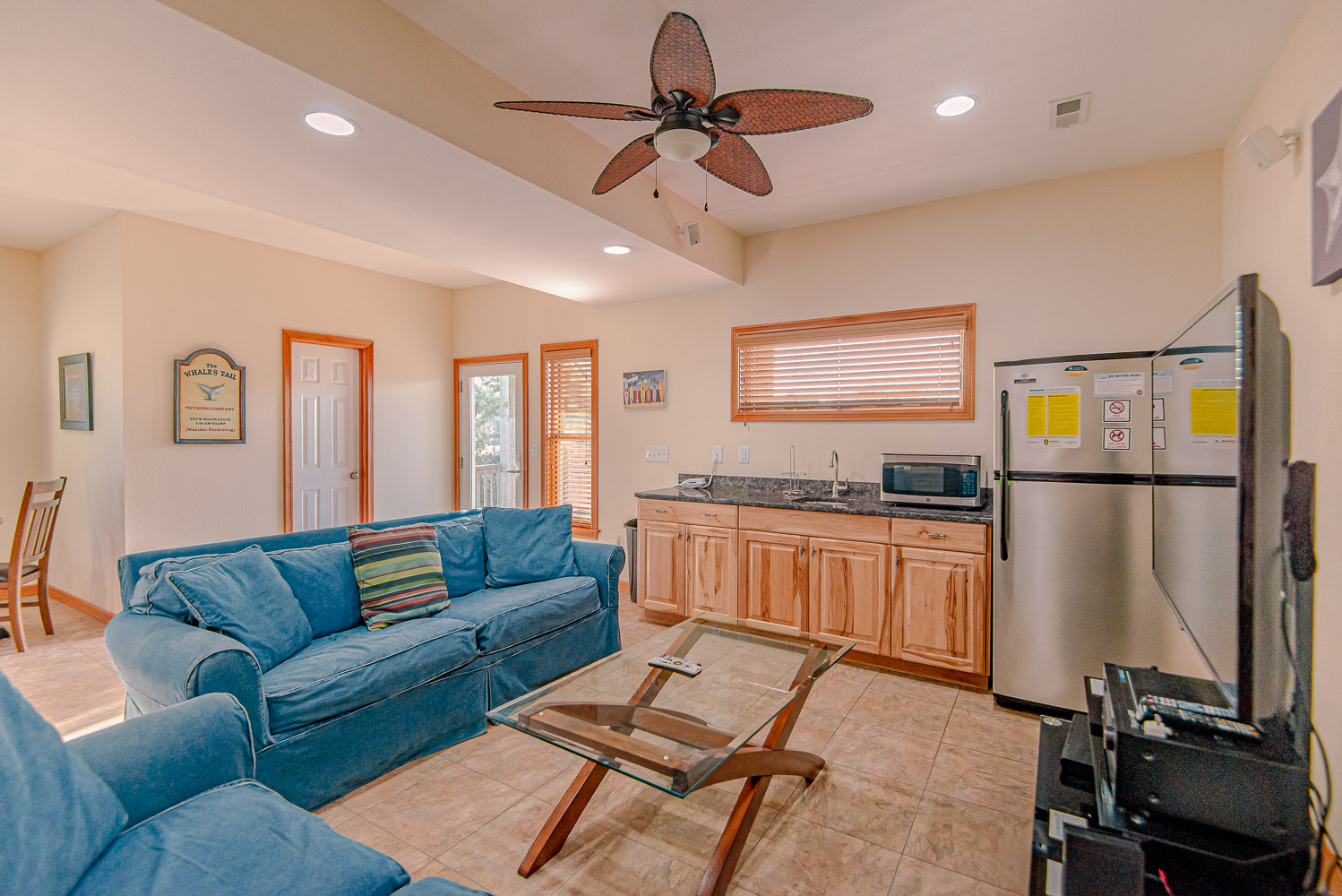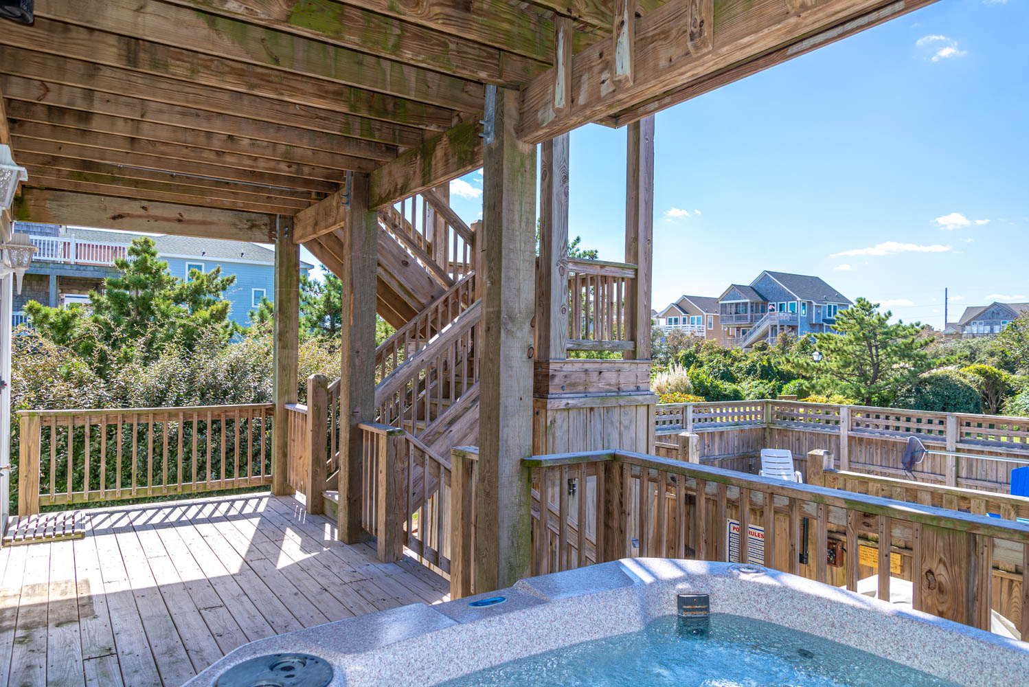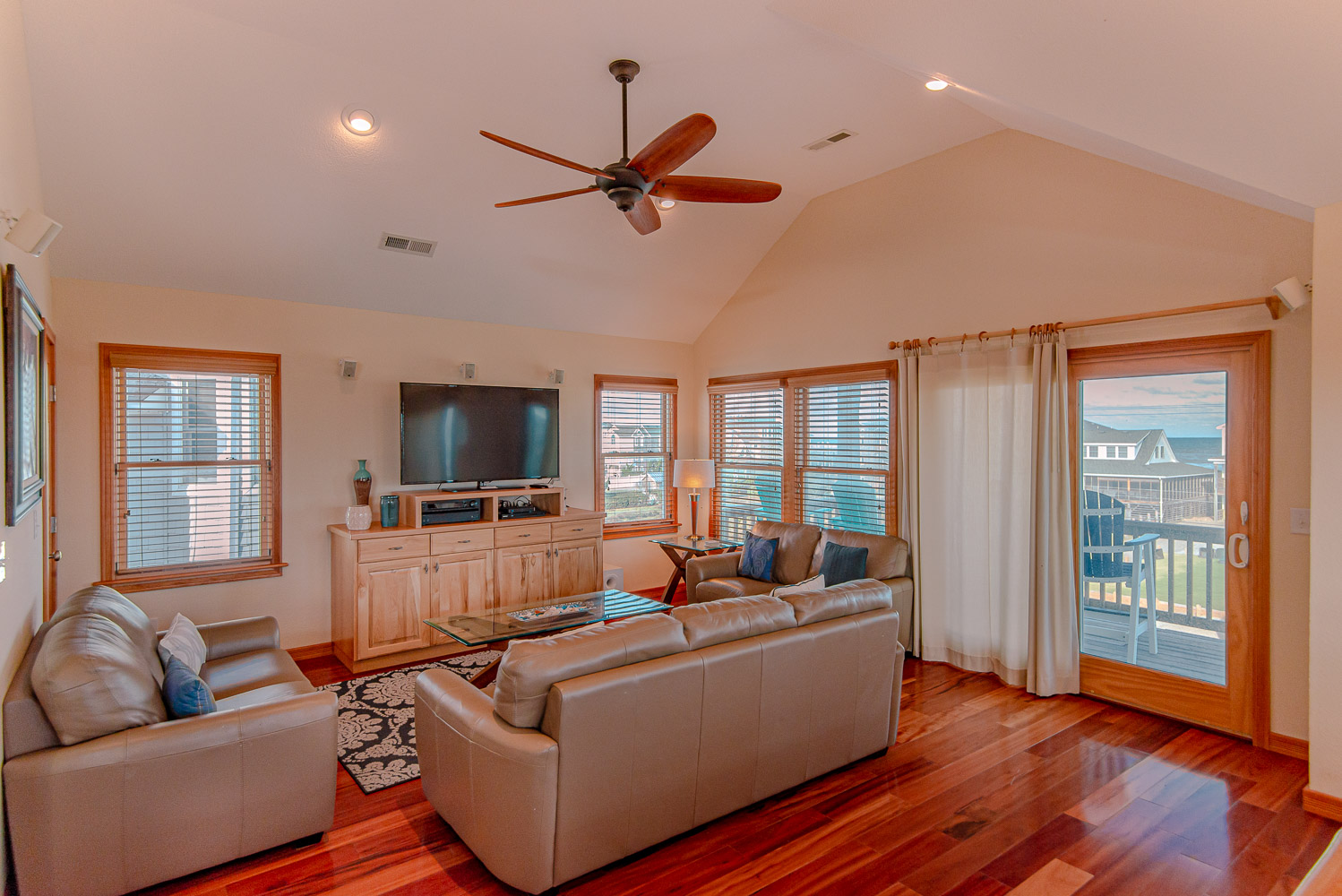Top Level: Living Area, 50 inch Roku TV, Great Ocean Views, Large Farm Style Kitchen Table, Half Bath, Kitchen Area, Island Breakfast Bar w/Seating for Four (4), 2 Dishwashers, Full Size Refrigerator, Private Suite w/King, 32 Inch Roku TV, Full Bath w/Glass Tiled Walk-In Shower; Front Covered and Sun Deck w/Deck Furniture, Back Sun Deck Overlooking Pool Area, Deck Furniture, and Steps to Crow’s Nest w/Views of Ocean and Jockey's Ridge State Park.