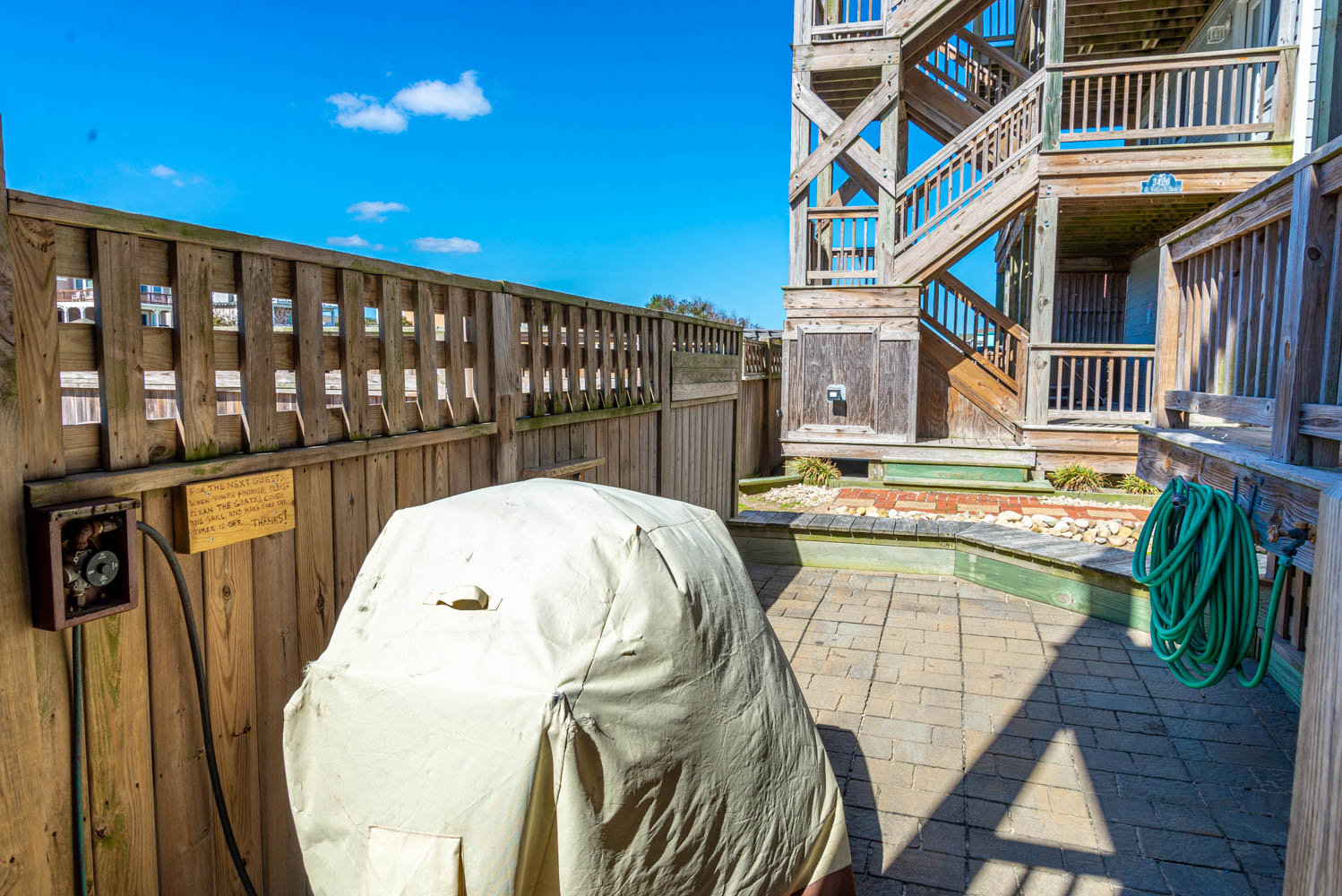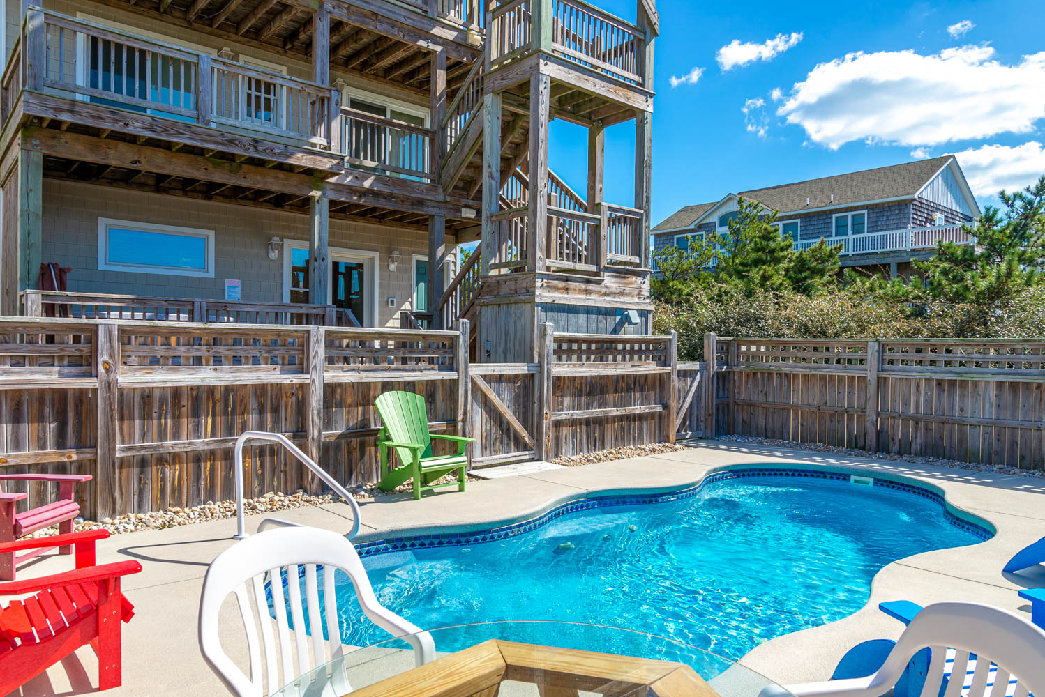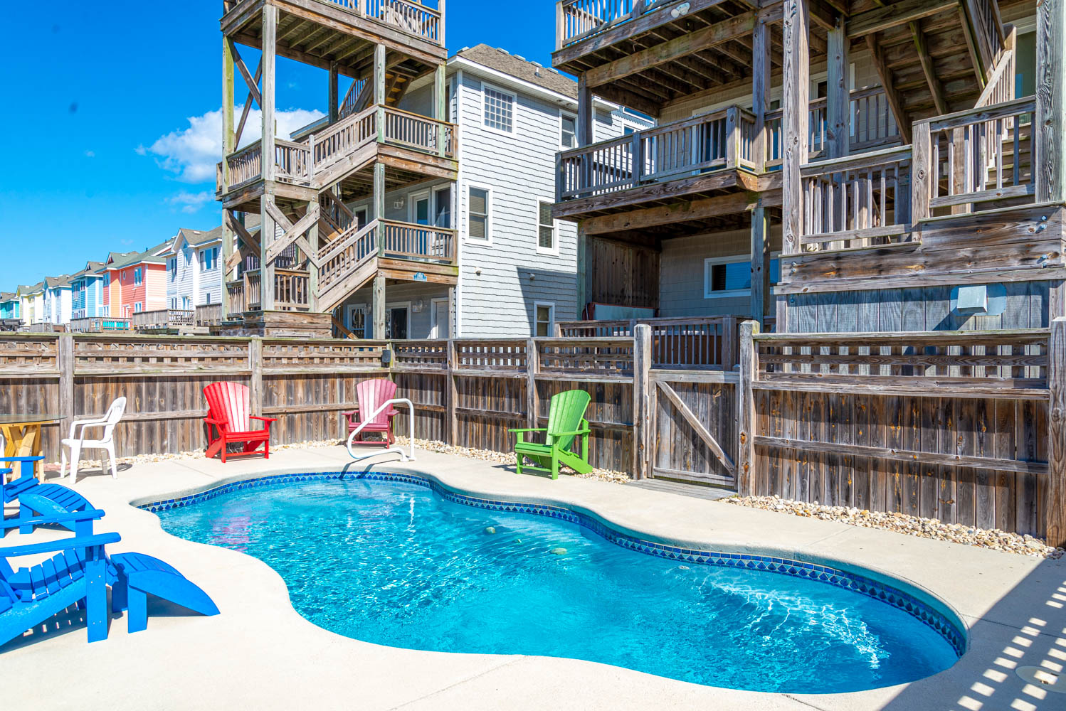 Ground Level: Parking for 5 Cars, 7 Steps to First Level Entry, Private Swimming Pool - Open Seasonally, Hot Tub, Enclosed Outside Shower, and Grilling Area.