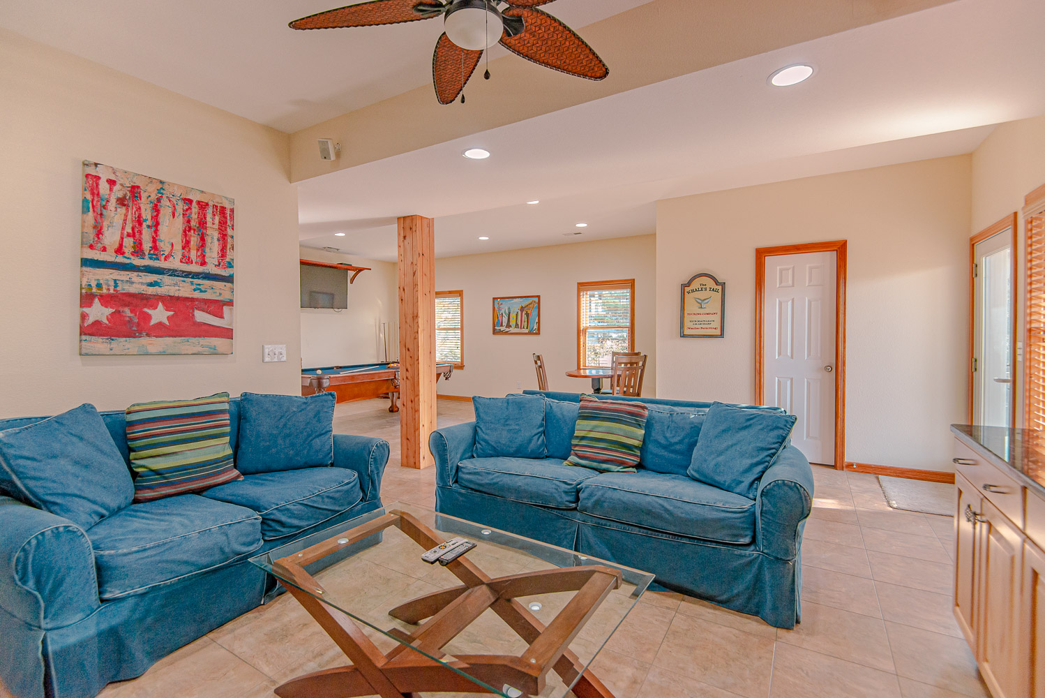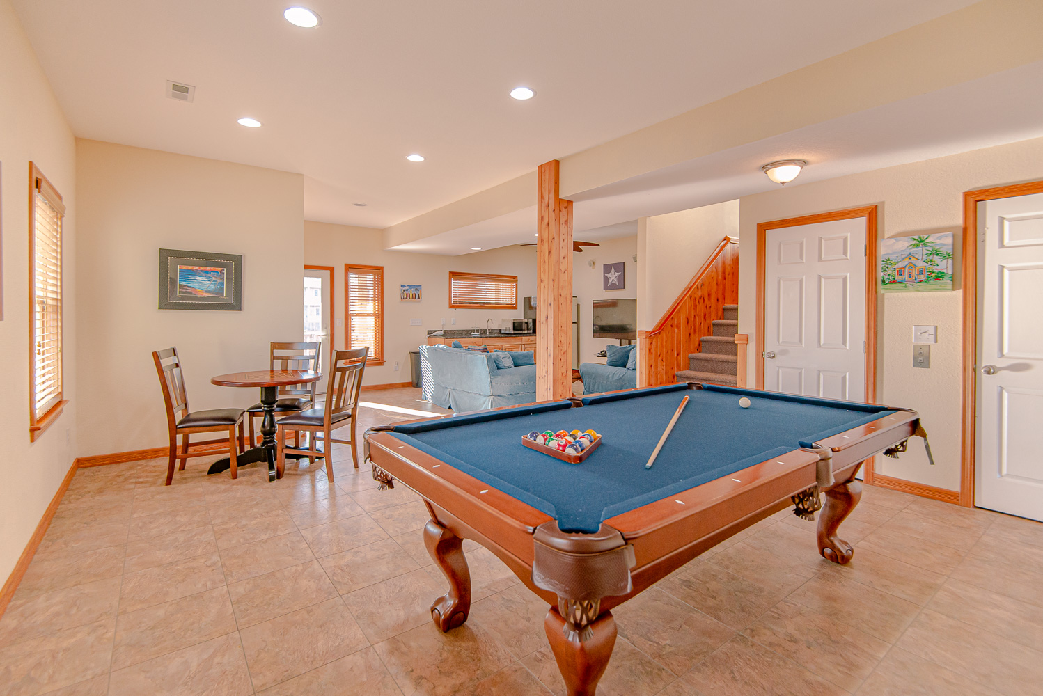 First Level: Elevator to Each Floor, Rec. Room, Queen Sleeper Sofa, 64 Inch Roku TV, Pool Table, 64 Inch Roku TV, Wet Bar, Full Size Refrigerator w/Ice Maker, Game/Computer Table, Full Bath w/Tub/Shower, and Access to Covered Area w/Hot Tub and Steps to Pool Area.