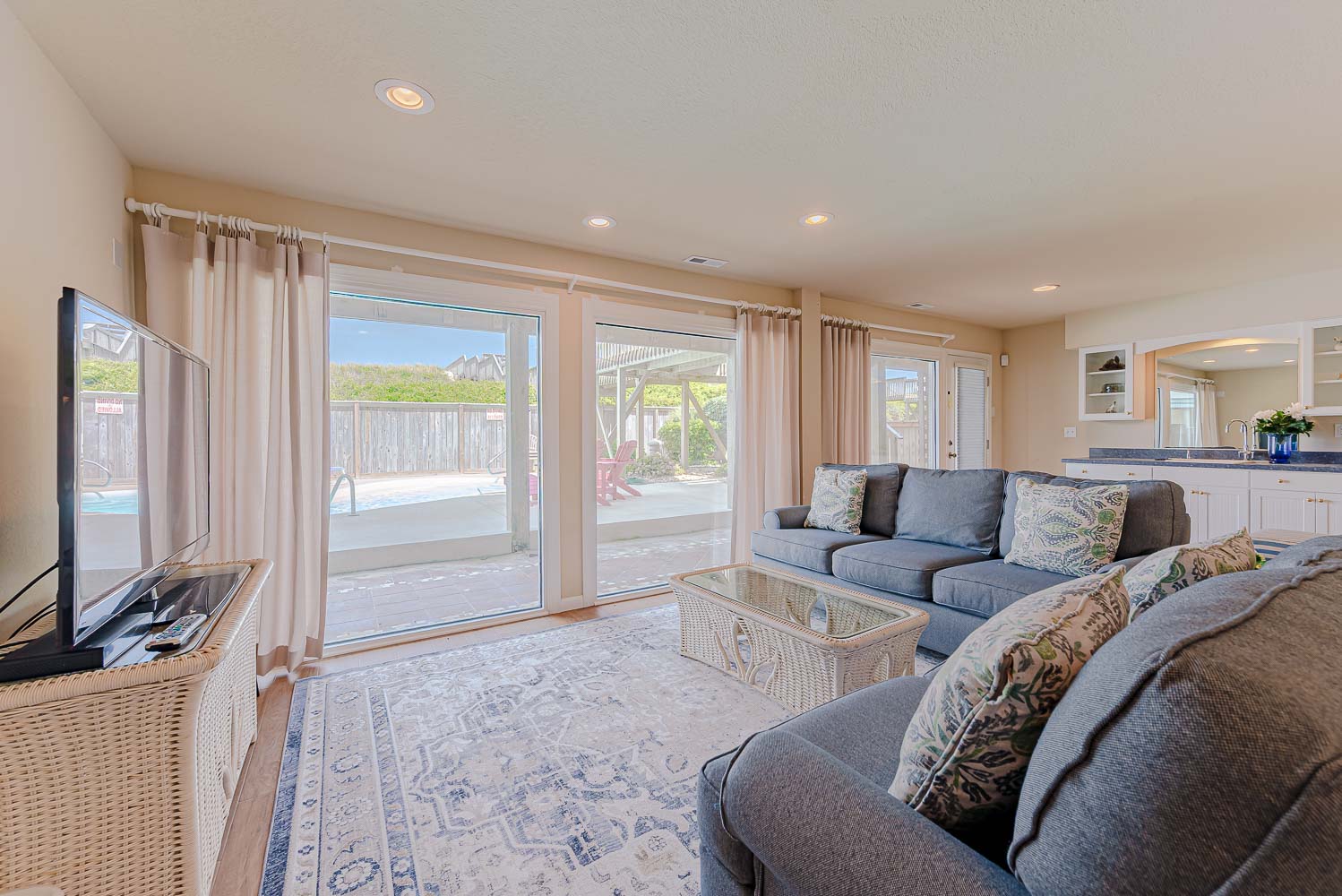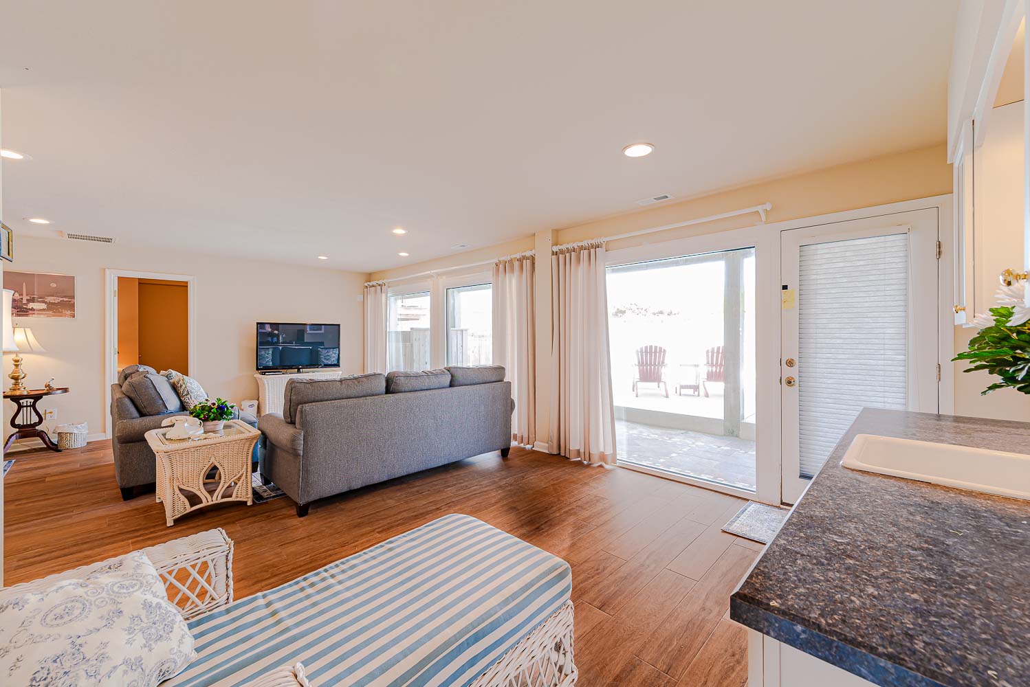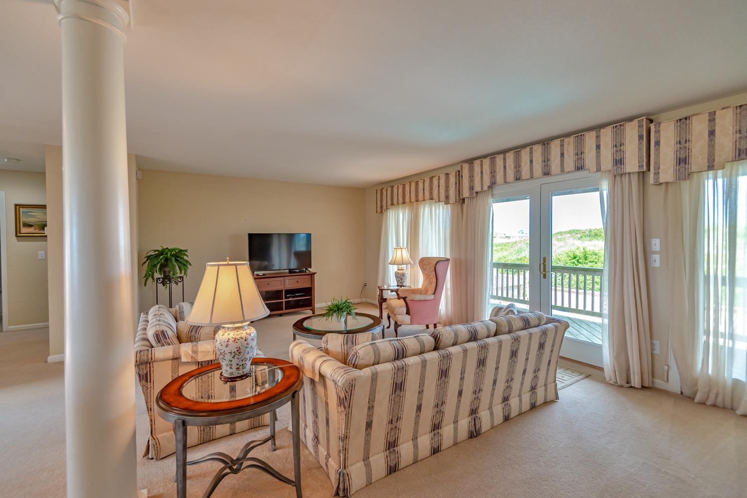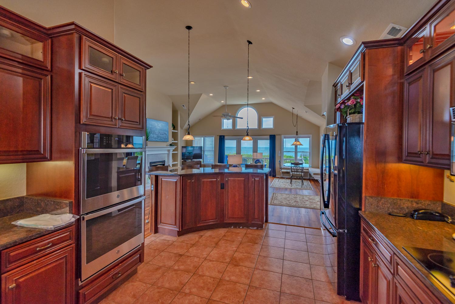 Mid Level: Large Den w/Flat Panel TV, Covered Deck, Ocean Views, 3 Bedrooms (Private Suite w/King, TV, Full Bath; 1 w/King, TV; 1 w/Queen), & Full Hall Bath.