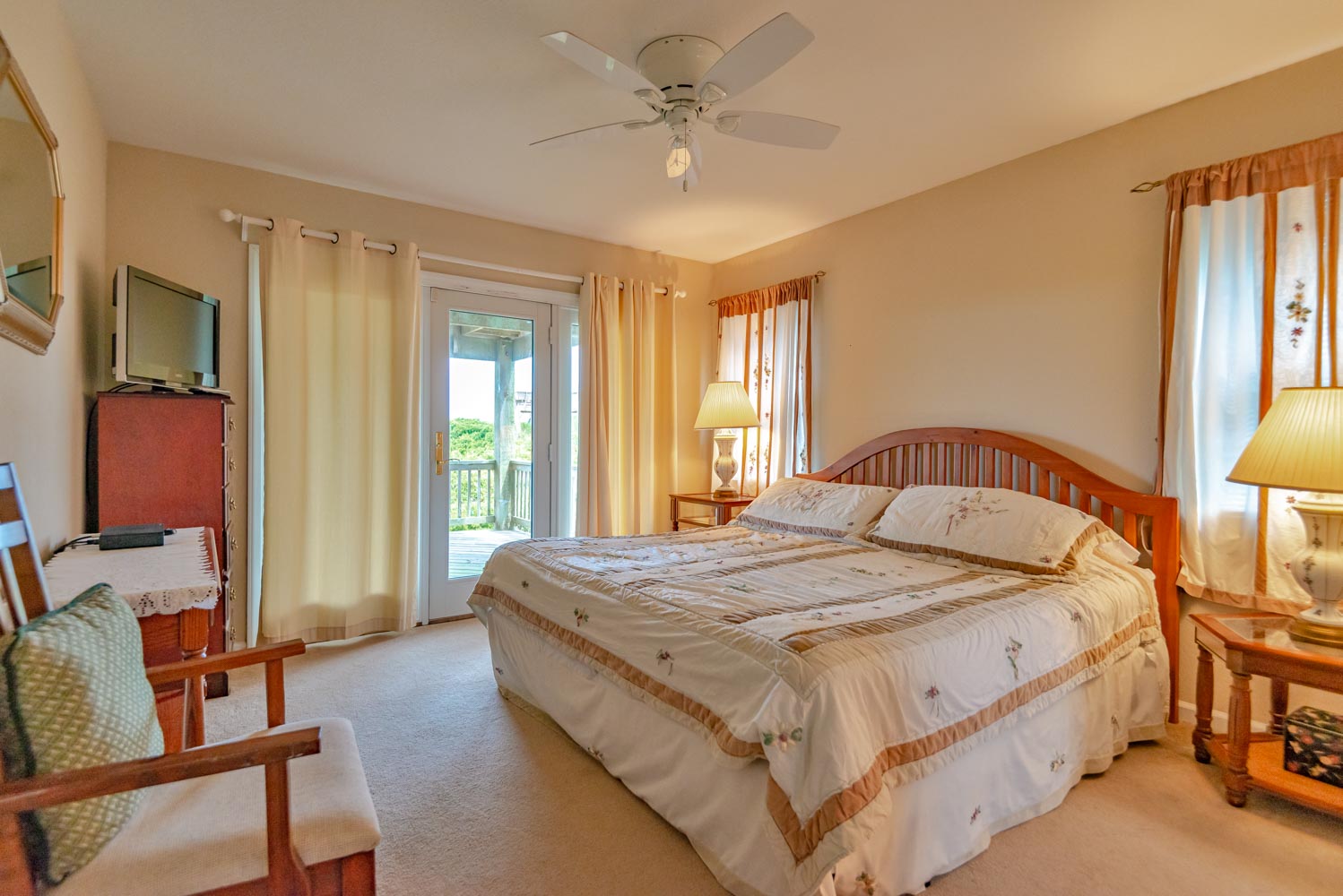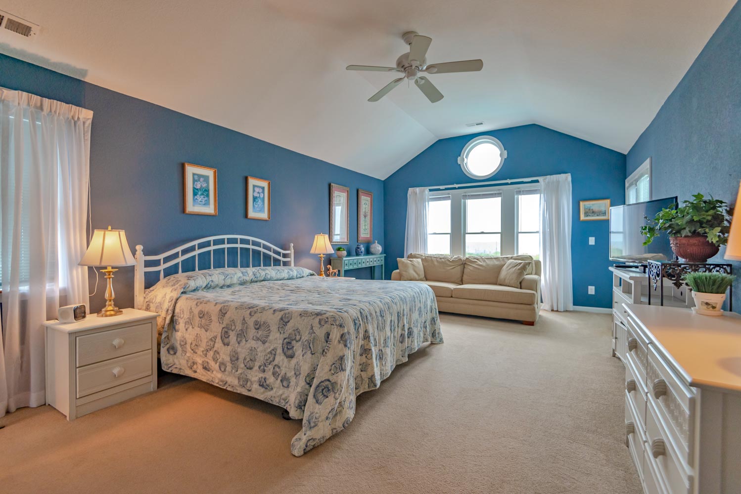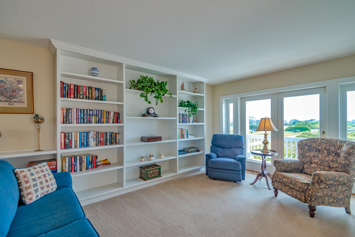 Mid Level: Large Den w/Flat Panel TV, Covered Deck, Ocean Views, 3 Bedrooms (Private Suite w/King, TV, Full Bath; 1 w/King, TV; 1 w/Queen), & Full Hall Bath.