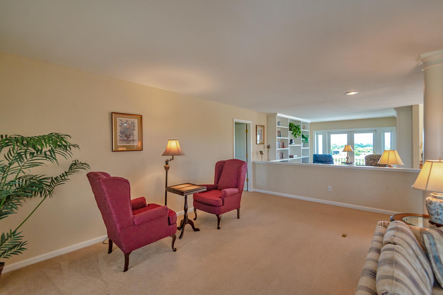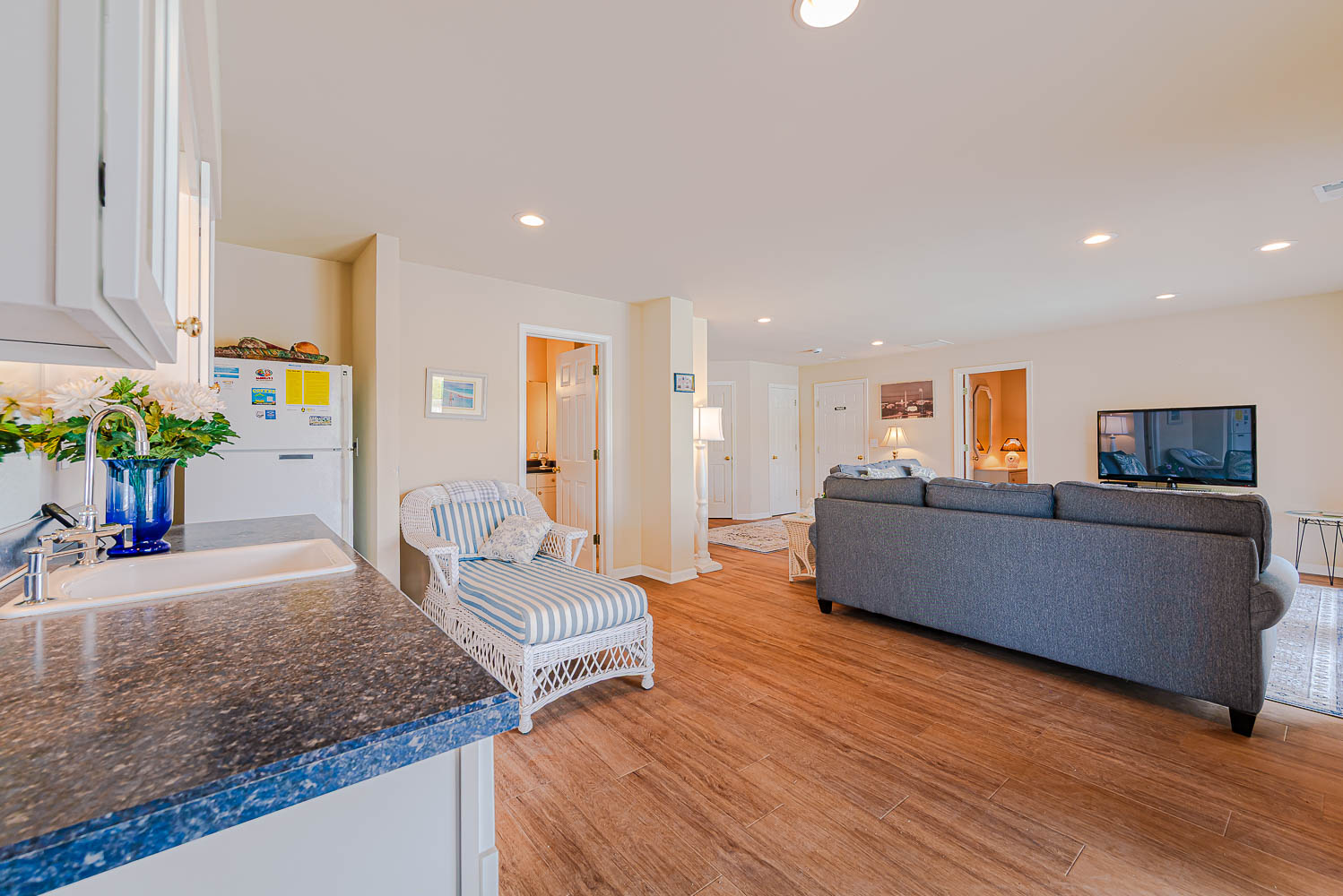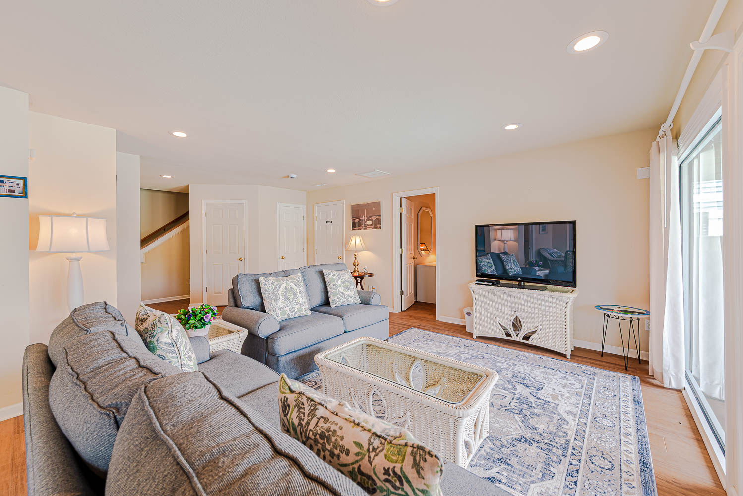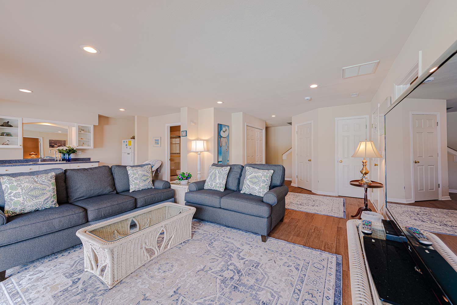 Mid Level: Large Den w/Flat Panel TV, Covered Deck, Ocean Views, 3 Bedrooms (Private Suite w/King, TV, Full Bath; 1 w/King, TV; 1 w/Queen), & Full Hall Bath.