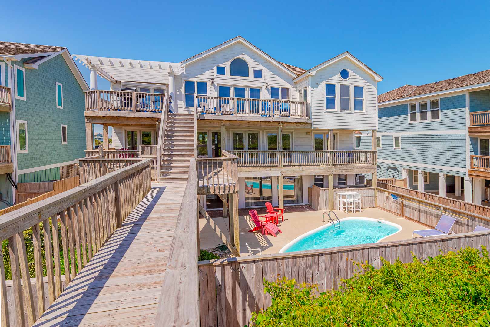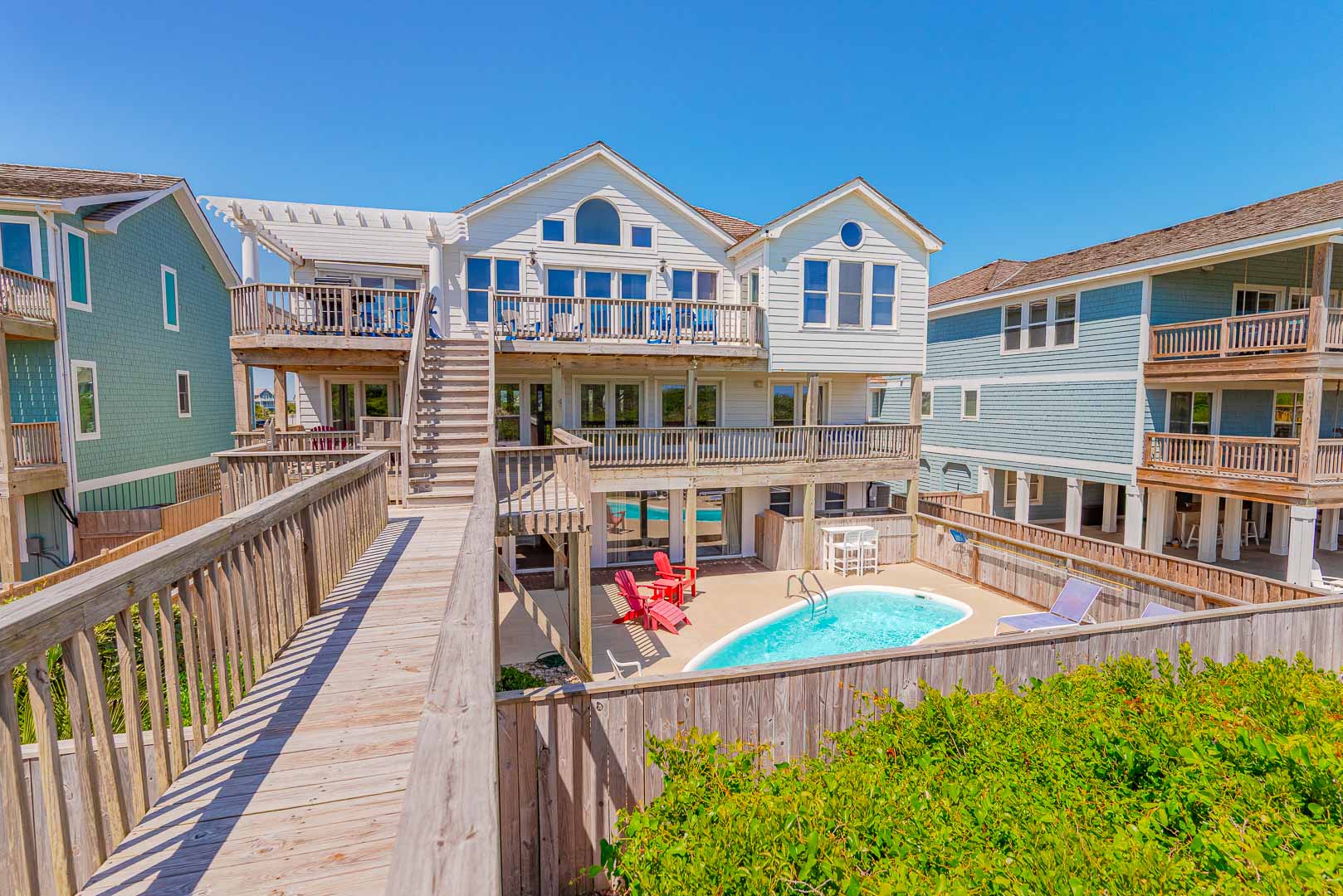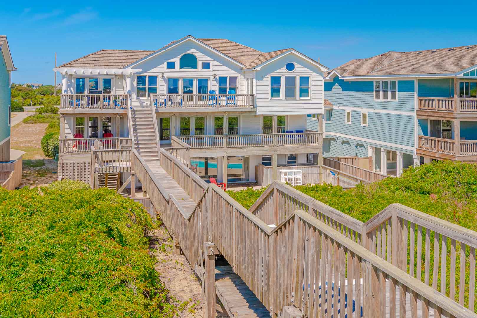 Ground Level: Parking for 5 Cars, Covered Entry, Den w/TV & Large Windows that Provide Great Views of Pool Area, Wet Bar, Full Size Refrigerator, Bedroom w/King, Full Bath, Laundry, Access to Pool Patio, Private 12x24 Swimming Pool - Open Seasonally, Double Enclosed Outside Shower, & Walkway to Dune Top Deck w/Sand Path to the Beach.