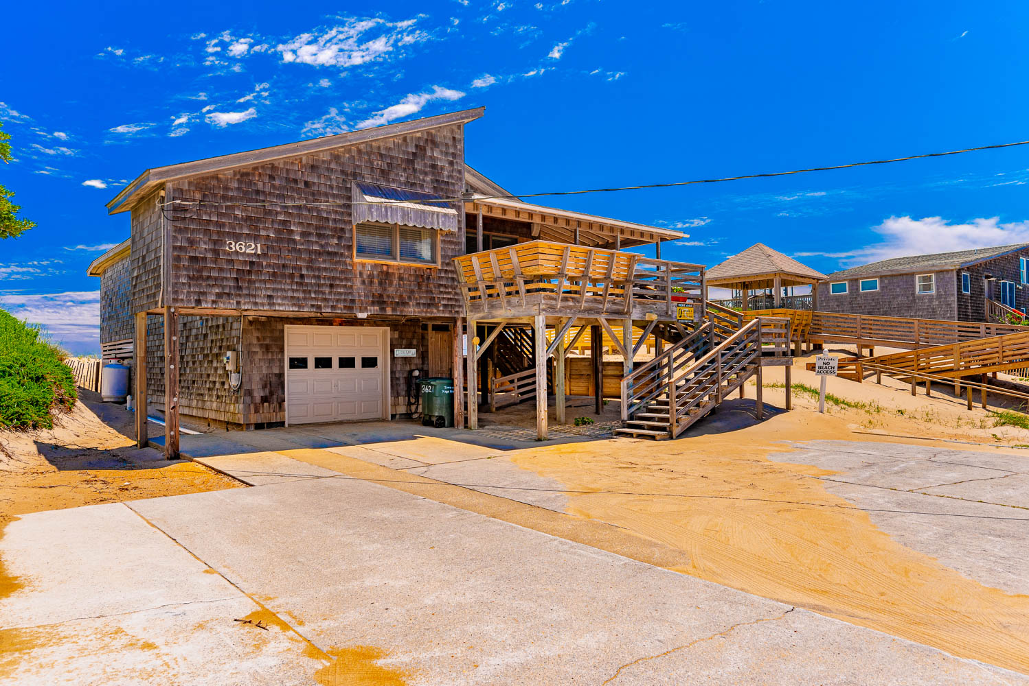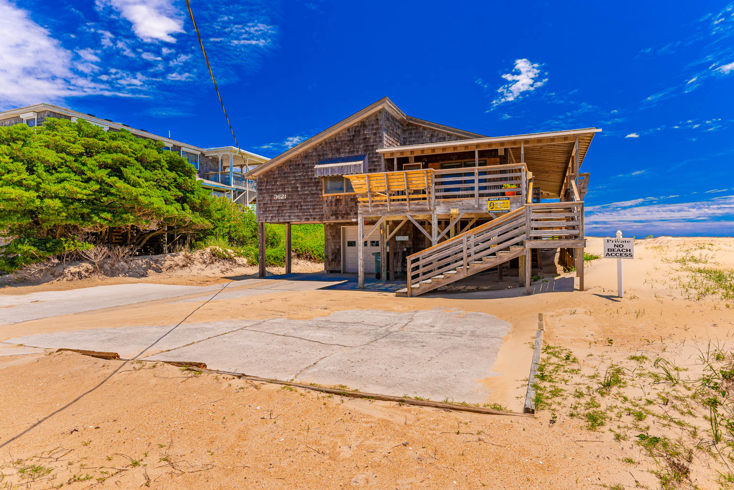 Ground Level: Parking for 3 Cars, Steps to Entry, Enclosed Outside Shower, & Charcoal Grill.