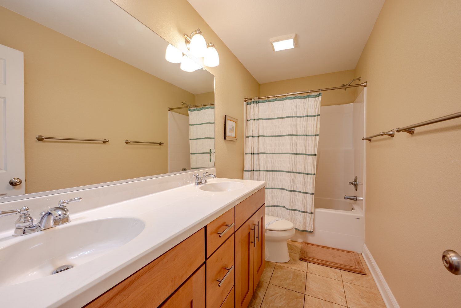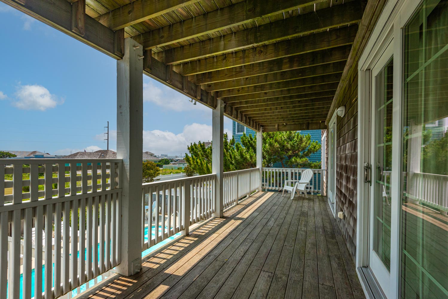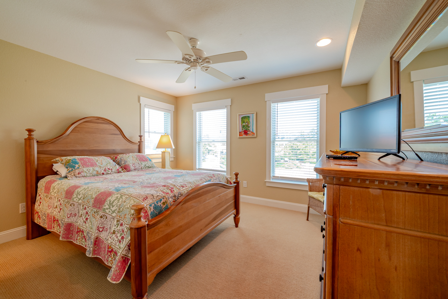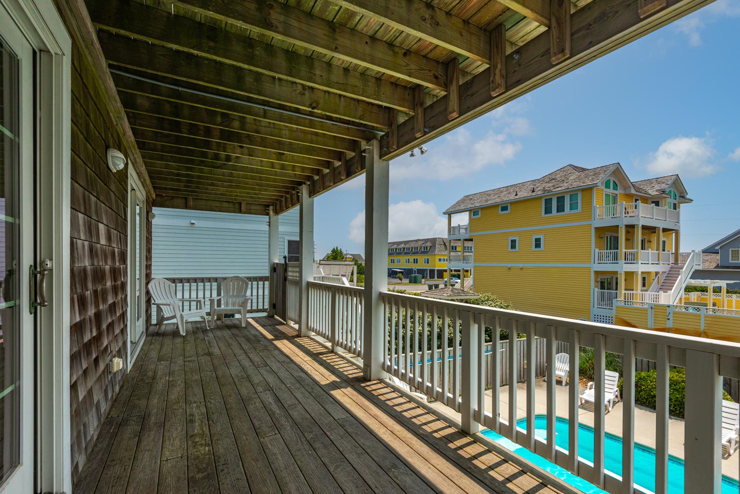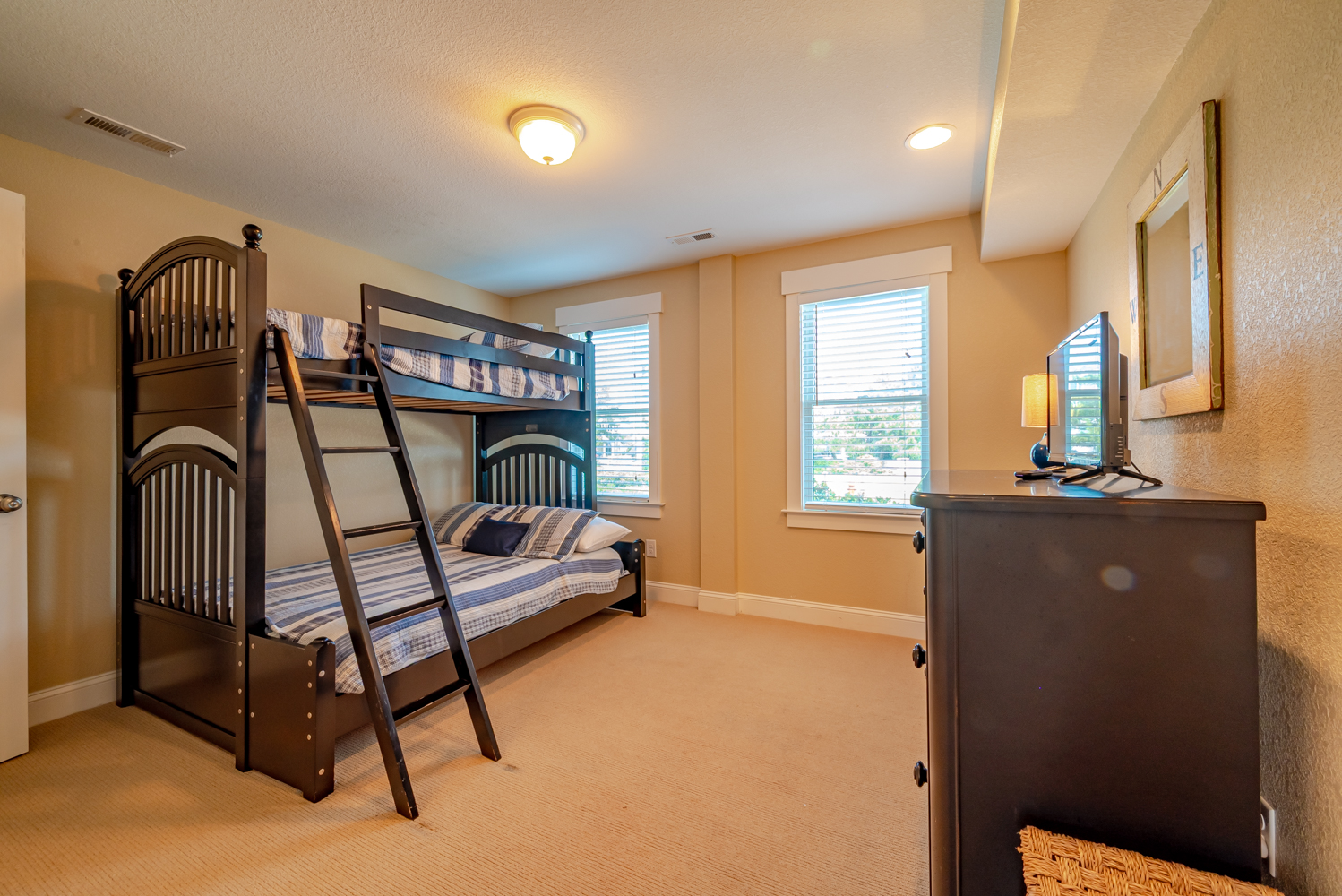 Mid Level: Den w/TV, 4 Bedrooms (Private Suite w/Queen, TV, Full Bath w/Walk-In Shower; Private Suite w/Queen, TV, Full Bath w/Tub/Shower; 1 w/King; 1 w/2 Singles), Shared Full Hall Bath w/Tub/Shower, Front Covered Deck, & Back Covered Deck Overlooking Pool Area.