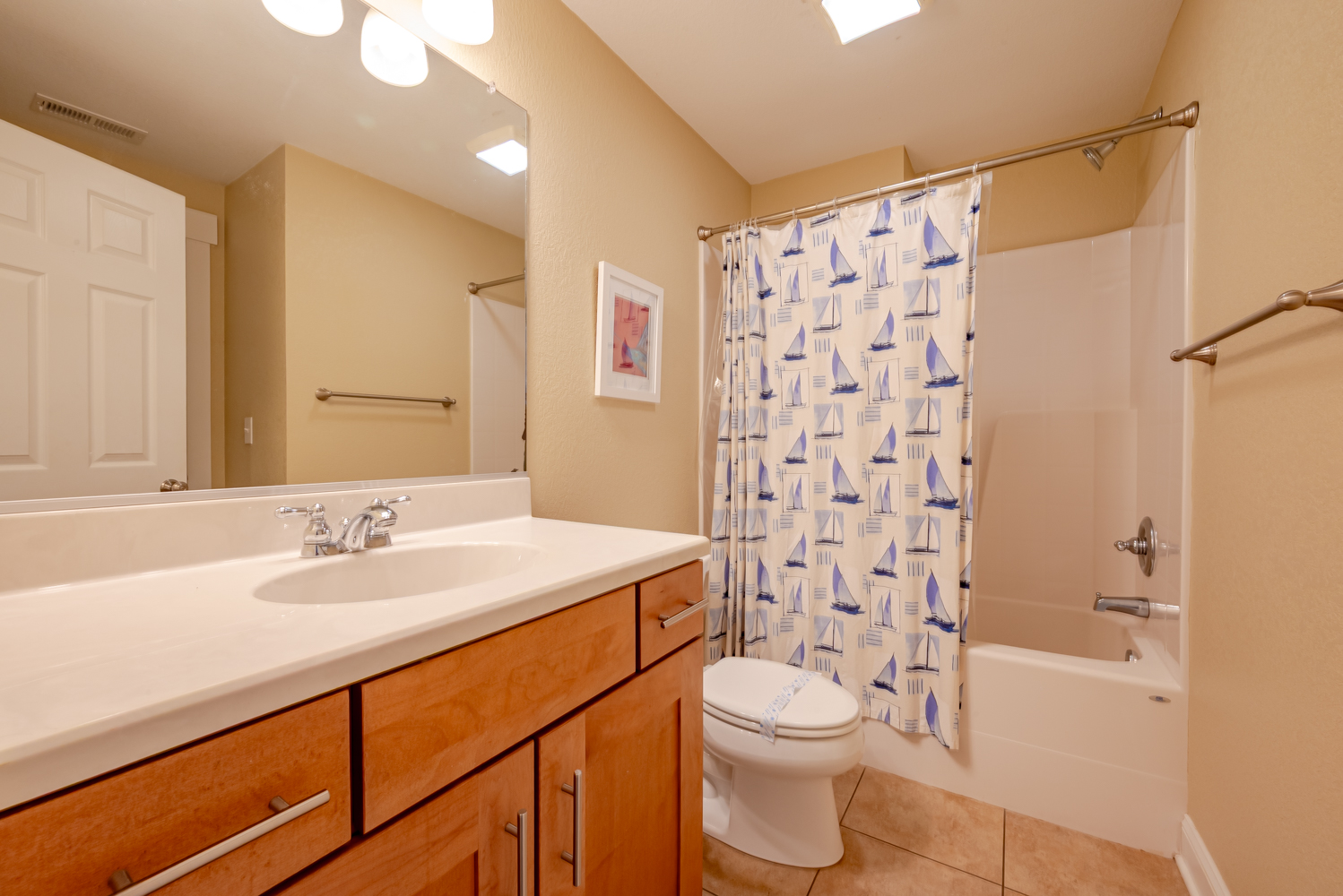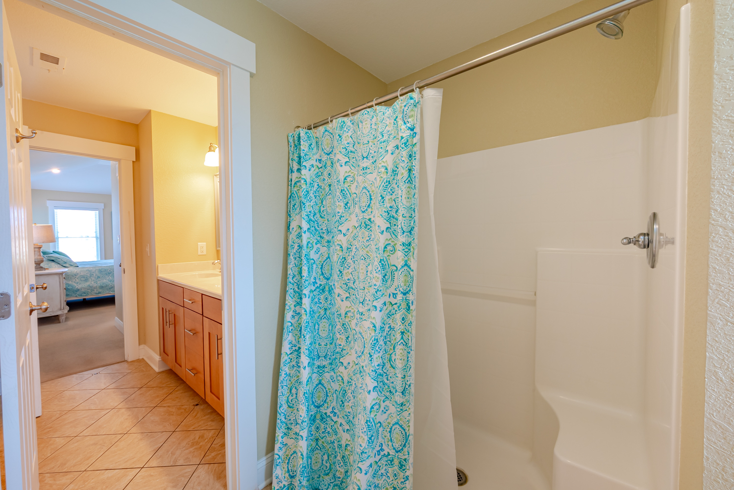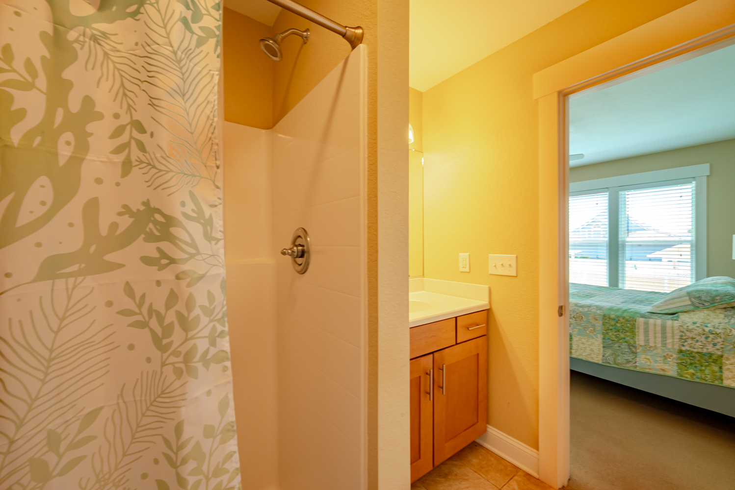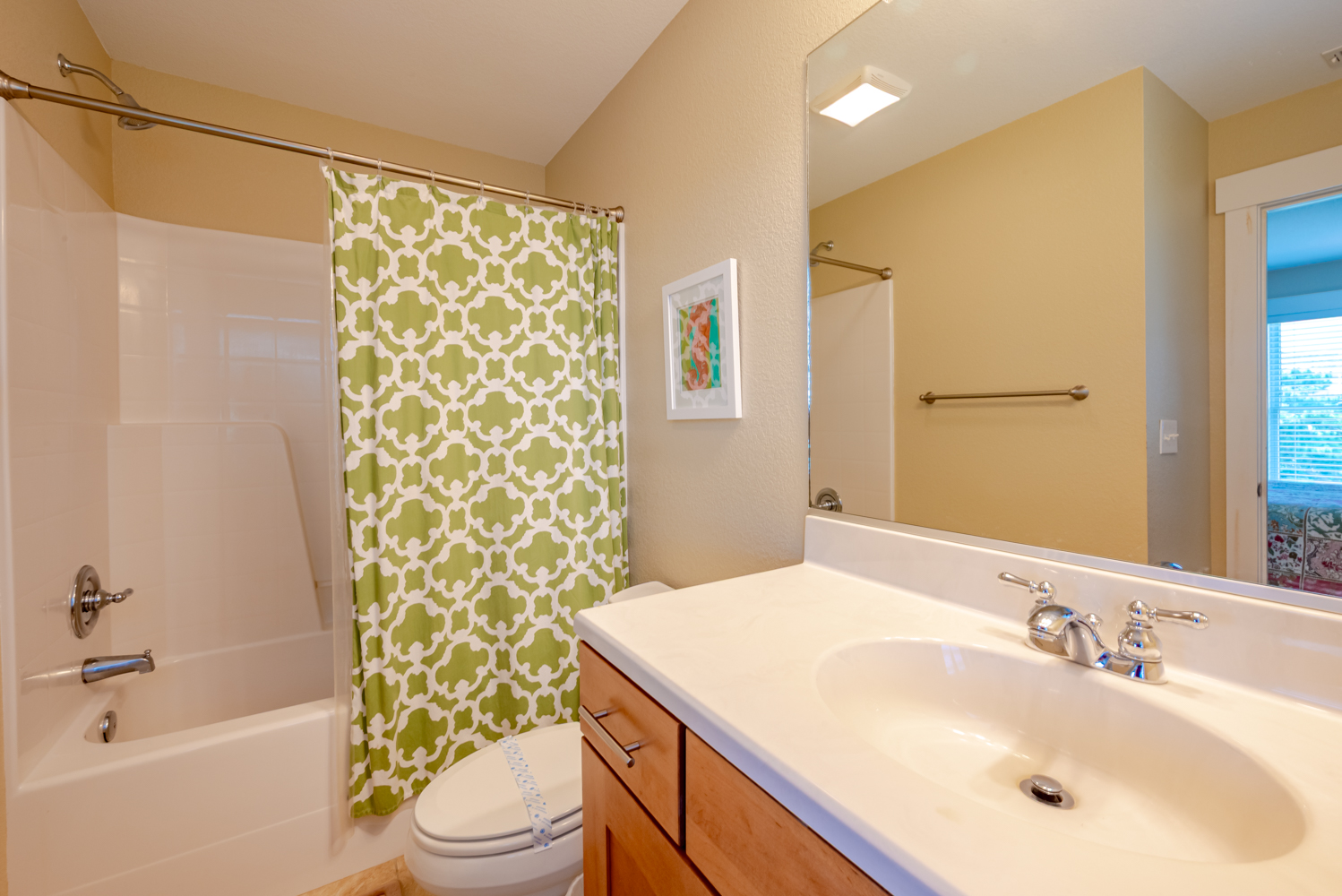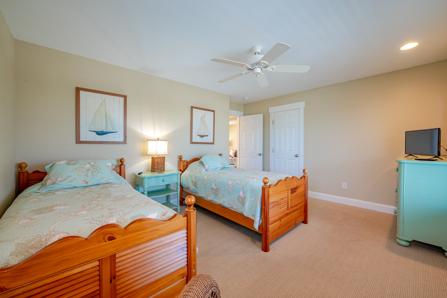 Mid Level: Den w/TV, 4 Bedrooms (Private Suite w/Queen, TV, Full Bath w/Walk-In Shower; Private Suite w/Queen, TV, Full Bath w/Tub/Shower; 1 w/King; 1 w/2 Singles), Shared Full Hall Bath w/Tub/Shower, Front Covered Deck, & Back Covered Deck Overlooking Pool Area.