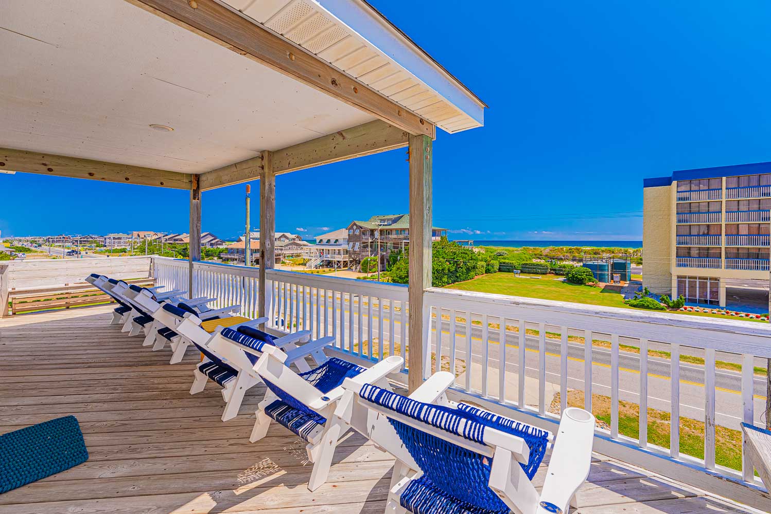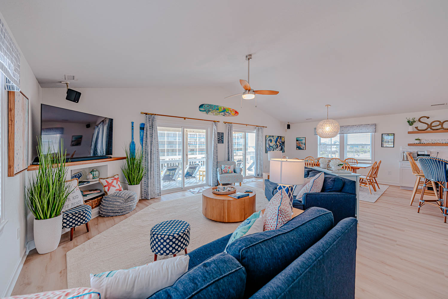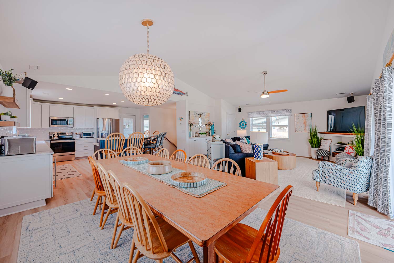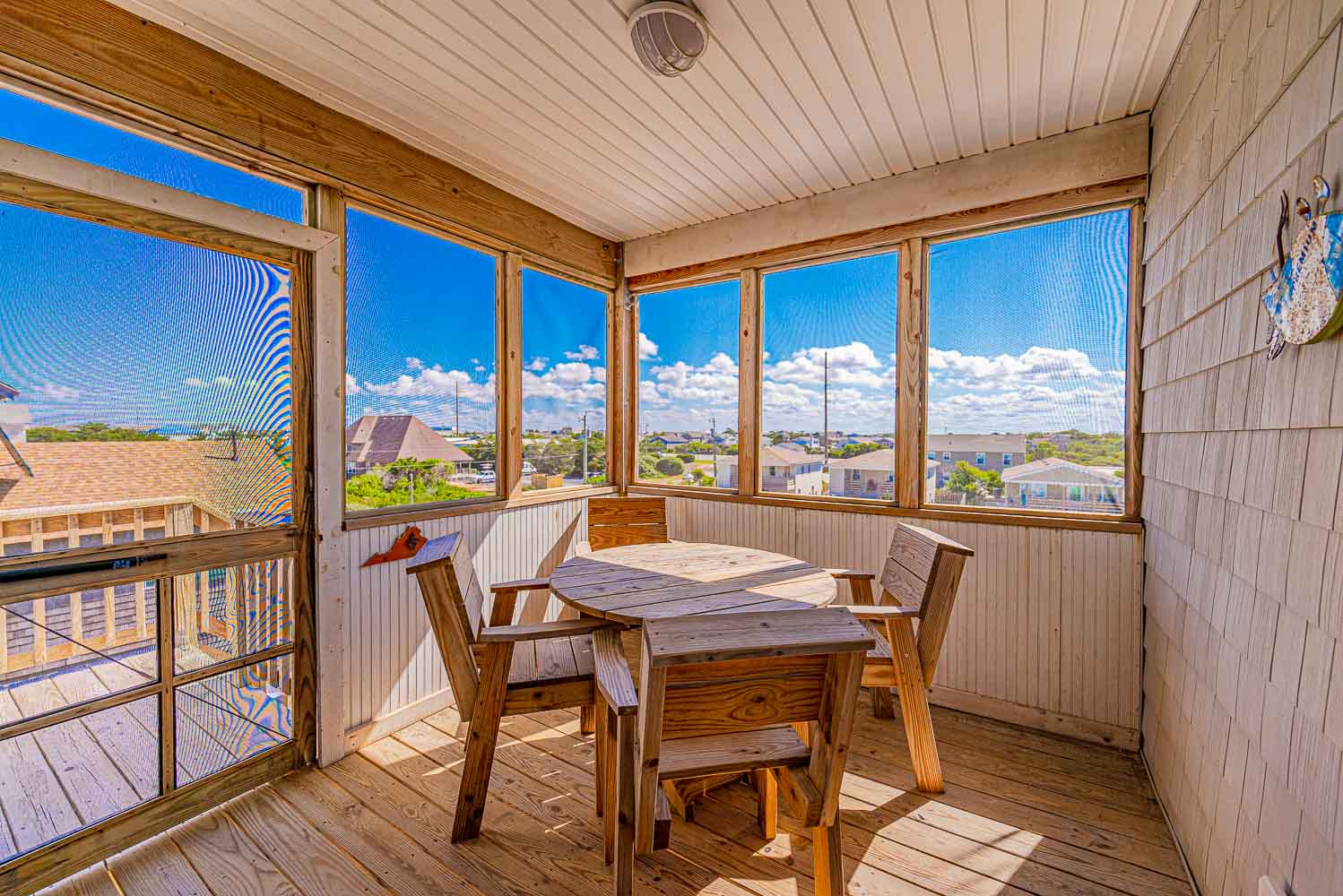 Top Level: Living Area w/Large TV, Dining Area w/Seating for Ten (10), Kitchen Area w/Bar Seating for Four (4), Beautiful Wood Floors, Half Bath, Private Suite w/King, TV, Full Bath w/Walk-In Shower; Screen Porch w/Table & Chairs, Covered Deck & Sun Deck w/Deck Furniture & Horizon Ocean Views.
