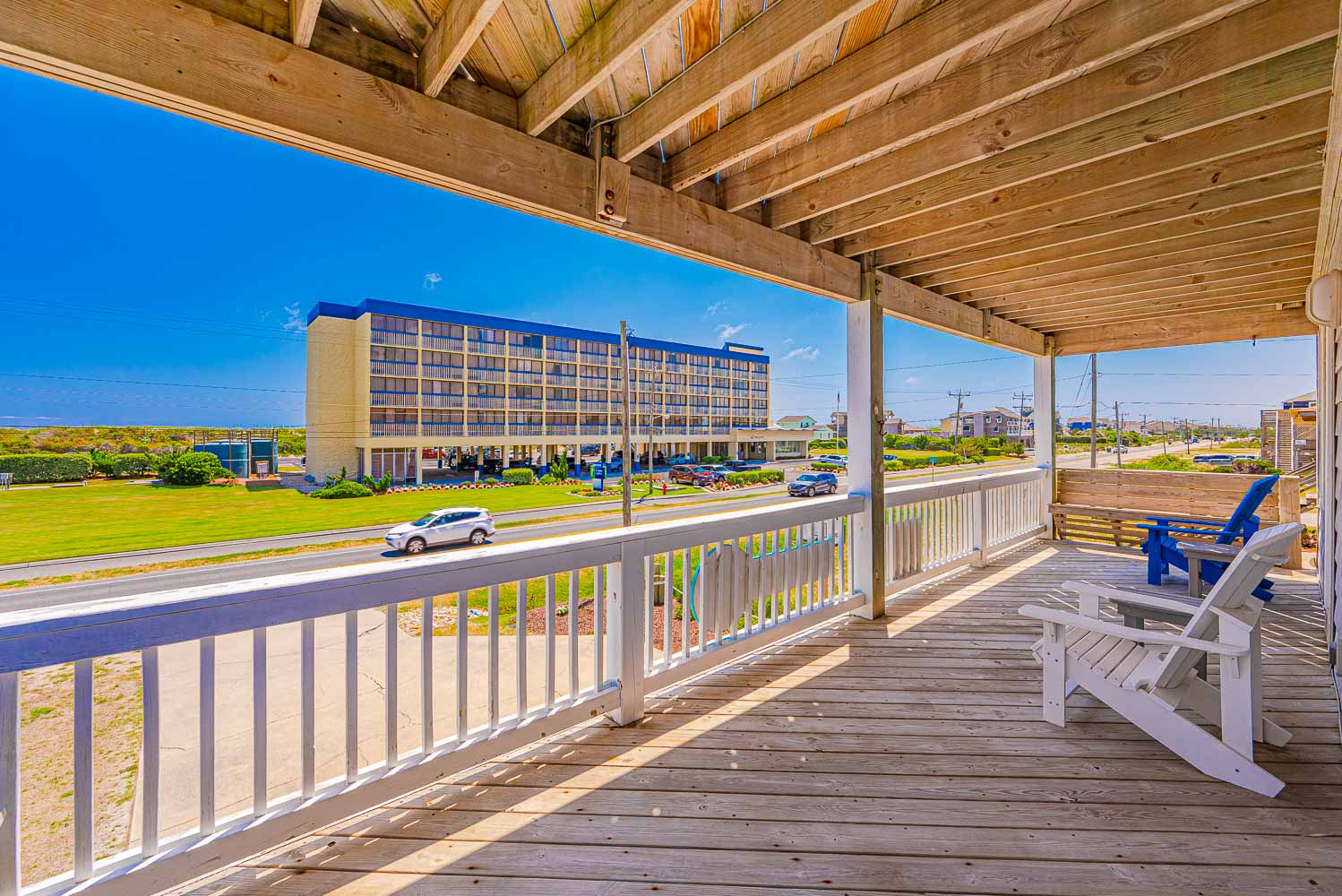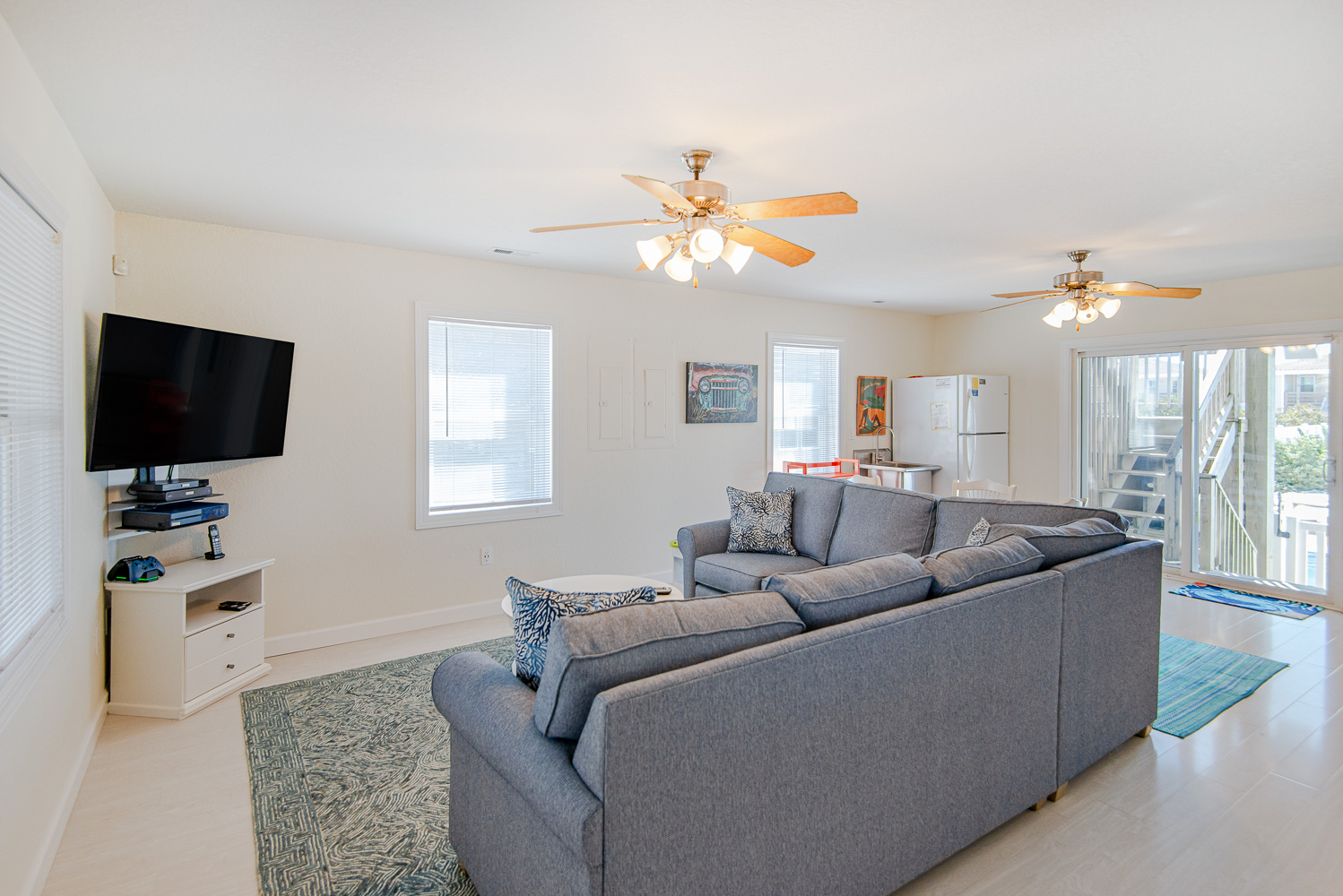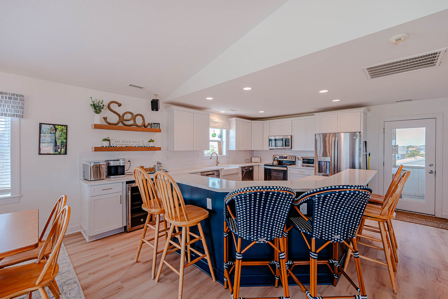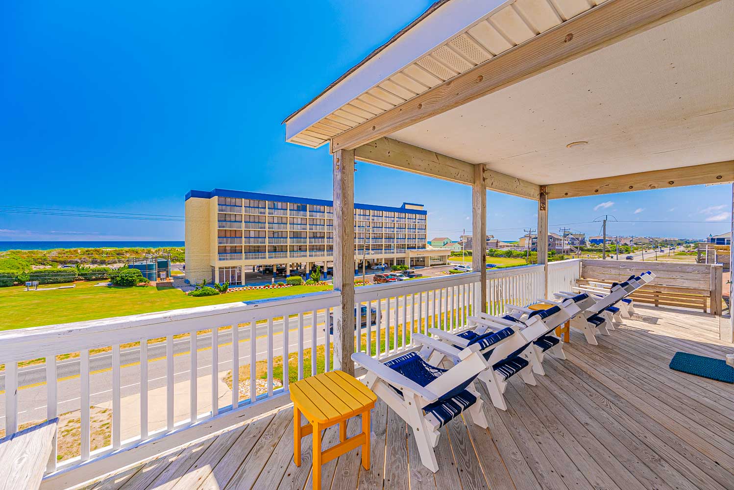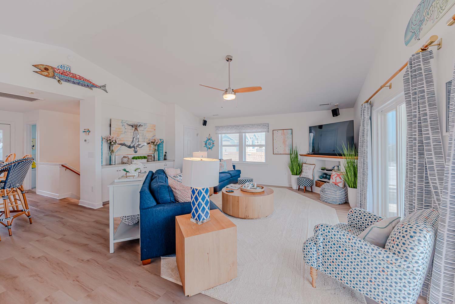 Top Level: Living Area w/Large TV, Dining Area w/Seating for Ten (10), Kitchen Area w/Bar Seating for Four (4), Beautiful Wood Floors, Half Bath, Private Suite w/King, TV, Full Bath w/Walk-In Shower; Screen Porch w/Table & Chairs, Covered Deck & Sun Deck w/Deck Furniture & Horizon Ocean Views.