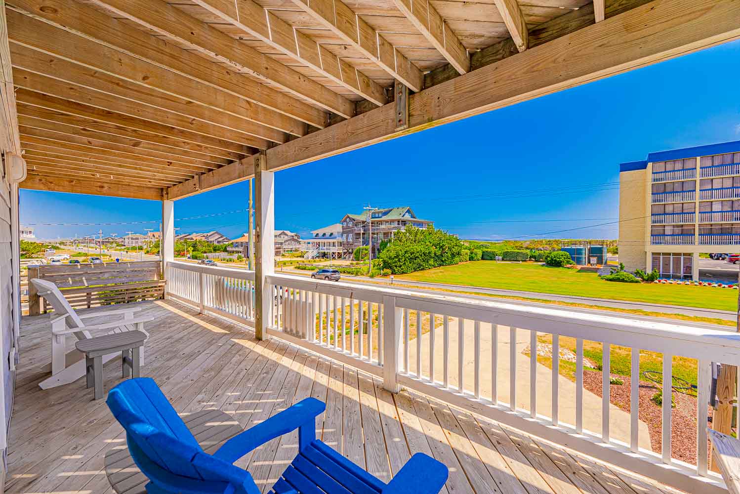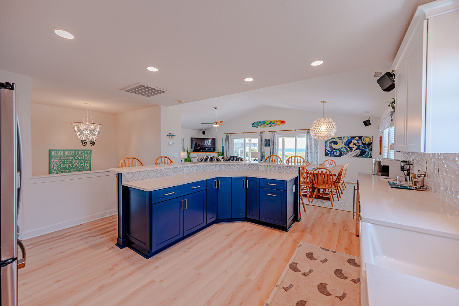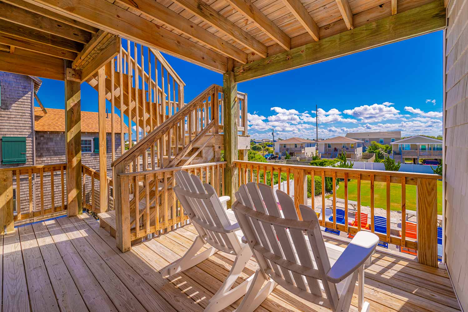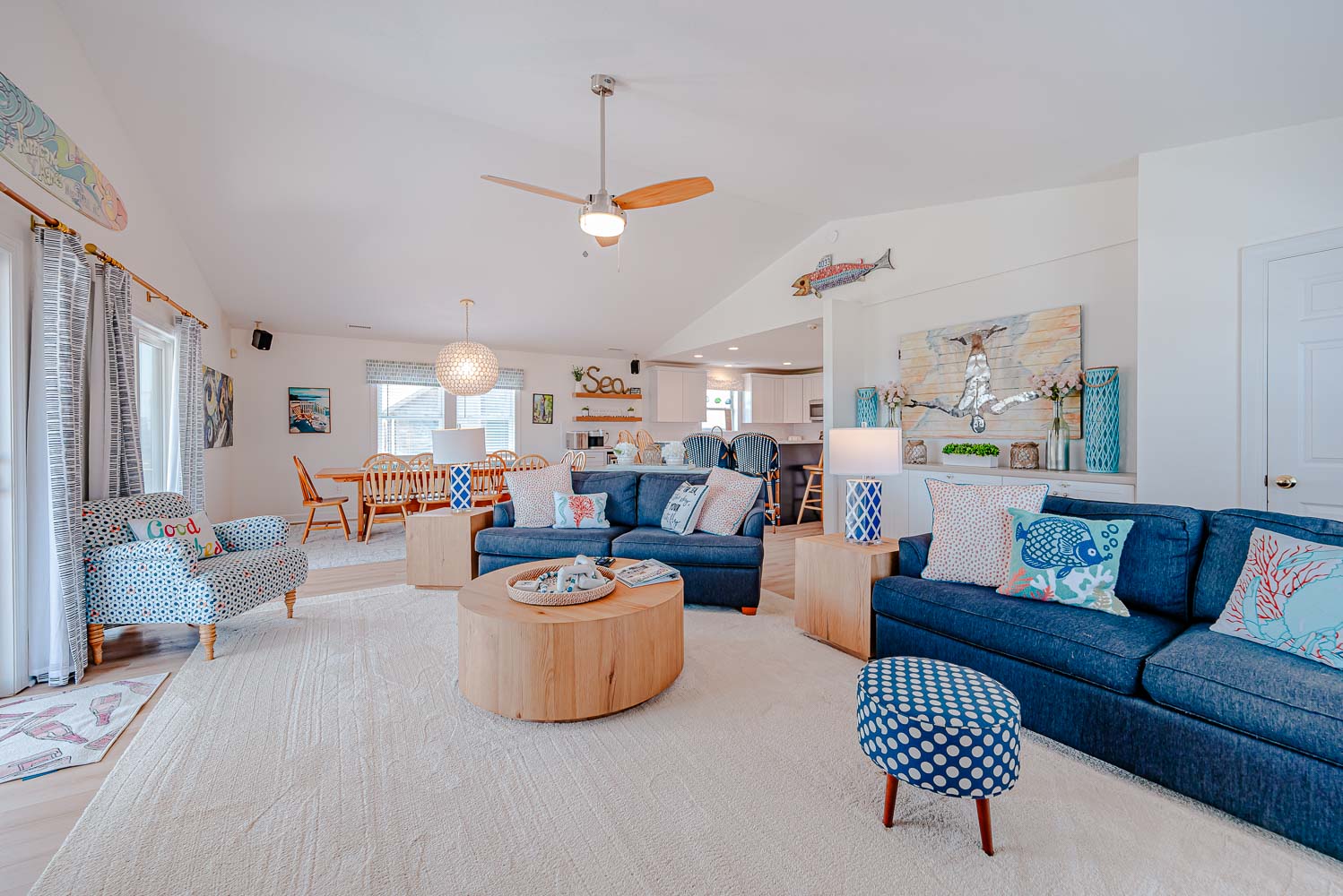 Top Level: Living Area w/Large TV, Dining Area w/Seating for Ten (10), Kitchen Area w/Bar Seating for Four (4), Beautiful Wood Floors, Half Bath, Private Suite w/King, TV, Full Bath w/Walk-In Shower; Screen Porch w/Table & Chairs, Covered Deck & Sun Deck w/Deck Furniture & Horizon Ocean Views.
