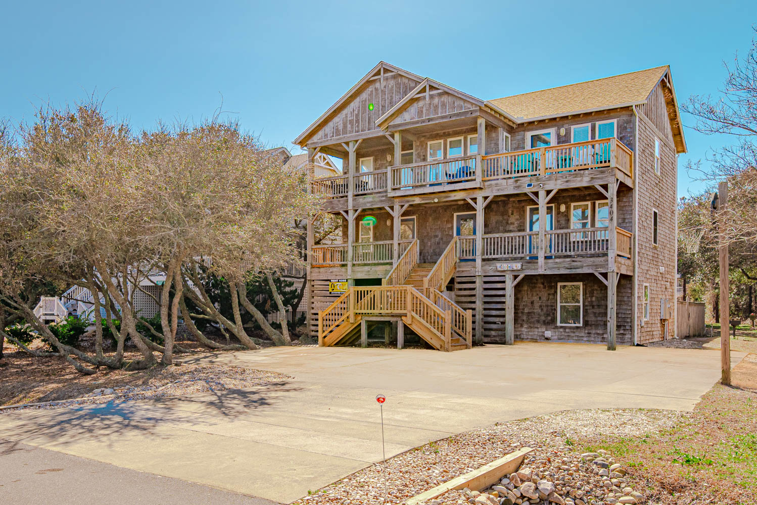 Ground Level: Parking for 5 Cars, Covered Entry, Rec. Room w/Air Hockey, Foosball Table, Large TV, Wet Bar w/Full Size Refrigerator, 3 Bedrooms (Private Suite w/King, TV, Full Bath w/Tub/Shower; 1 w/Duo Bunk, TV; 1 w/Bunk Set, TV), Full Hall Bath w/Tub/Shower; Access to Private Swimming Pool - Open Seasonally, Hot Tub, & Enclosed Outside Shower.