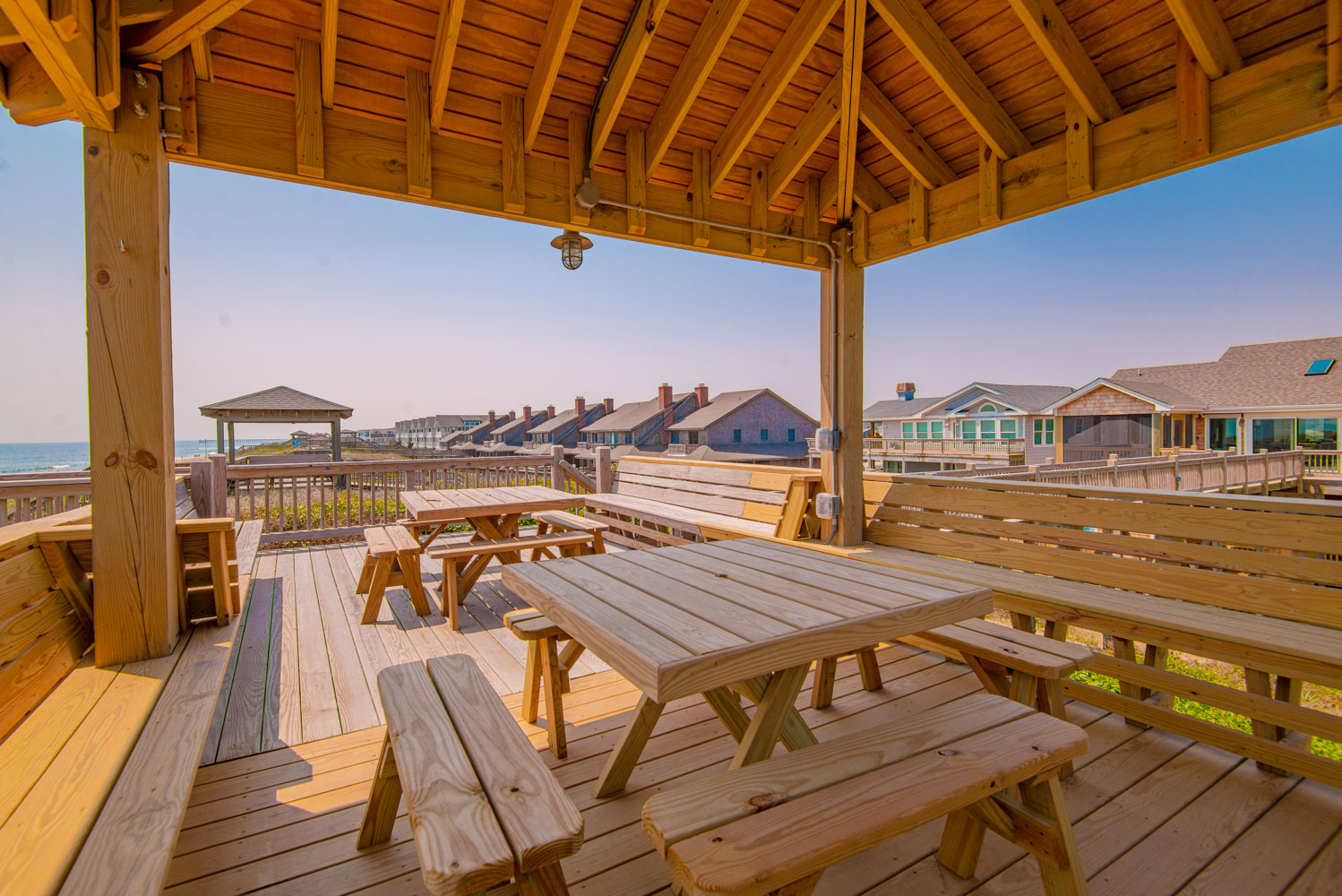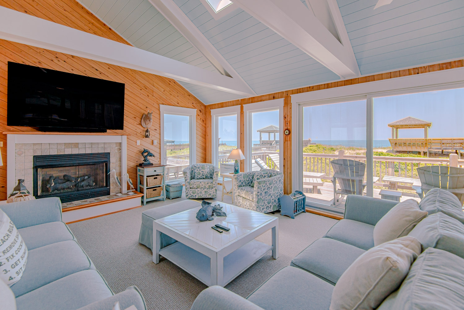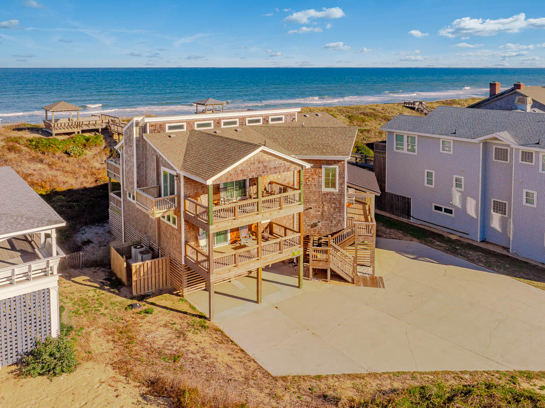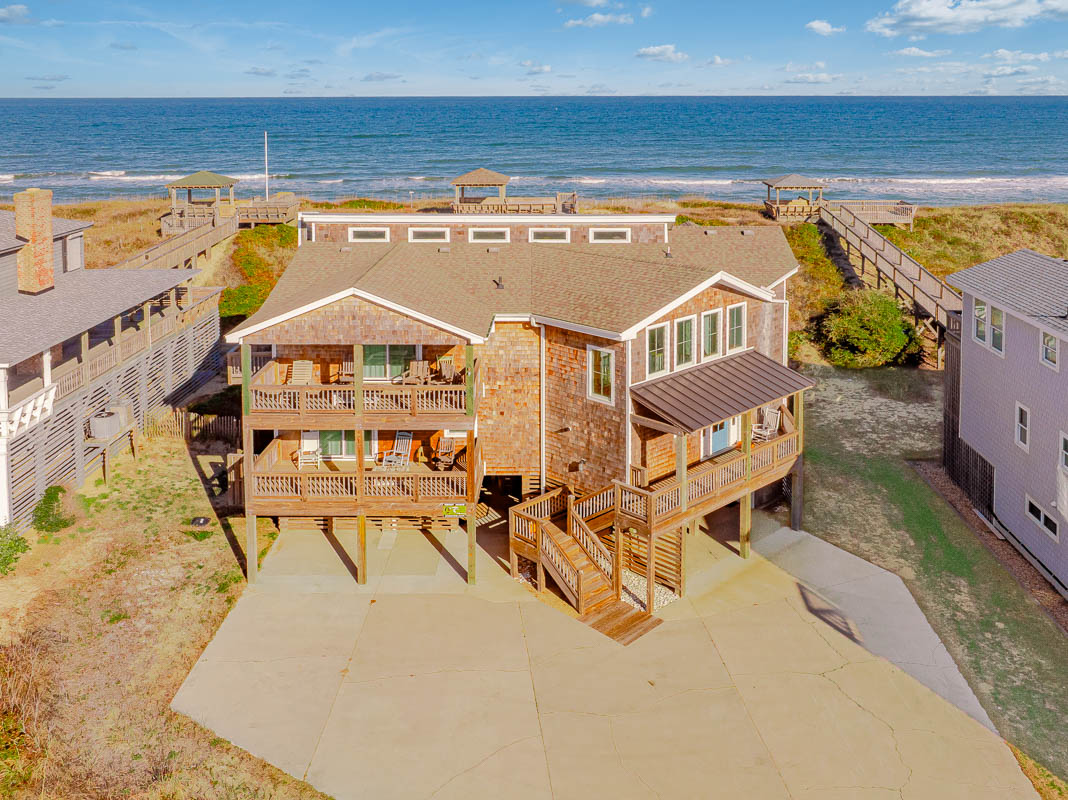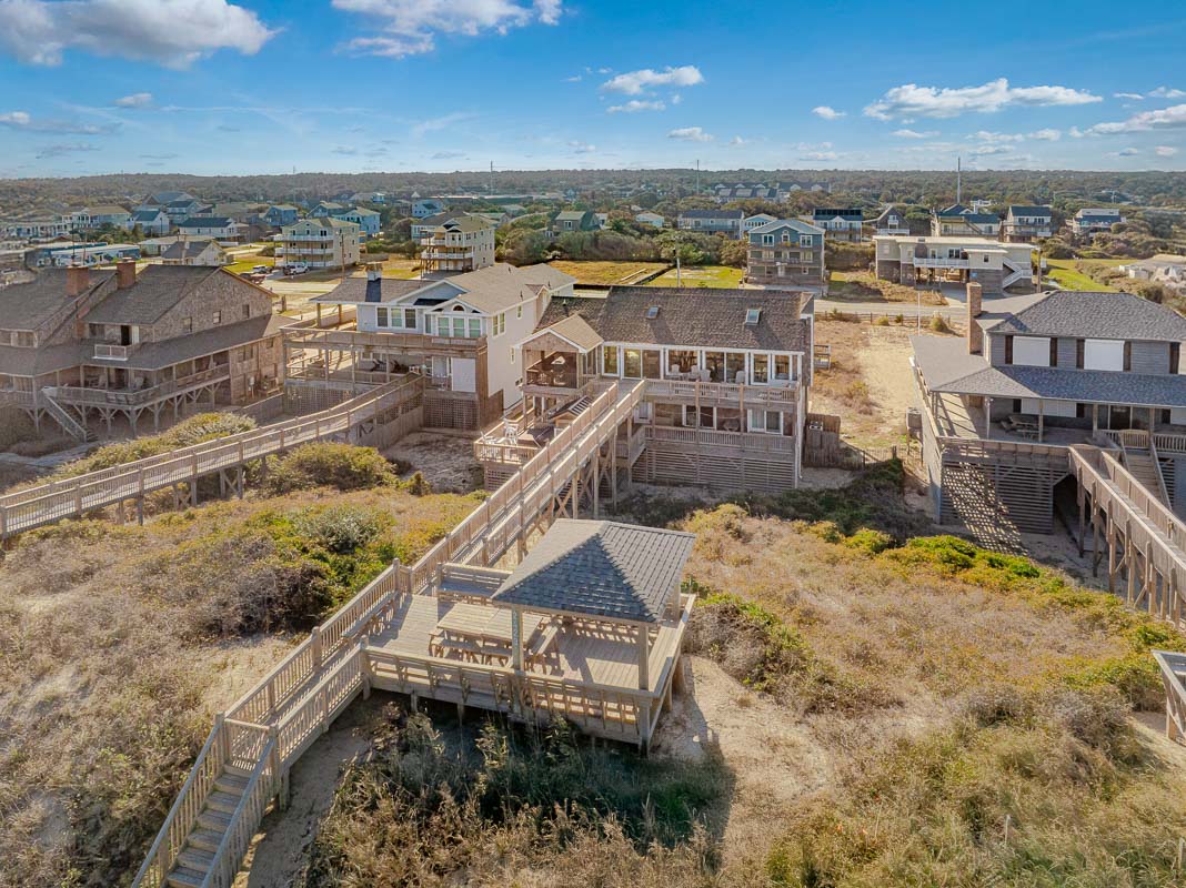 Top Level: Great Room, Magnificent Ocean Views, Large Flat Panel TV, Gas Fireplace, Game Table; Large Dining Area, 2 Seating Areas, Fully Equipped Kitchen, Griddle, Crock Pot, Gas Range, Extended Bar/Counter; Seating Overlooking Vast Windows on the Front, Powder Room, Private Suite w/King, TV, Full Bath Walk-In Shower, Access to Sunset Deck/Balcony; Oceanfront Sun Deck w/Screen Porch, Deck Furniture, Private Boardwalk to Partially Covered Dune Top Deck w/Lights, Built-In Benches, 2 Picnic Tables, Fantastic Ocean and Beach Views.